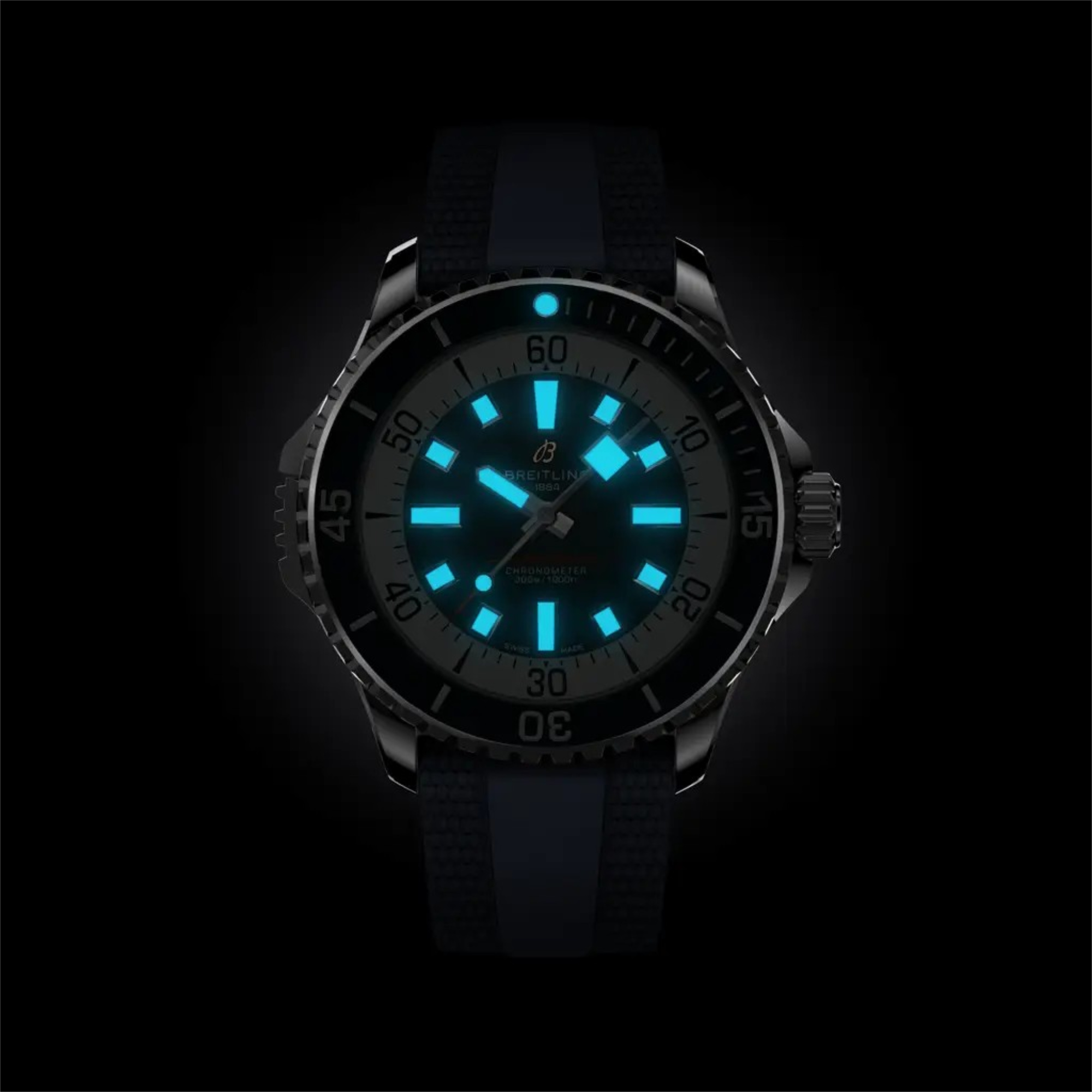 Ref. A17378E71C1S1 - Die neue Superocean sieht nicht nur gut aus, sondern ist auch ein technisches Meisterwerk. Sie ist bis 300 m (1000 ft) wasserdicht und verfügt über breite Zeiger und Indizes, die mit Super-LumiNova® beschichtet sind und eine außergewöhnlich gute Ablesbarkeit unter Wasser ermöglichen. Ihre kratzfeste Lünette mit Keramikeinlage verschleißt nicht und bleicht nicht aus. Aus Sicherheitsgründen ist die Lünette bei den meisten Größen nur einseitig drehbar; die bidirektionale Lünette der 46-mm-Uhr ist durch eine patentierte Arretierung gesichert. Darüber hinaus ist diese Uhr stoßfest sowie sand- und salzwasserbeständig. Für das automatische Breitling-Kaliber 17 gilt eine 2-jährige Garantie und das Uhr werk bietet ca. 38 Stunden Gangreserve.