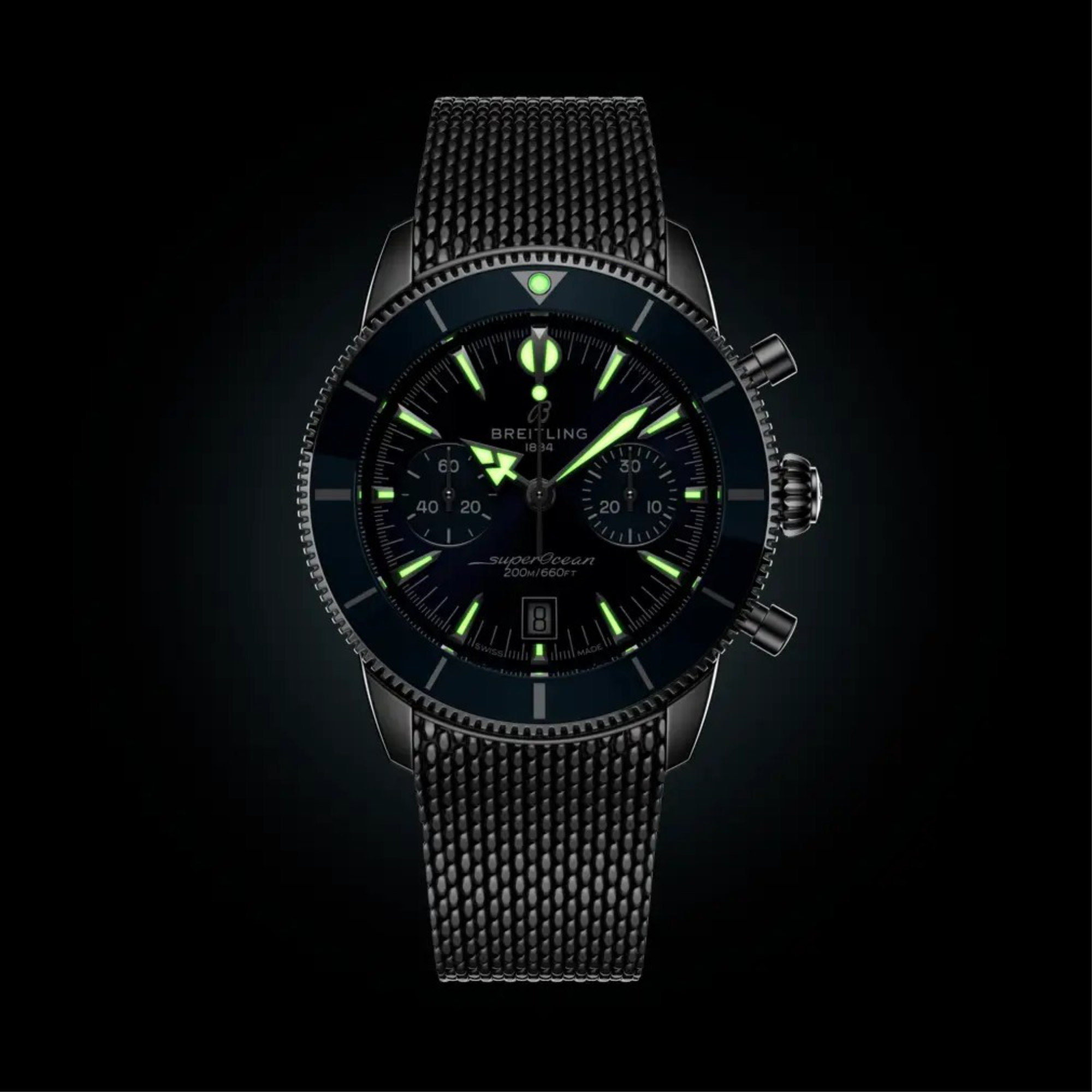 Auch heute noch ist diese Philosophie das Herzstück der Superocean Heritage. Die Seele der 50er Jahre, aber im neuen Kleid für die Gegenwart. Die neueste Superocean Heritage baut auf allem auf, was das Original unverwechselbar gemacht hat, und verfeinert es. Der Chronograph wird vom Breitling-Manufakturkaliber 01 angetrieben, dem branchenführenden Uhrwerk von Breitling. Eine Lünette mit Keramikeinlage bietet außergewöhnliche Kratzfestigkeit, während die integrierten Armbänder aus Mesh-Metall oder Mesh-Kautschuk eng am Gehäuse anliegen und mit Faltschließen für ein sauberes, wasserdichtes Finish gesichert werden. Ton-in-Ton-Hilfszifferblätter, ein diskretes Datumsfenster auf sechs Uhr und die originalen Signaturzeiger Pfeil für die Stunden, Speer für die Minuten – sorgen für Ablesbarkeit und Ausgewogenheit, über oder unter der Oberfläche.