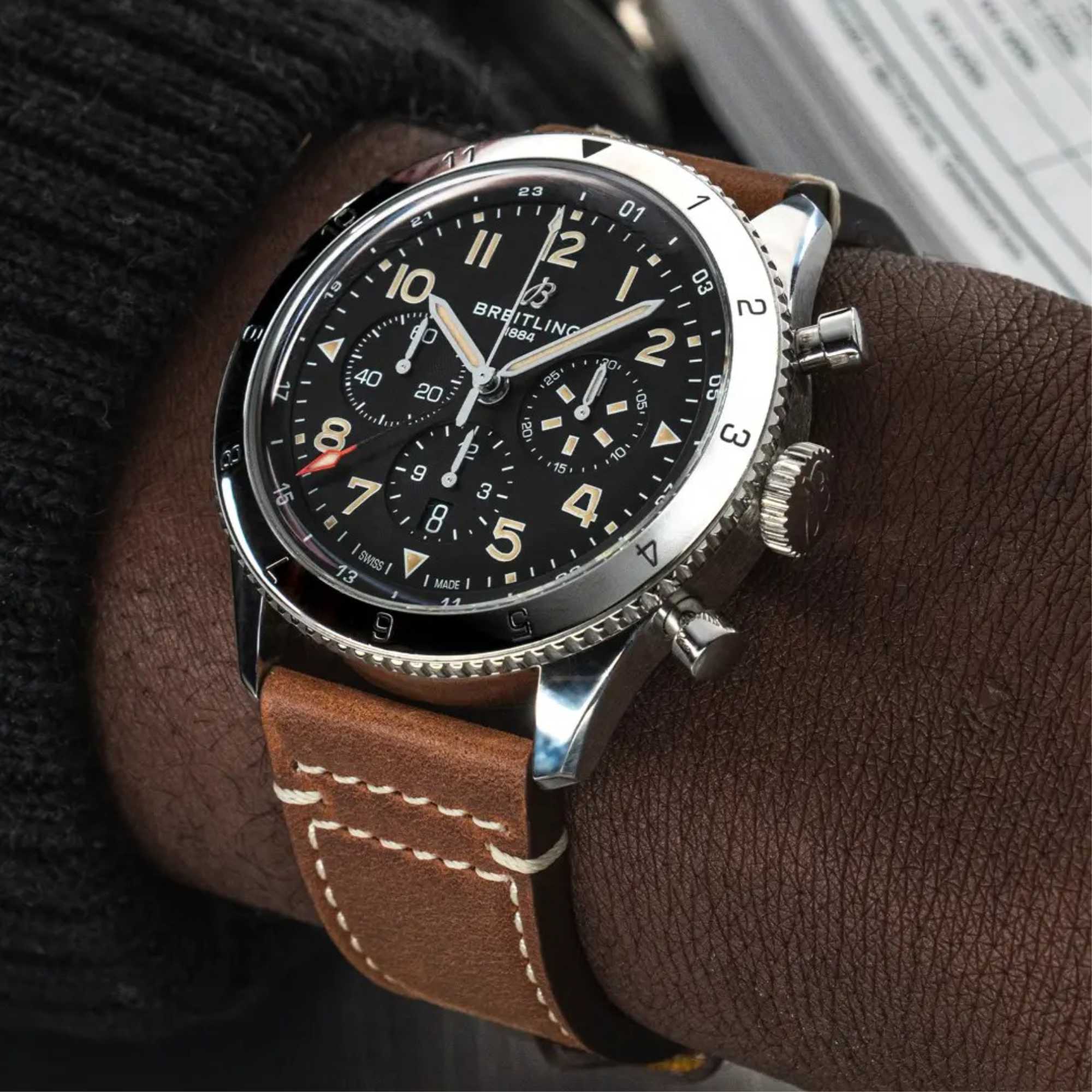 Diese wegweisende Fliegeruhr schuf den technischen Hintergrund für die heutige Super AVI, eine Kollektion, die von der Robustheit der berühmten frühen Flugzeuge inspiriert ist. Als echte Pilotenuhr, die dafür konzipiert wurde, den Herausforderungen eines Vintage-Cockpits standzuhalten, verfügt die Super AVI P-51 Mustang über grosse, hervorragend ablesbare arabische Ziffern auf dem Zifferblatt und der Lünette. Das robuste Gehäuse hat einen Durchmesser von 46 mm, die überdimensionierte Krone befindet sich an der 3-Uhr-Position. Die geriffelte Lünette sorgt für optimale Griffigkeit, während das Kalbslederarmband mit Ziernaht optisch an die klassischen Fliegerjacken erinnert. Piloten und andere Reisende werden die Möglichkeit schätzen, über die 24-Stunden-Markierung auf der Innenlünette und den GMT-Zeiger mit roter Spitze eine zweite Zeitzone anzuzeigen. Angetrieben wird die Super AVI von einem COSC-zertifizierten Breitling Manufakturkaliber B04, das eine Gangreserve von etwa 70 Stunden bietet.
