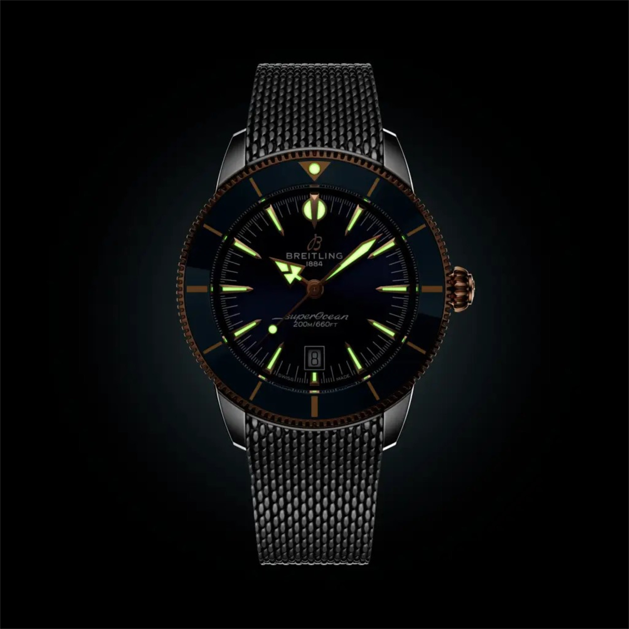 Auch heute noch ist diese Philosophie das Herzstück der Superocean Heritage. Die Seele der 50er Jahre, aber im neuen Kleid für die Gegenwart. Die neueste Superocean Heritage baut auf allem auf, was das Original unverwechselbar gemacht hat, und verfeinert es. Die Kollektion führt das Automatik-Uhrwerk B31 ein, Breitlings erstes exklusives Manufaktur-Kaliber mit drei Zeigern. Eine Lünette mit Keramikeinlage bietet außergewöhnliche Kratzfestigkeit, während die integrierten Armbänder aus Mesh-Metall oder Mesh-Kautschuk eng am Gehäuse anliegen und mit Faltschließen für ein sauberes, wasserdichtes Finish gesichert werden. Ein diskretes Datumsfenster auf sechs Uhr und die originalen Signaturzeiger– Pfeil für die Stunden, Speer für die Minuten – sorgen für Ablesbarkeit und Ausgewogenheit, über oder unter der Oberfläche.