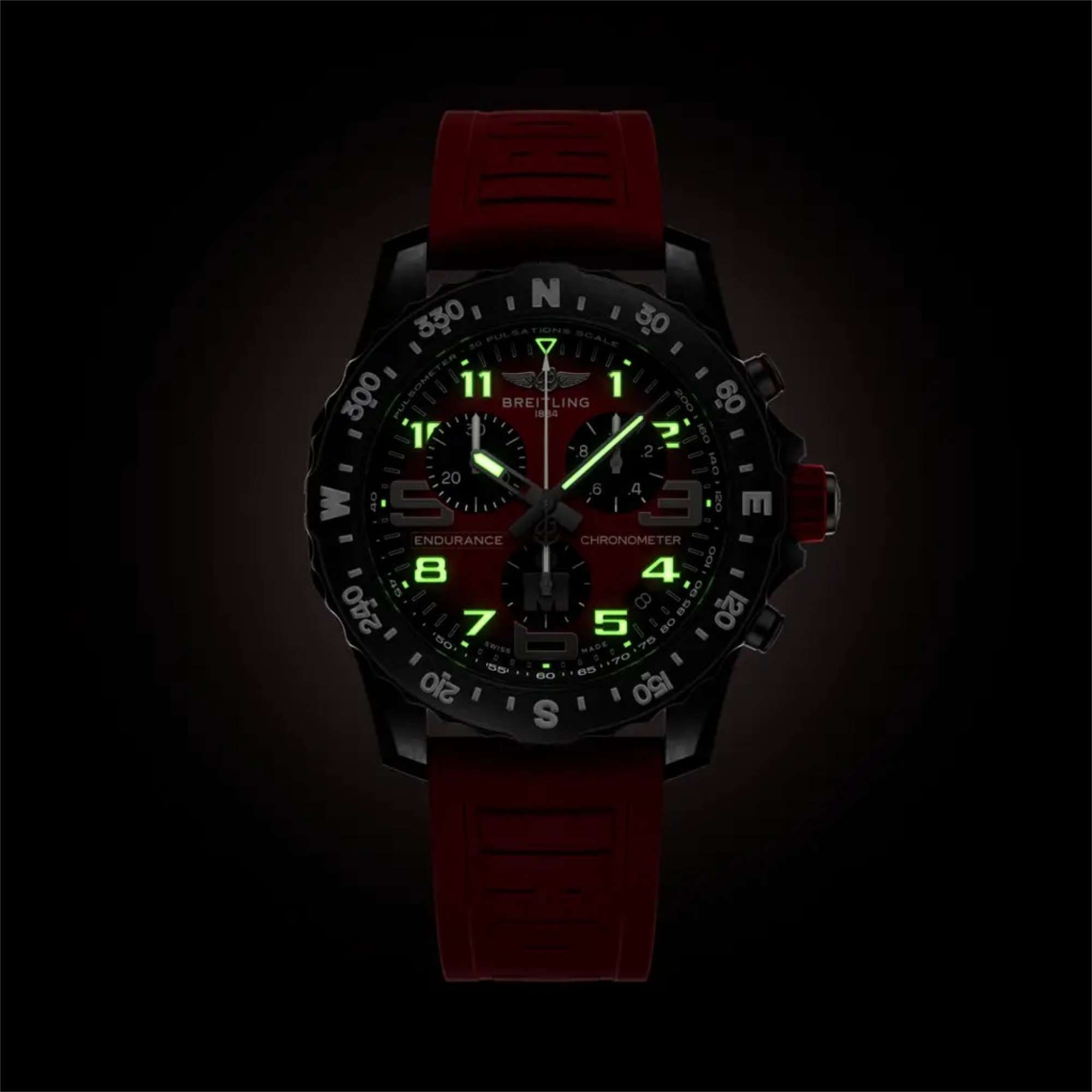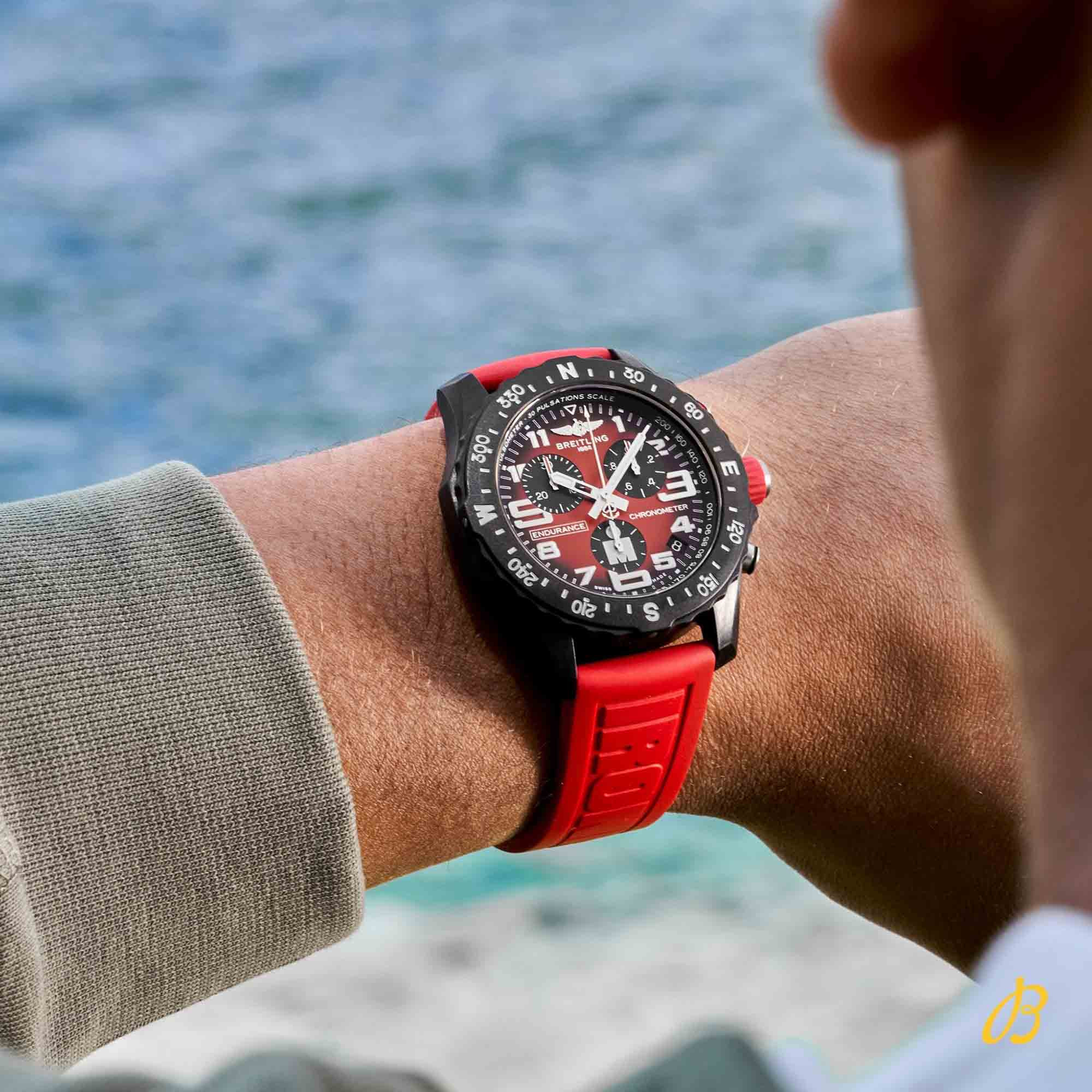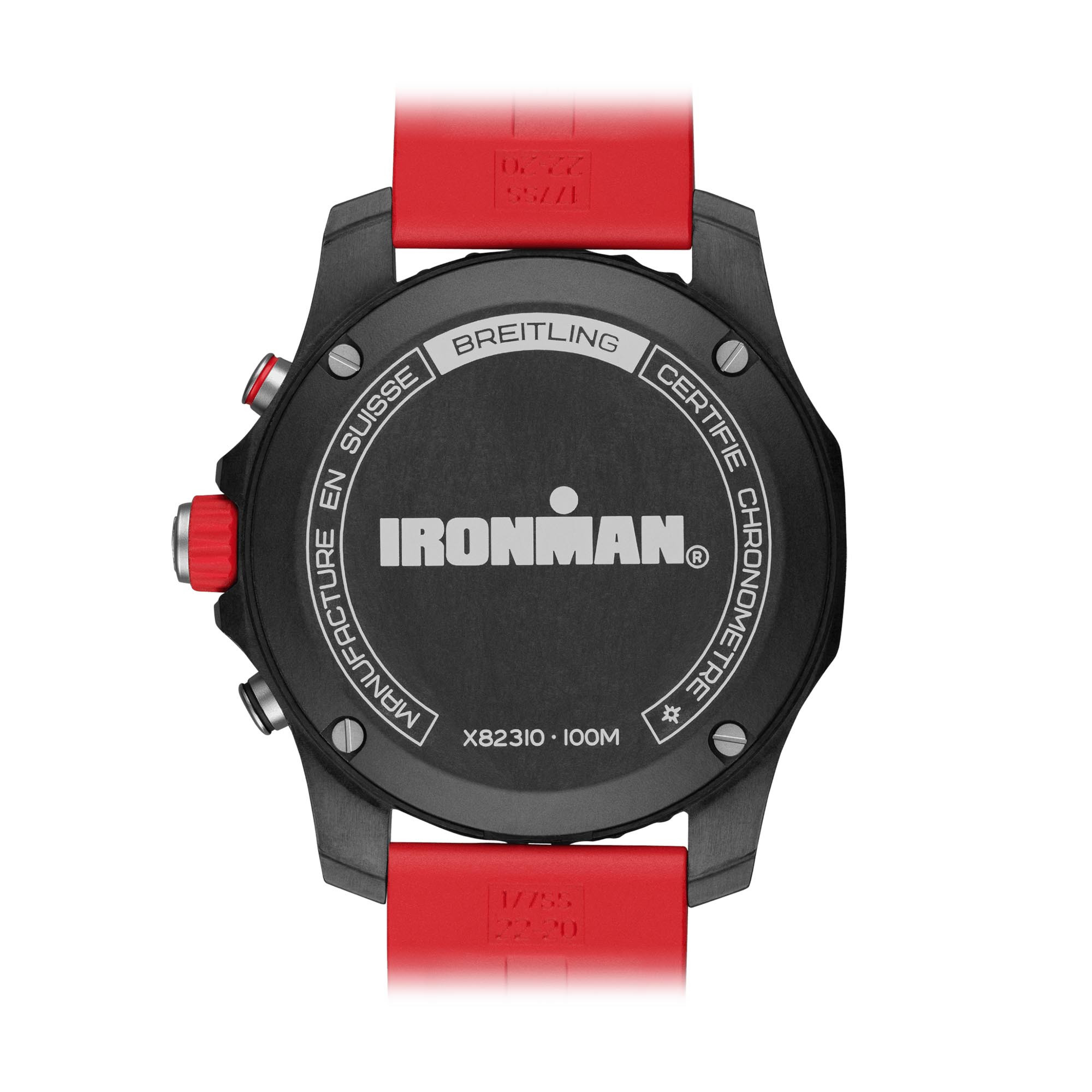 Ref. X823109A1K1S1 - Breitlings IRONMAN®-Version der federleichten Endurance Pro. Entworfen für Frauen und Männer, in deren aktivem Leben sich Professionalität und Sportlichkeit die Waage halten, ist die Endurance Pro nicht nur den Herausforderungen eines anstrengenden Work-outs gewachsen, sondern unterstreicht auch die Lässigkeit des Alltagsoutfits. Die Endurance Pro verfügt über ein ultraleichtes Gehäuse aus Breitlight®. Dieser widerstandsfähige Werkstoff ist 3,3-mal leichter als Titan und 5,8-mal leichter als Edelstahl. Das antimagnetische, thermisch stabile und hypoallergene Breitlight® ist hochgradig kratz-, zug- und korrosionsfest. Die haptische Wirkung ist wärmer als die von Metall, und der leichte Textureffekt unterstreicht den Einfallsreichtum des Designs. Die Endurance Pro IRONMAN® besticht mit ihrem markanten roten IRONMAN®-Zifferblatt und dem gebrandeten Kautschukarmband mit Breitlight®-Doppeldornschliesse. Für den Antrieb sorgt das Breitling-Kaliber 82, ein COSC-zertifizierter SuperQuartz™-Chronograph, der ausserordentliche Ganggenauigkeit bietet.