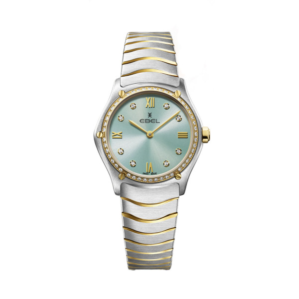 Ref. 1216559 - EBEL Sport Classic Lady, Gehäuse aus Edelstahl und 18K Gelbgold mit 47 Diamanten (0.3055 Ct.) Ø29 Mm, galvanisiertes mintblau Zifferblatt mit 3N gelbgoldbeschichteten römischen Ziffern und 8 Diamanten (0.0512 Ct.), abwechselnd gebürstet und poliert, innenseitig entspiegeltes Saphirglas, Wellengliederarmband mit Faltschließe aus Bicolor-Edelstahl, Schweizer Quarzwerk, wasserdicht bis 5 bar.