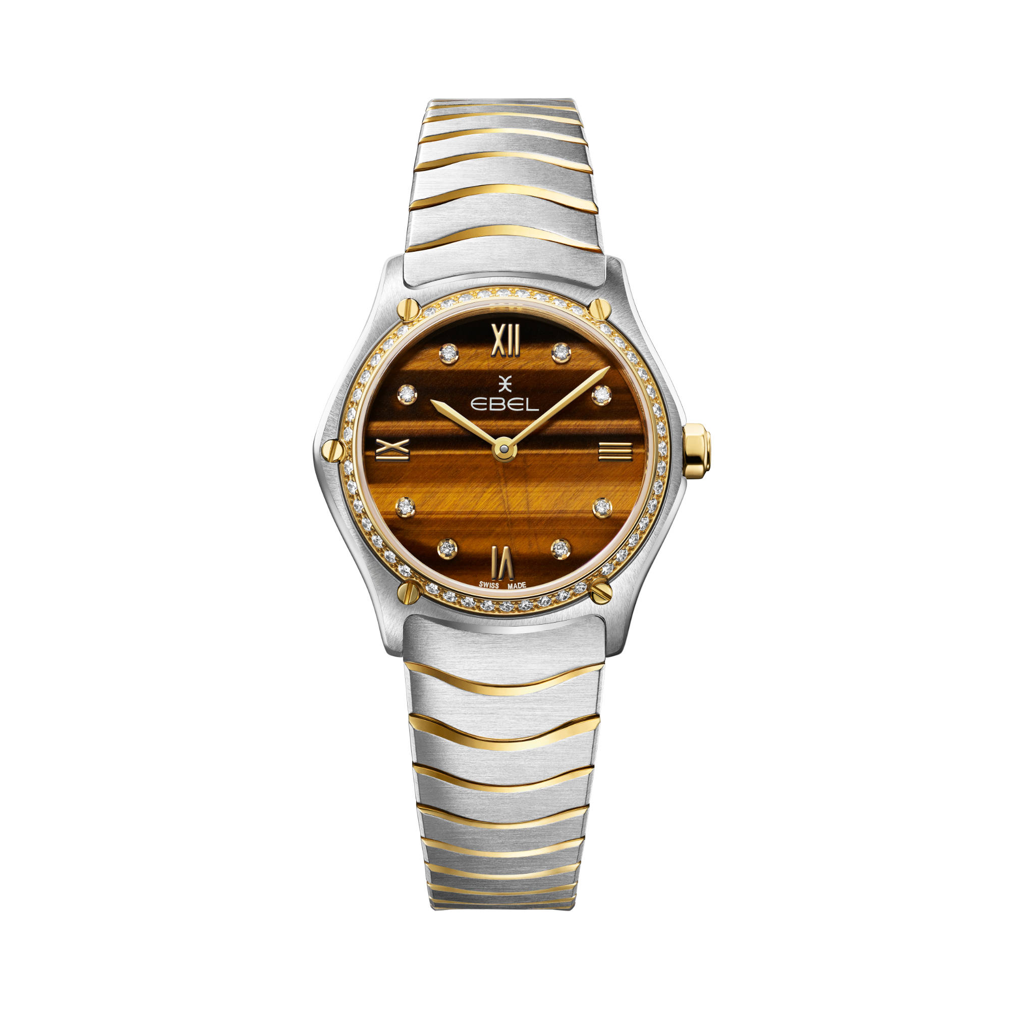 Ref. 1216560 - EBEL Sport Classic Lady Damenuhr, Gehäuse aus Edelstahl und 18K Gelbgold mit 47 Diamanten (0.3055ct.), Ø 29 mm, Tigerauge-Zifferblatt mit applizierten römischen Ziffern und 8 Diamanten (0.052ct.), innenseitig entspiegeltes Saphirglas, Wellengliederarmband aus Bicolor-Edelstahl mit Faltschließe, Schweizer Quarzwerk, Limitierte Auflage: 200 Stück, wasserdicht bis 5 bar.