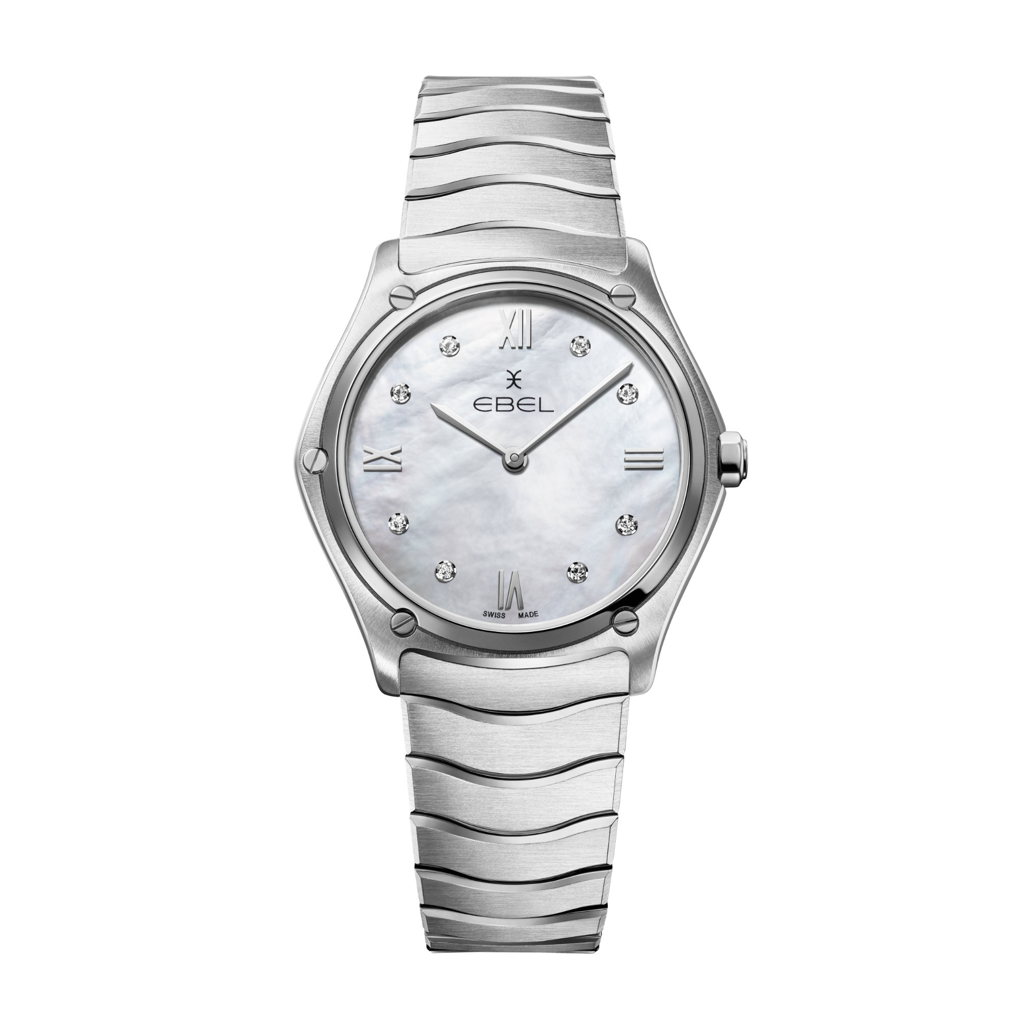 Ref. 1216704 - EBEL Sport Classic Damenuhr, Edelstahlgehäuse, Ø 33 mm, Perlmuttzifferblatt mit applizierten römischen Ziffern und 8 Diamanten (0,052 ct), Saphirglas mit Antireflexbeschichtung auf der Unterseite, Wellengliederarmband aus Edelstahl mit Faltschließe, Schweizer Quarzwerk, wasserdicht bis 5 bar