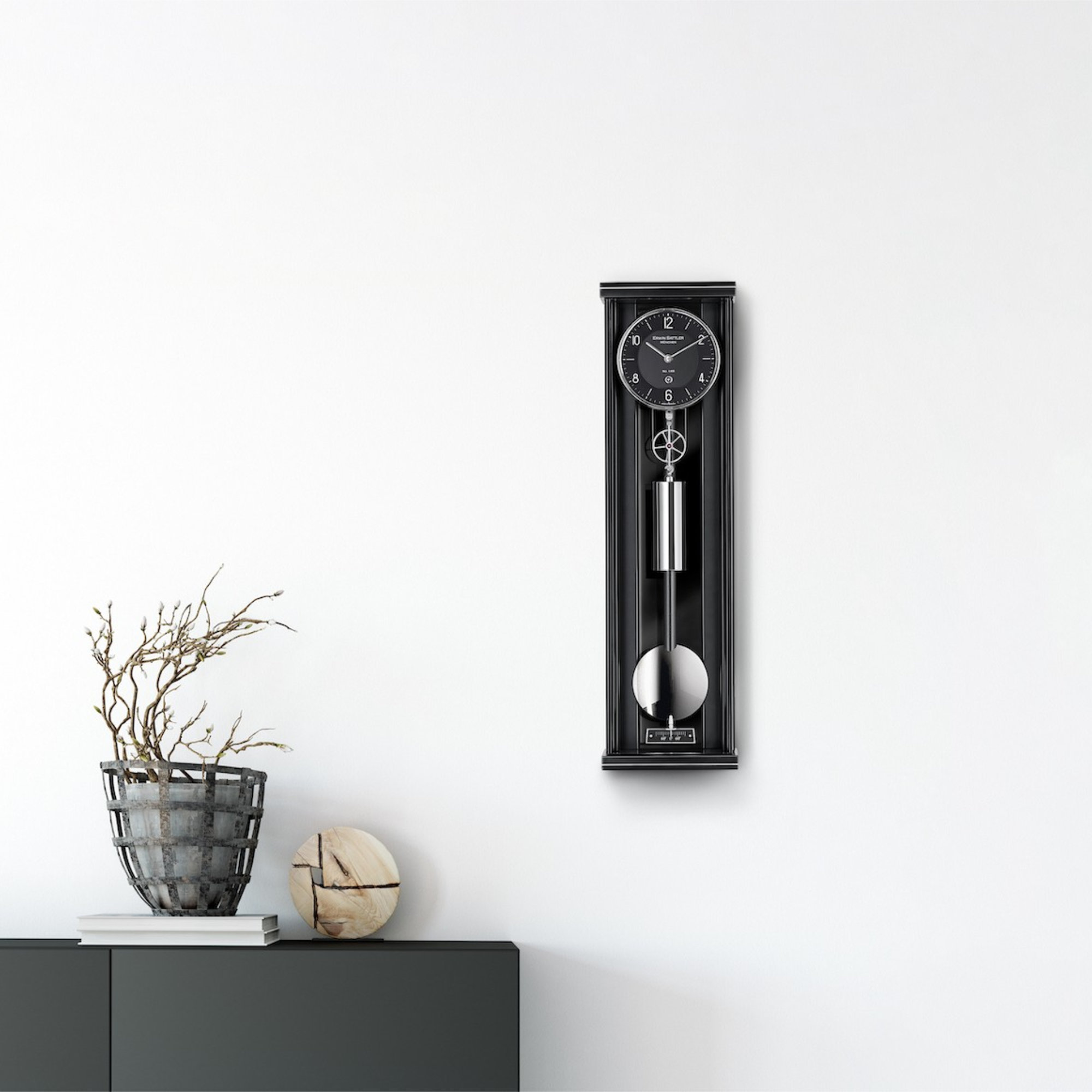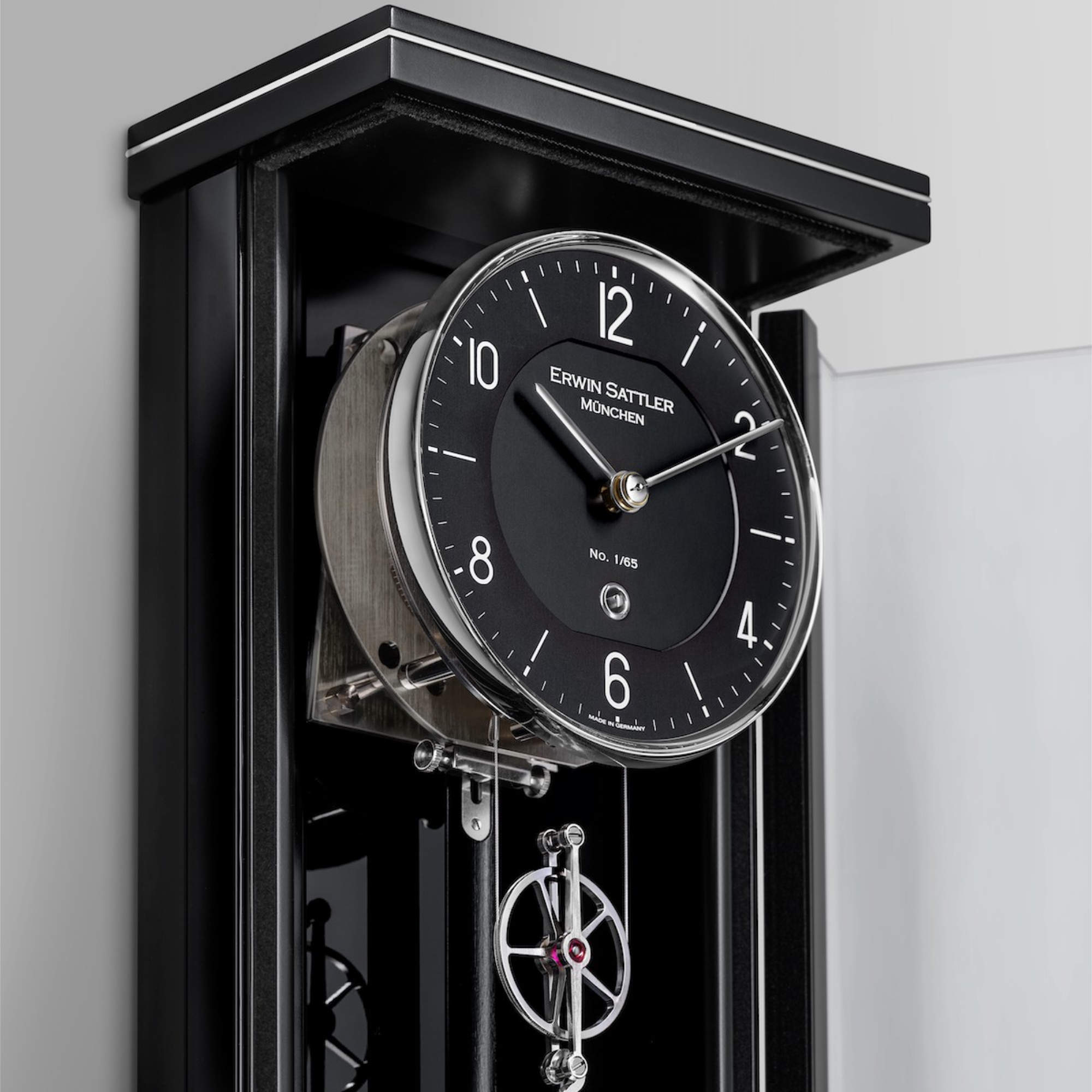Ref. RPC-54-32-15 - Ein weiteres exklusives Highlight stellt das moderne Gehäuse dar. Es ist mit einer rahmenlosen Tür und einem entspiegelten U-Glas ausgestattet. Polierte Metallintarsien in Sims und Sockel setzen weitere Glanzpunkte. Die von Hand polierte Kassette in der Gehäuserückwand, sowie die handpolierten Streifen in den seitlichen Gehäuseleisten sind ein wahrhaft meisterliches Stück deutscher Handwerkskunst.