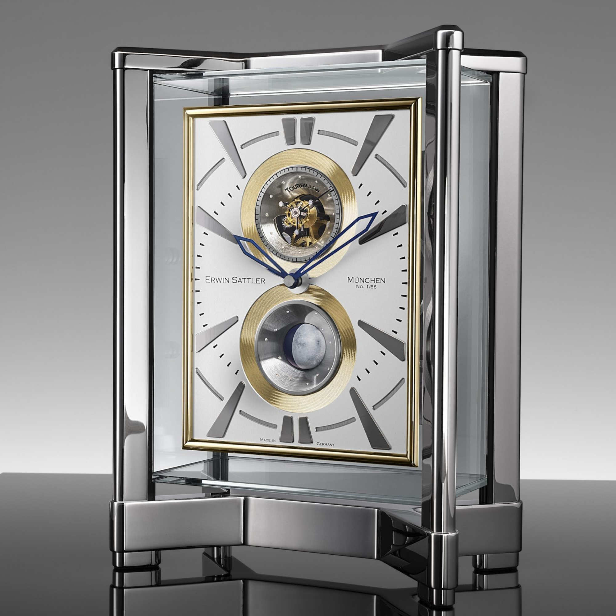 Ref. TC-35-43-29 - Umrahmt von einem polierten Edelstahlgehäuse stellt das Zifferblatt das optische Highlight der exklusiven Tischuhr dar. Aufgesetzte, polierte Indexe, guillochierte Zifferblattsegmente um die beiden, mit jeweils 12 Brillanten versehenen Trichter erwecken die Aufmerksamkeit des Betrachters, die dann sogleich weitergleitet wird auf das sich drehende Minutentourbillon und die handbemalte Mondkugel, die für eine Drehung um die eigene Achse einen Mondzyklus benötigt.
