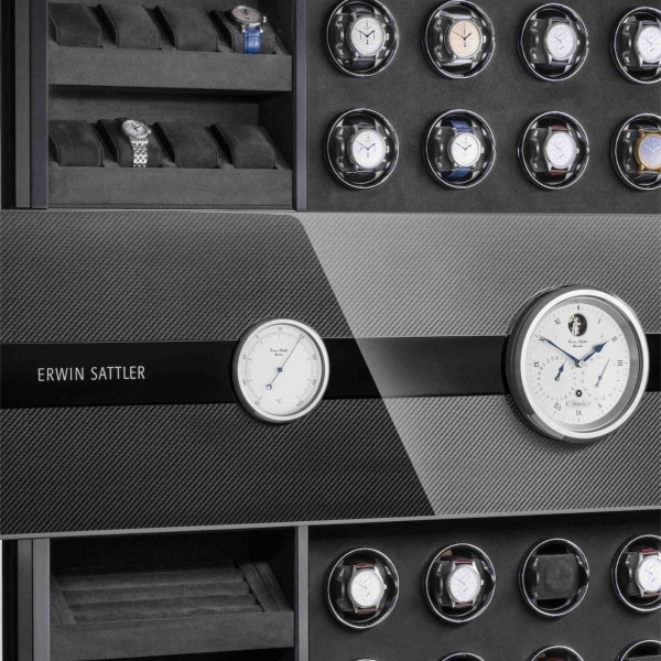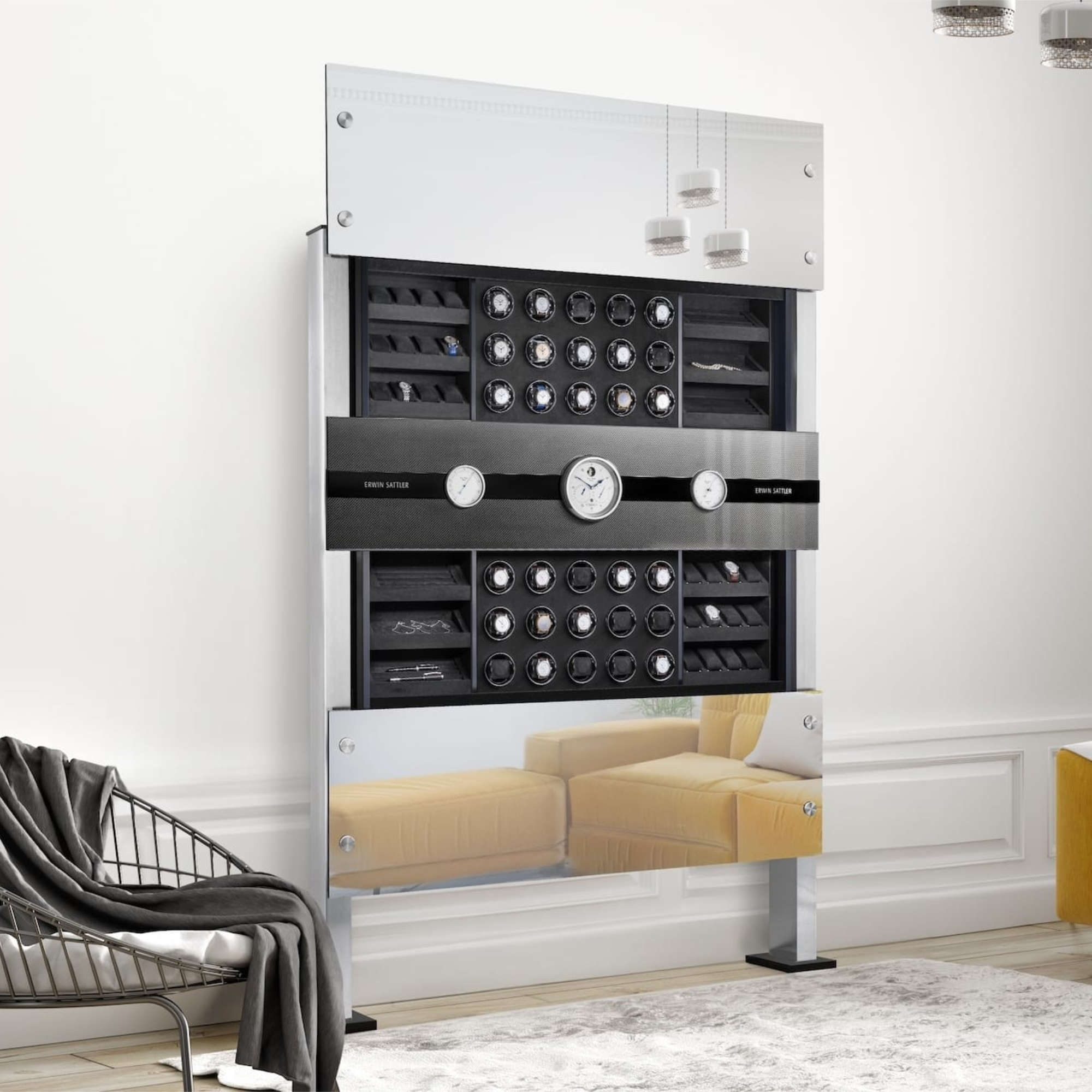 48 Handaufzugsuhrenkissen oder Fächer für Ringe, Manschettenknöpfe oder Ketten, seitliche Stützen links und rechts Edelstahl gebürstet, im mittleren Panel eingesetzt: Thermometer, Barometer, Navis 24, Panel nach Wunsch, LED Beleuchtung