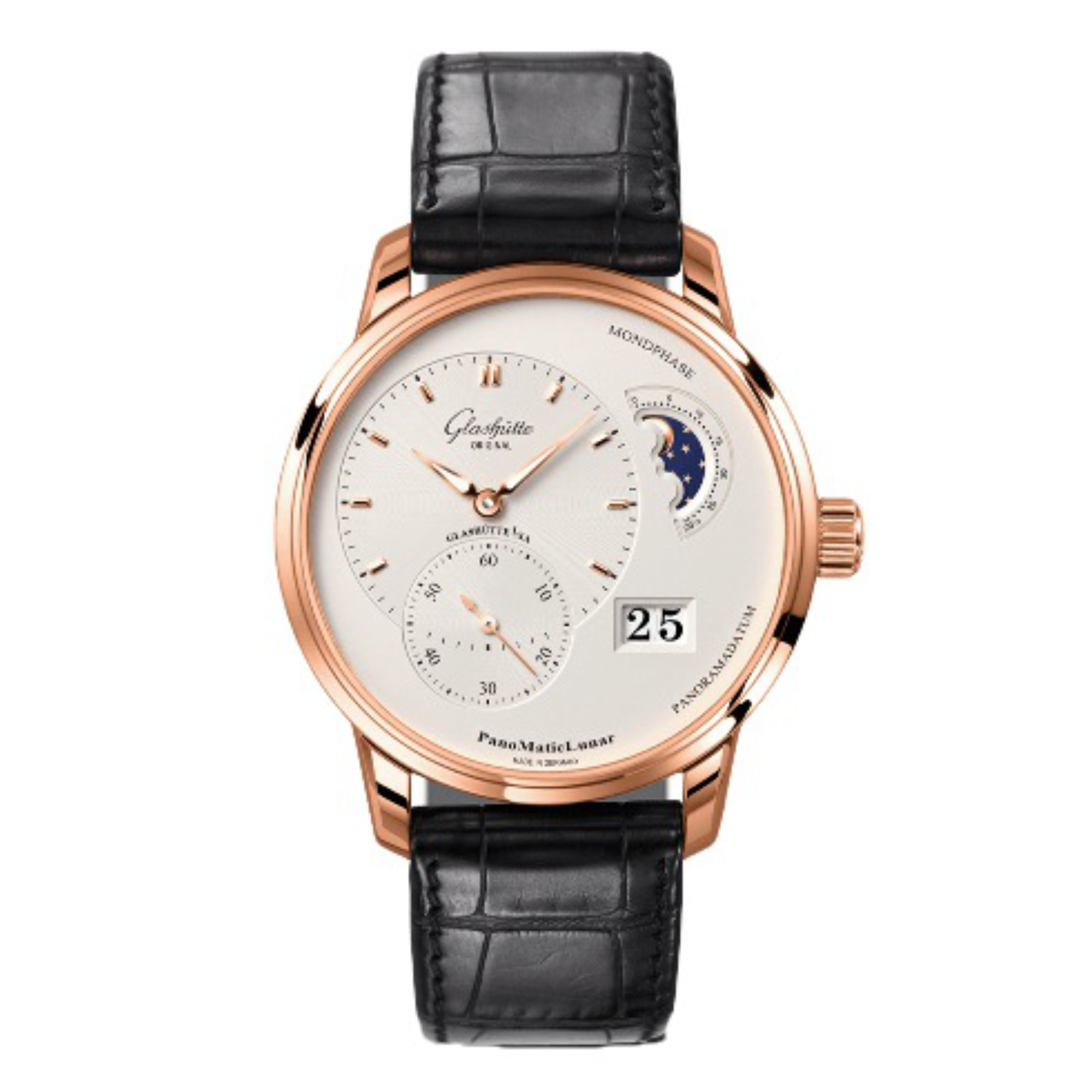 Funktionen: Stunde und Minute (dezentral), kleine Sekunde, Panoramadatum, Mondphase