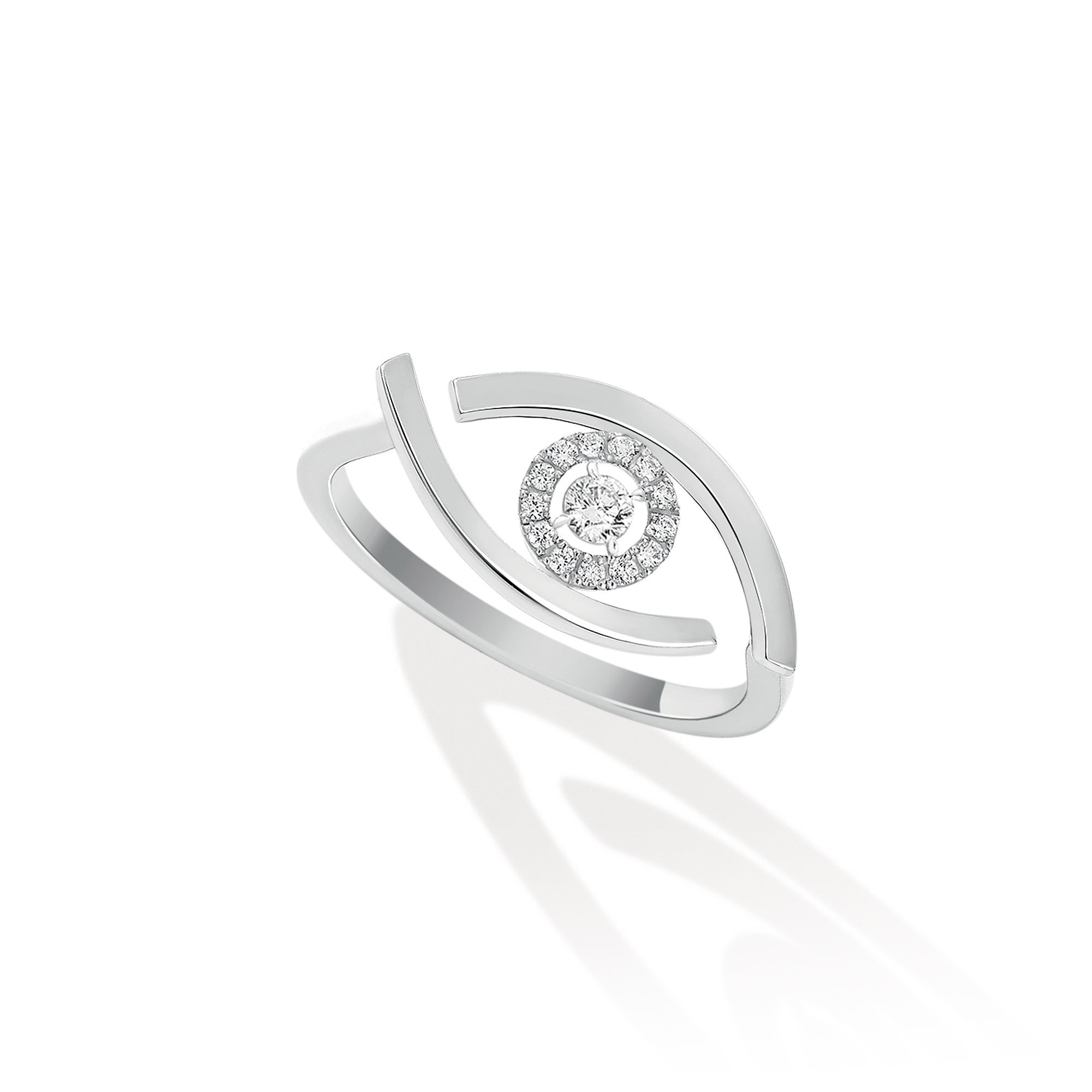 Ref. 10036-WG - Der Lucky Eye Diamantring aus Weißgold zeichnet sich durch sein modernes Design aus und verkörpert die Konturen eines Glücksbringers, der Sie jeden Tag begleiten wird. Mit seinem diskreten Ring liegt das luftige Auge zart auf dem Finger. Dieser Messika Diamantring setzt auf Kühnheit und Tradition zugleich – zu unserer größten Freude. Strahlend!