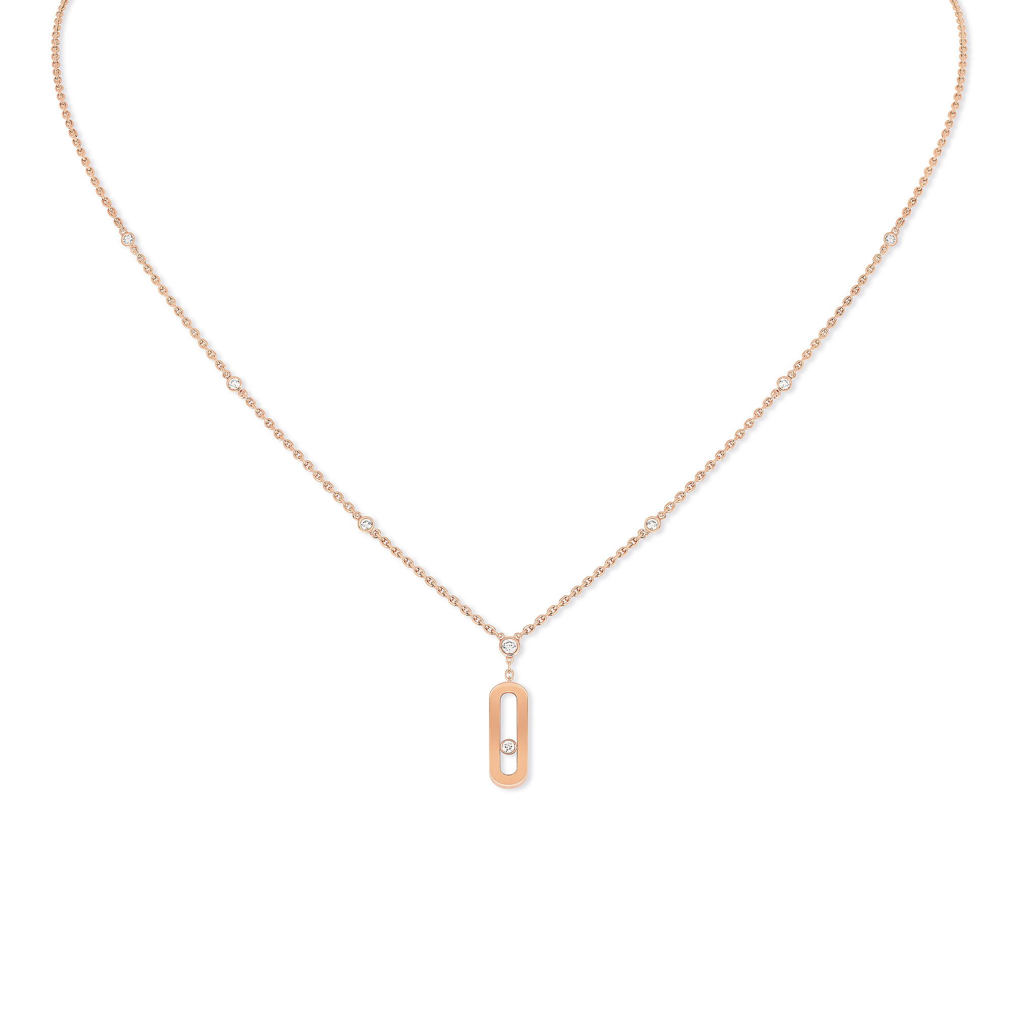 Ref. 10111-PG - Die Schönheit dieser langen Move Uno Diamantkette aus Roségold entsteht aus der Vielzahl an Tragemöglichkeiten, die sie bietet. Die Kette dieser langen Diamant-Halskette aus Roségold wurde kunstvoll verarbeitet und mit Diamanten besetzt. Sie besitzt ein ausgeklügeltes Schiebesystem, dank dem der Anhänger auf der Länge getragen werden kann, die sich die Trägerin wünscht, vom schlichten Halsreif bis hin zur langen Kette, ganz nach Lust und Laune oder Outfit. Egal, ob allein oder im Einklang mit dem Stacking-Trend in Kombination mit anderen Schmuckstücken getragen, passt diese Diamantkette zu allen Dekolletés.