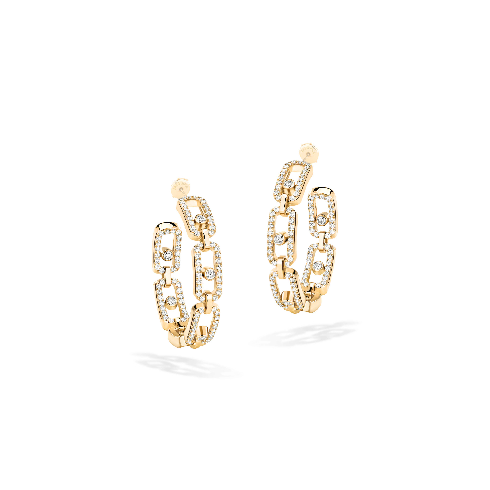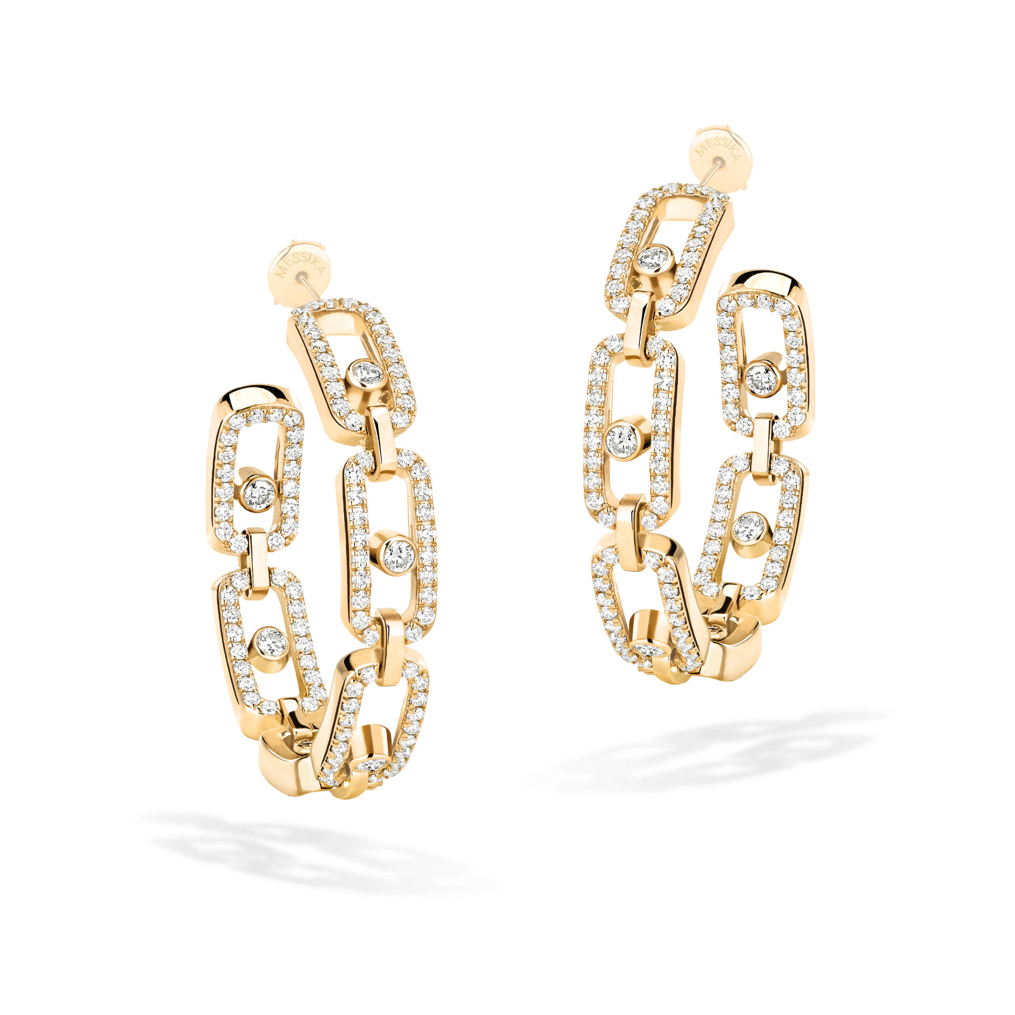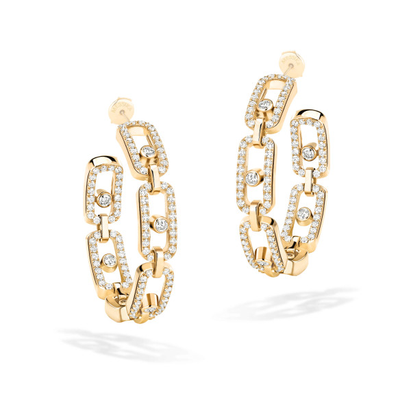 Ref. 12716-YG - Die Creole kühner denn je! Die Kult-Diamantohrringe aus den 1990er Jahren werden nun mit einer weiteren Ikone kombiniert, dem Move-Motiv, das den Erfolg der Maison Messika begründete. Dieses Motiv, das hier aus einem beweglichen Diamanten besteht, umgibt die Creole und verleiht ihr einen rockigen Look und eine unvergleichliche Modernität. Diese luxuriösen Ohrringe aus der Move Link Schmuckkollektion sind eine Neuinterpretation der Gliederkette und übernehmen deren ganze Kühnheit: Die vollständig mit Diamanten ausgefassten Kreationen werten die schlichtesten Outfits auf und sind der letzte Schliff für die schönsten Abendlooks. Diese luxuriösen Creolen sind in verschiedenen Durchmessern und Farben erhältlich, um alle Wünsche zu erfüllen und zu jedem Stil zu passen. Sie haben alles, was ein zukünftiges Must-have ausmacht!