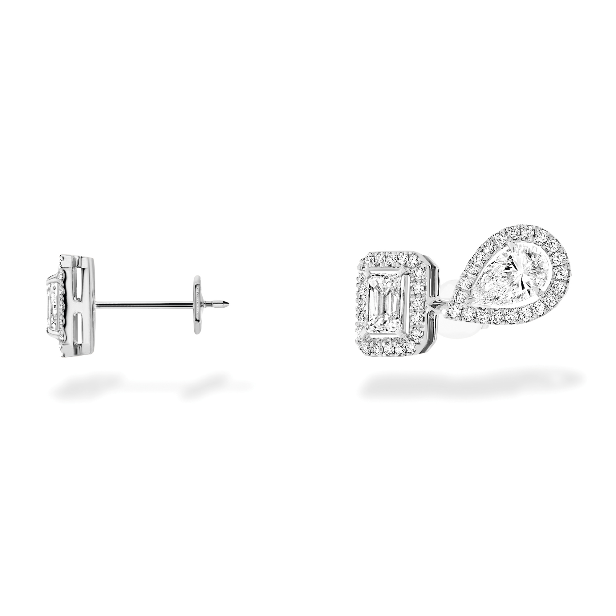 Ref. 12886-WG - In der Schmuckkollektion My Twin kombiniert Valérie Messika zwei verschiedene Edelsteinschliffe zu einem modischen, asymmetrischen Ganzen: den zeitlos-eleganten Smaragdschliff und den sinnlichen, modernen Tropfenschliff. Diese luxuriösen Weißgold-Ohrringe lassen sich ebenso gut einzeln wie als Paar tragen. Für die rechte Seite ist ein Ohrstecker aus einem 0,20 ct. Diamanten im Smaragdschliff mit einer Umrandung aus fein gefassten Brillanten vorgesehen. Für links gibt es einen Doppel-Ohrring, der ebenfalls aus brillantgerahmten Diamanten von je 0,20 ct. besteht. Der eine, im Smaragdschliff, sitzt mitten auf dem Ohrläppchen, während der zweite, im Tropfenschliff, auf unsichtbare Weise seitlich höher platziert wird, so dass der Eindruck eines zweifachen Piercings entsteht. Täglich zu tragende Damen-Ohrringe mit dem typischen gewissen Etwas von Messika, das sie außergewöhnlich macht.
