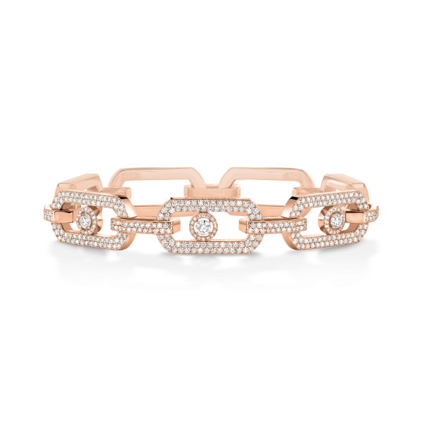 Ref. 12942-PG - Das mit Diamanten ausgefasste So Move Diamantarmband, eine neue Variation des Move-Kultmotivs in einer noch gewagteren Version. Das Messika Symbol gönnt sich ein Diamant-Pavé und einen Halo aus funkelnden Diamanten, die zum ersten Mal den unverkennbaren beweglichen Diamanten umschließen. Das Roségold spiegelt den Glanz der Diamanten wider, die sich auf beiden Seiten jedes Gliedes befinden. Das kleine Extra? Die Eleganz seines Verschlusses, der mit den XL-Motiven des Armbands verschmilzt.