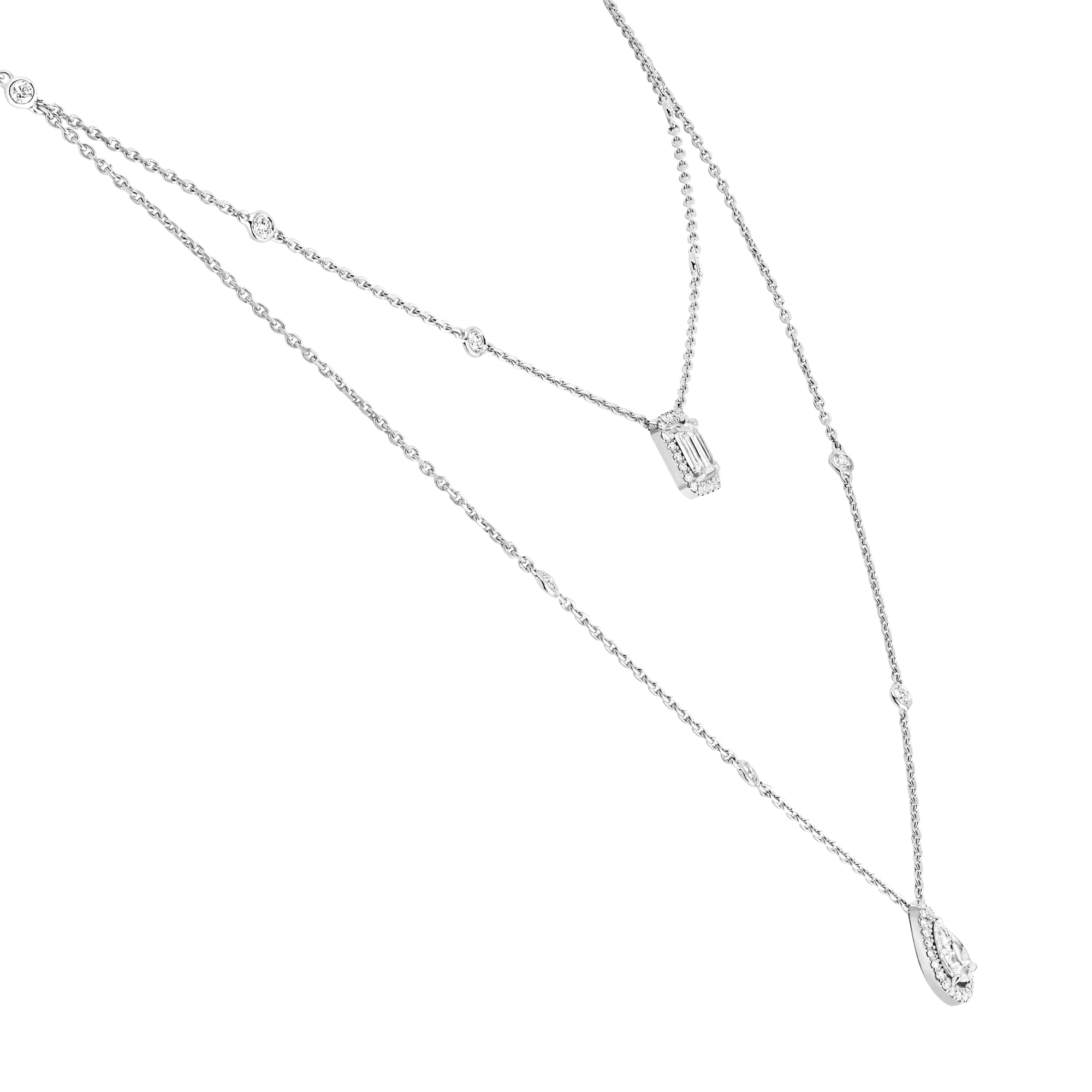 Ref. 12966-WG - Bei dieser zweireihigen Version mit je einem 0,40-karätigen Diamanten erhält die ikonische Luxuskette My Twin eine neue, noch üppigere Dimension. Durch den Kontrast zwischen einem Diamanten im Smaragdschliff und einem zweiten im Tropfenschliff wird das Dekolleté besonders schön betont. Diese beiden völlig unterschiedlichen Formen verleihen der Kollektion My Twin ihre unverwechselbare Originalität. Diese Weißgold-Version scheint den Hals ganz in Diamanten zu kleiden. Die vom Stacking-Trend inspirierten beiden Ketten unterschiedlicher Länge sind jeweils mit vier Verstellringen ausgestattet, damit sich das Schmuckstück nach Lust und Laune jeder Ausschnittform anpassen lässt.