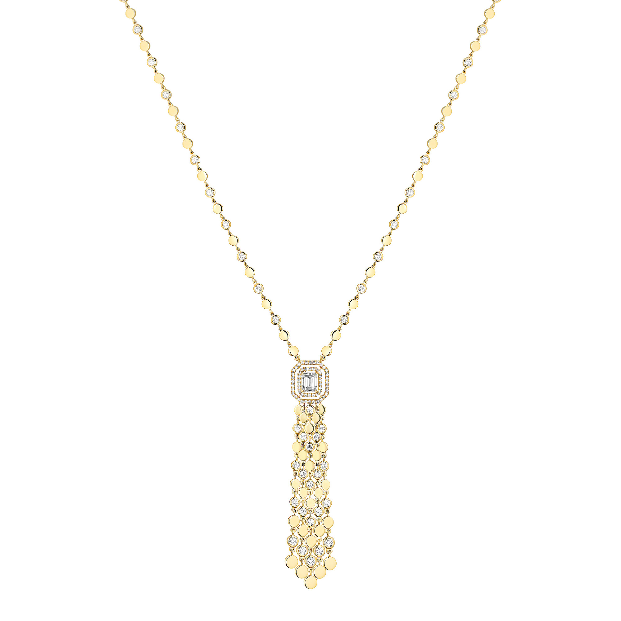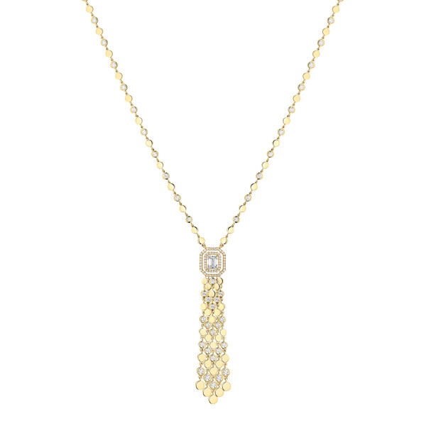Ref. 13175-YG - Das grafische Design und die fließenden Linien der D-Vibes Pompon-Halskette aus Gelbgold sind eine glänzende Neuinterpretation eines Klassikers der Juwelierkunst. Diese Diamantkette für Damen bietet einen absolut modischen und gleichzeitig subtilen Retro-Look. Sie verleiht Ihrem Outfit sowohl am Tag als auch am Abend einen Hauch von Eleganz und lässt sich vielseitig tragen. Die abnehmbare Verlängerung ermöglicht es Ihnen, eine Vielzahl von Stilen zu kombinieren, indem Sie mit der Länge der Trageweise spielen und so einen raffinierten oder lässig-schicken Look kreieren. Die kostbaren Fäden aus Gold und Stein des zentrale Motivs zeichnen eine edle Quaste, die von einem 0,40 ct. Diamanten im Smaragdschliff gekrönt wird. Die beiden Diamantlinien, die den zentralen Stein umgeben, unterstreichen die grafische Ästhetik im Art-déco-Stil.