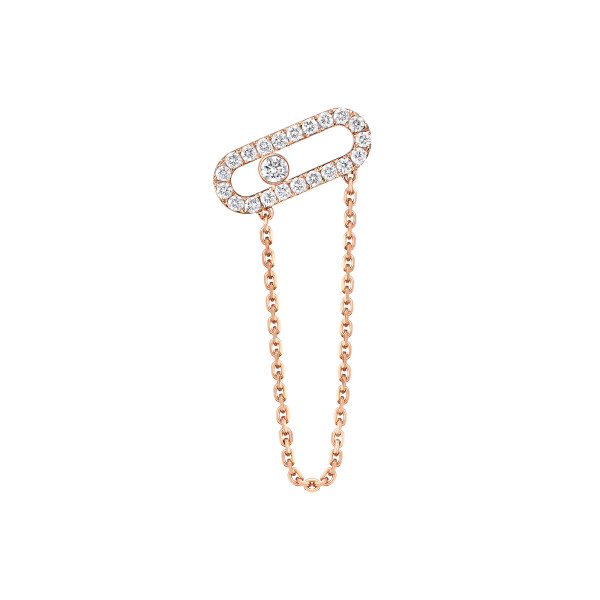 Ref. 13423-PG - Die unverwechselbare Move Uno Kollektion von Messika besticht durch ihr grafisches Design und ihre klaren Linien. Dieser einzigartige und kultige einzelne Ohrring aus 18 Roségold und Diamanten verleiht mit seiner hängenden Kette einen originellen und kostbaren Glanz. Die schillernde mit Diamanten ausgefasste Fläche und der bewegliche Diamant im Brillantschliff lassen das Gesicht strahlen. Dieser einzelne Ohrring kann allein oder in Kombination mit einem Ohrclip getragen werden und zeichnet eine subtil rockige Asymmetrie.