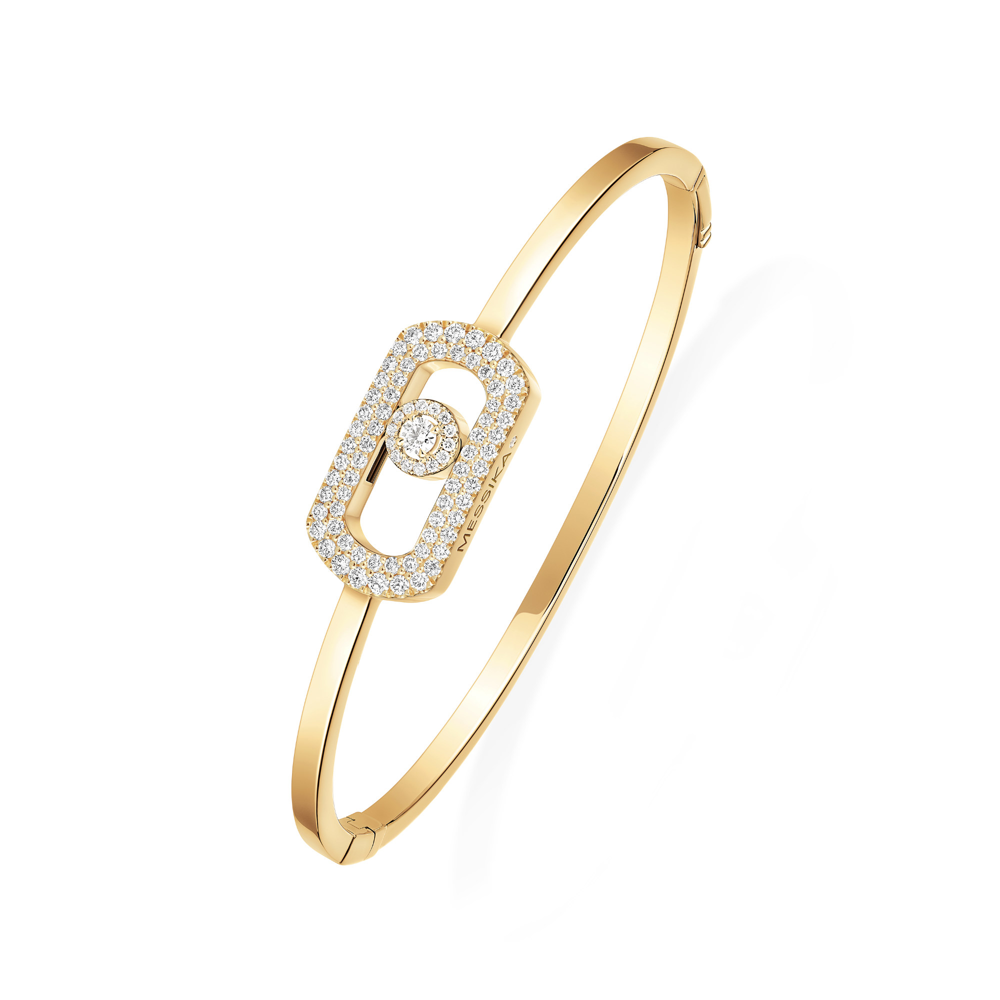 Ref. 13428-YG - Der Damenarmreif in einer Neuinterpretation von Messika. Der mit Diamanten ausgefasste So Move Diamantarmreif aus Gelbgold mit ist ein Oversize-Schmuckstück, das eine unwiderstehliche Anziehungskraft ausübt und das Handgelenk mit einer nie dagewesenen Kraft und Ausstrahlung schmückt. Ein Diamantschmuckstück mit Charakter, das einzeln oder in Kombination getragen werden kann. Dieser XXL-Luxusarmreif verleiht jedem Stil sofort eine ultramodische Note. Das Move-Motiv in Übergröße gewinnt an Substanz und Präsenz und wird zu einem Symbol der Selbstbehauptung, mit dem Sie sich trauen und sich von den Codes befreien können. Diese Version mit Diamantbesatz ist noch kühner und strahlt voller Licht und verstärkt den Glanz des beweglichen zentralen Steins und seines unverwechselbaren Halos, der mit Diamanten ausgefasst ist.