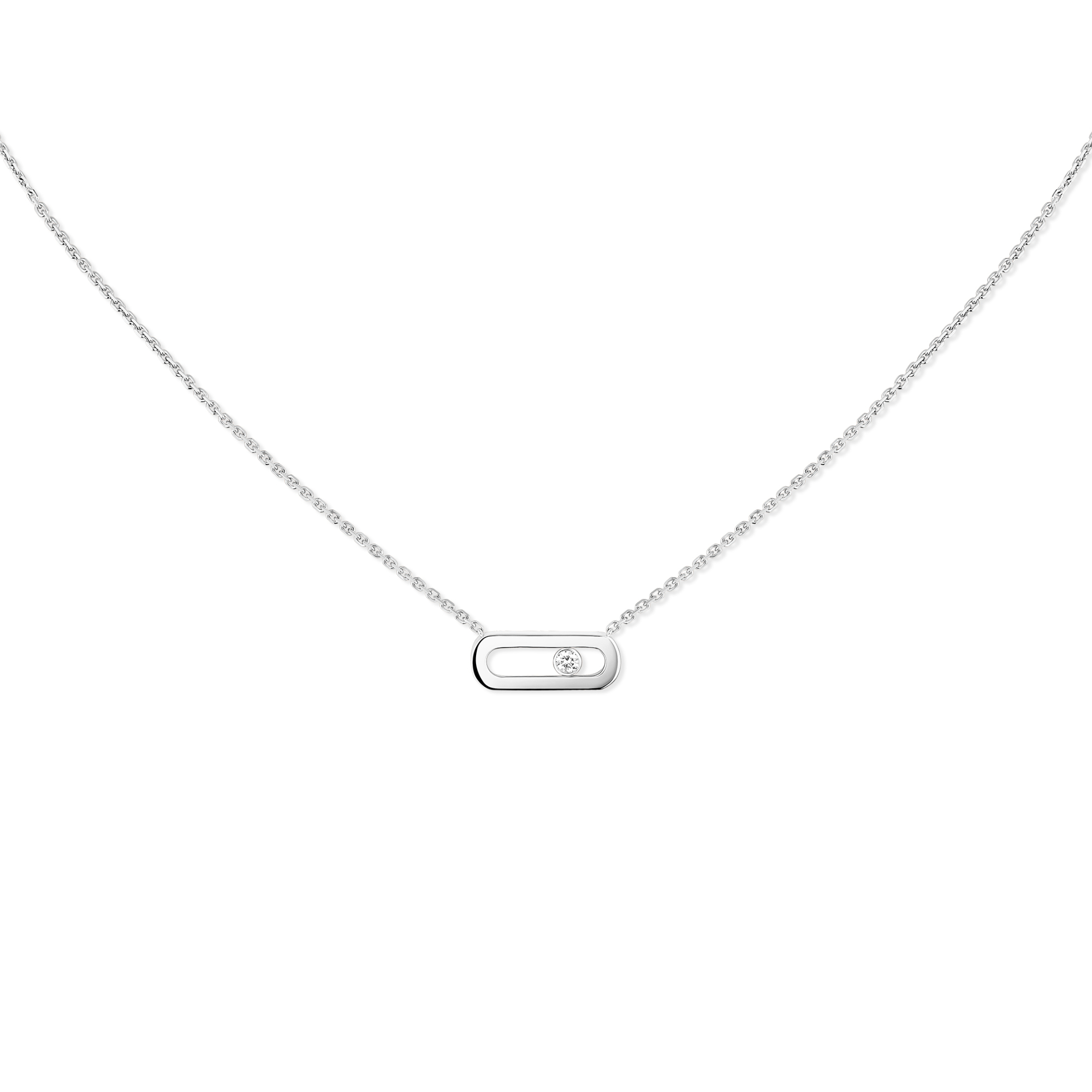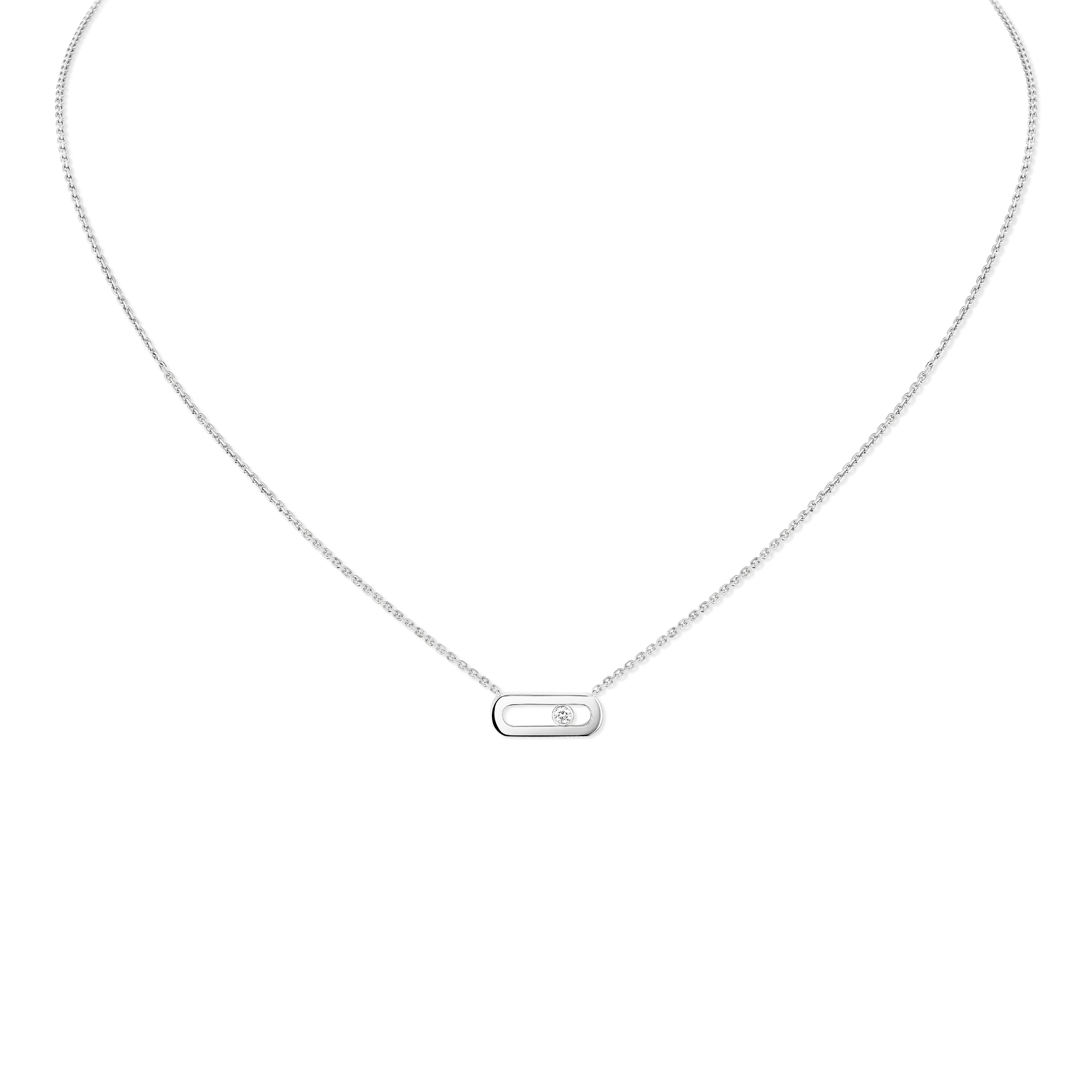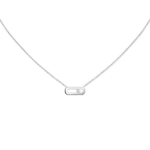 Ref. 14613-WG - Die Move Uno Halskette aus 18 Karat Weißgold und Diamanten ist die perfekte Begleiterin! Das Collier wurde vollständig von Hand gefertigt und greift das Kultdesign der Pariser Maison in einer neuen Version ohne Steinbesatz am Rand auf: In der Mitte des Motivs befindet sich ein Diamant, der mit den Bewegungen mitschwingt. Diese Kreation aus Gold und Diamanten ist das ideale Luxusgeschenk und besticht durch ihren zeitlosen und zugleich modernen Stil. Uns gefällt besonders die zeitgemäße und elegante grafische Linie.