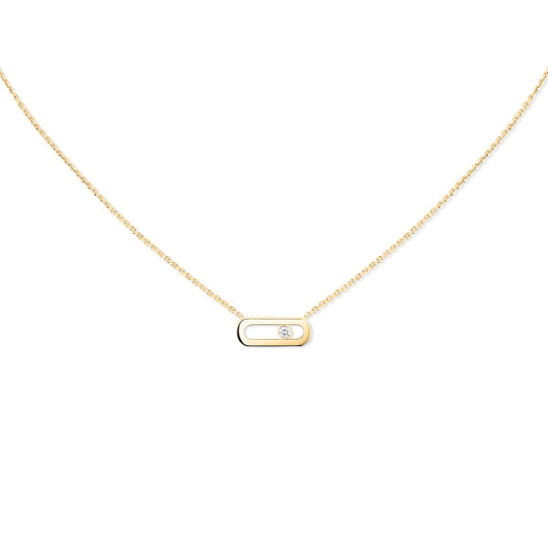 Ref. 14613-YG - Die Move Uno Diamantkette aus Gelbgold stammt aus der Move Kollektion der Maison für Schmuck und Haute Joaillerie Messika. Diese absolute Kultkollektion verdankt ihren Namen dem beweglichen Diamanten, der in der Mitte ihrer Kreationen schwingt. Diese von Hand aus 18 Gelbgold gefertigte Kreation besticht vor allem durch ihr schlichtes und elegantes Design. Egal ob Sie einen minimalistischen Look bevorzugen, indem Sie diese Messika Move Halskette allein tragen, oder sich für einen modischen Look entscheiden, indem Sie sie mit anderen Kreationen der Maison kombinieren – diese Diamantkette für Damen wird schnell zu Ihrer täglichen Begleiterin, die Ihr Dekolleté mit einem diskreten und kostbaren Glanz schmückt.