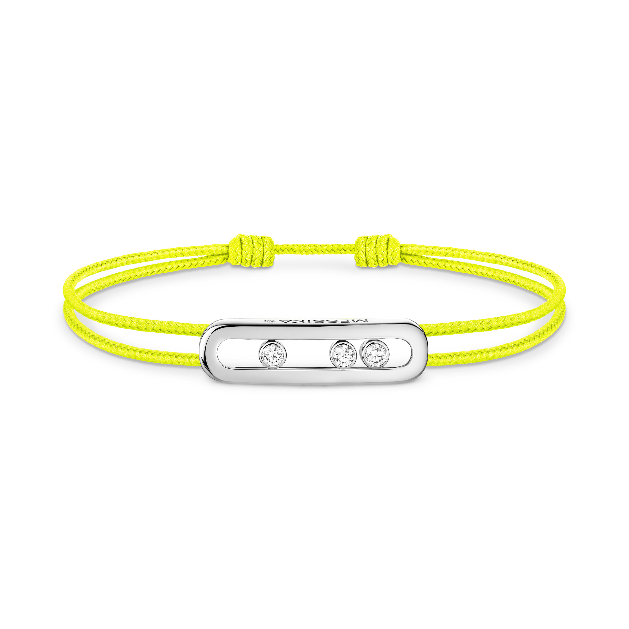 Das Messika CARE(s) Armband mit neongelber Schnur ist ein lebhaftes und intensives Armband, das das Move-Motiv in einer strahlenden Kombination aus Farbe und Gold neu interpretiert. Mit seinen drei beweglichen Diamanten und der leuchtenden Schnur ist dieses Diamantarmband aus Weißgold mit Schnur der perfekte strahlende Akzent für den Alltag. Die Messika CARE(s) Linie ist doppelt wertvoll, weil sie eine solidarische Schmuckkollektion ist. Für jedes verkaufte Gold- und Diamantschmuckstück wird ein Teil des Gewinns über die Valérie Messika Stiftung an internationale Organisationen und NGOs gespendet, die sich für Kinder in den Bereichen Bildung und Gesundheit einsetzen.