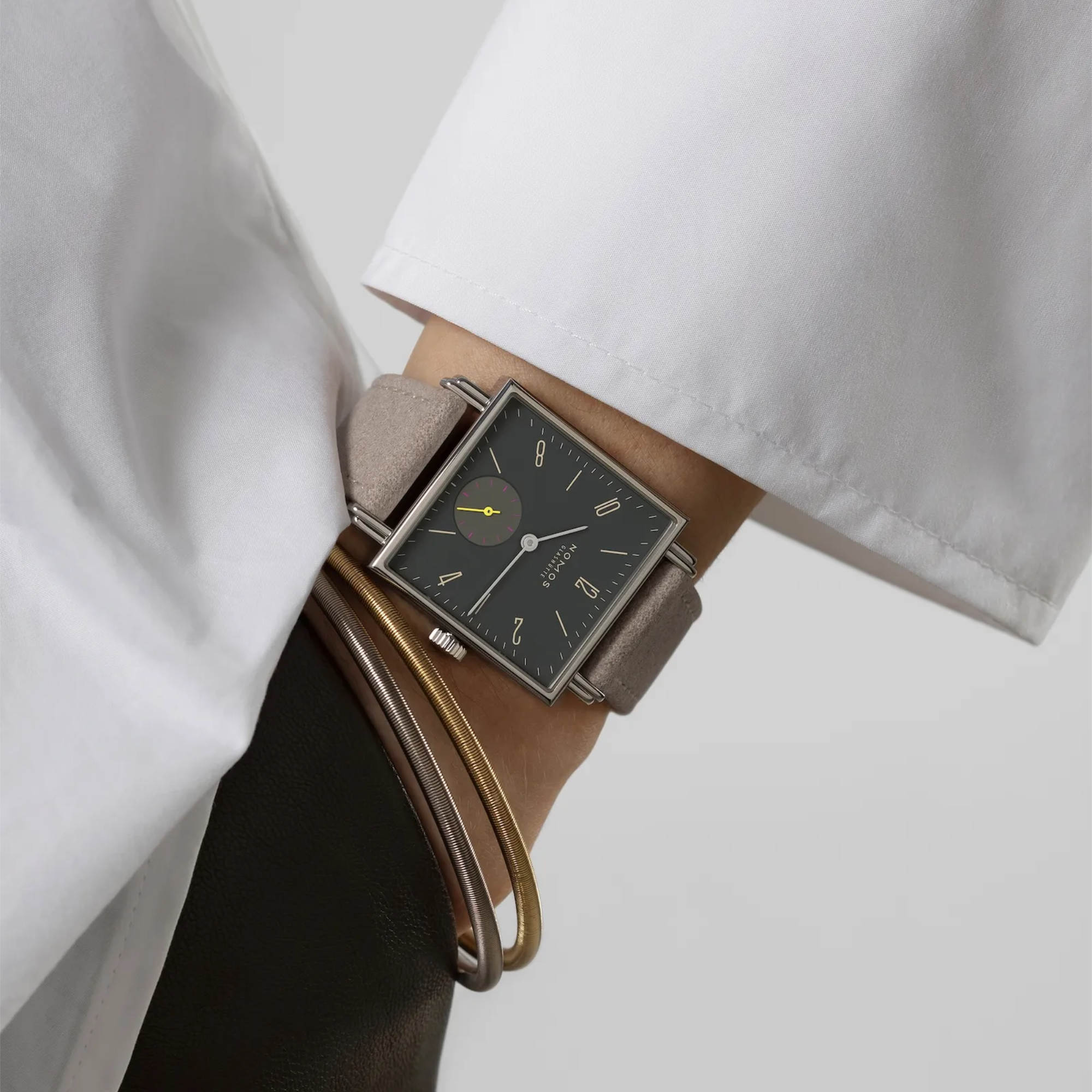 Ref. 440.SB - Diese außergewöhnliche Uhr in Anthrazit verbindet elementare Schönheit mit der Reinheit der Form. Der vulkanische Farbton hat Tiefe und fällt zugleich ins Auge, er bildet einen Kontrast zum glänzenden Edelstahl des Gehäuses und verleiht der quadratischen Silhouette Kraft und Charisma. Tetra Basalt hat Persönlichkeit und verfügt über die dauerhafte Modernität guten Designs. Das mechanische Kaliber im Inneren genießt Glashütter Herkunftsschutz.
