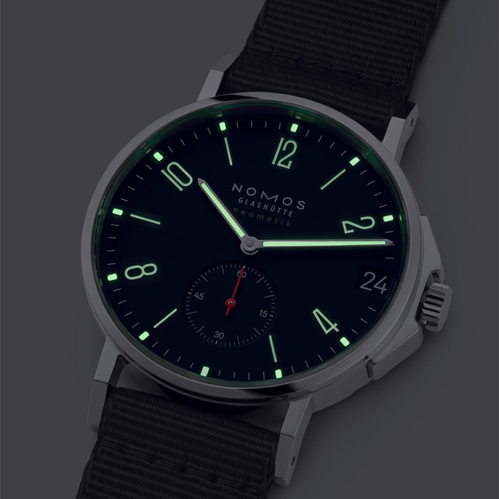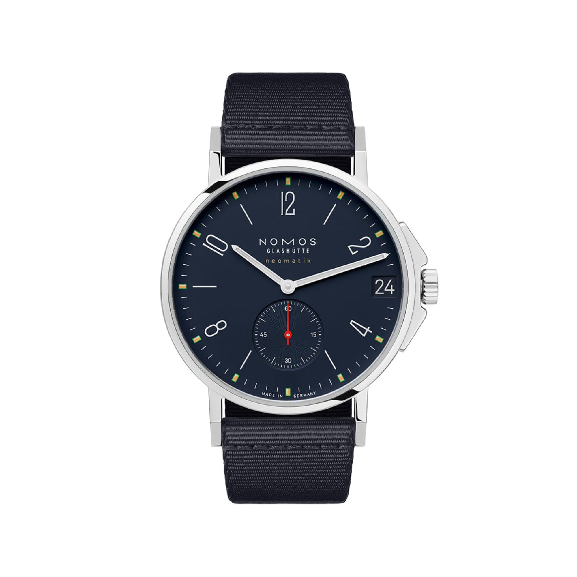 Ref. 566 - Ahoi neomatik Atlantic – eine vielseitige Automatikuhr, ausgestattet mit der innovativen Kalibertechnologie des hochpräzisen neomatik DUW 3001 Uhrwerks. Das von NOMOS entwickelte Kaliber misst nur 3,2 Millimeter in der Höhe – das entspricht neun gestapelten Briefmarken – und ist damit bemerkenswert schlank. Die Zeit wird durch die hauseigene Hemmung, das berühmte NOMOS-Schaukelsystem, gehalten. Mit einem Gehäusedurchmesser von 36 Millimetern ist die Ahoi neomatik Atlantic das kleinste der Ahoi Atlantic Editionsmodelle. Die Uhr ist bis zu 20 atm wasserdicht.