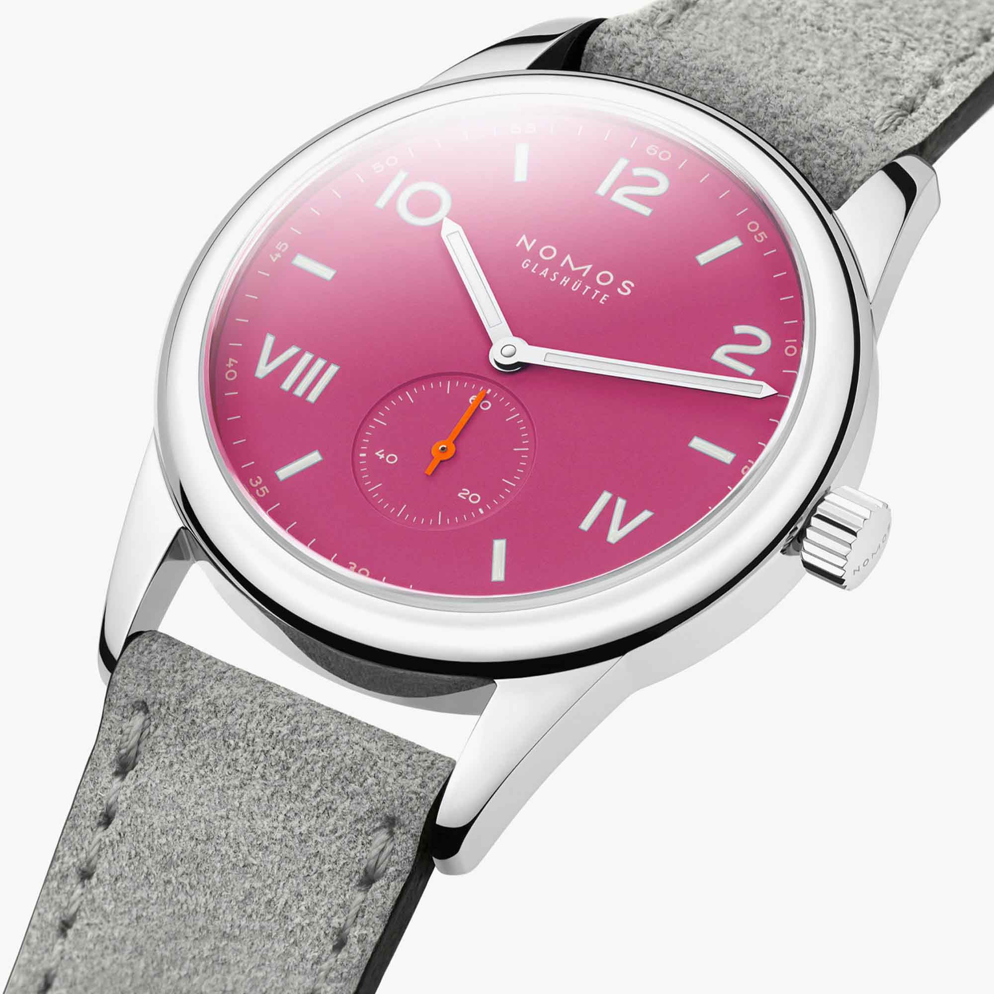 Zeiger rhodiniert, mit Superluminova weiß ausgelegt (blau nachleuchtend), Sekundenzeiger neonorange