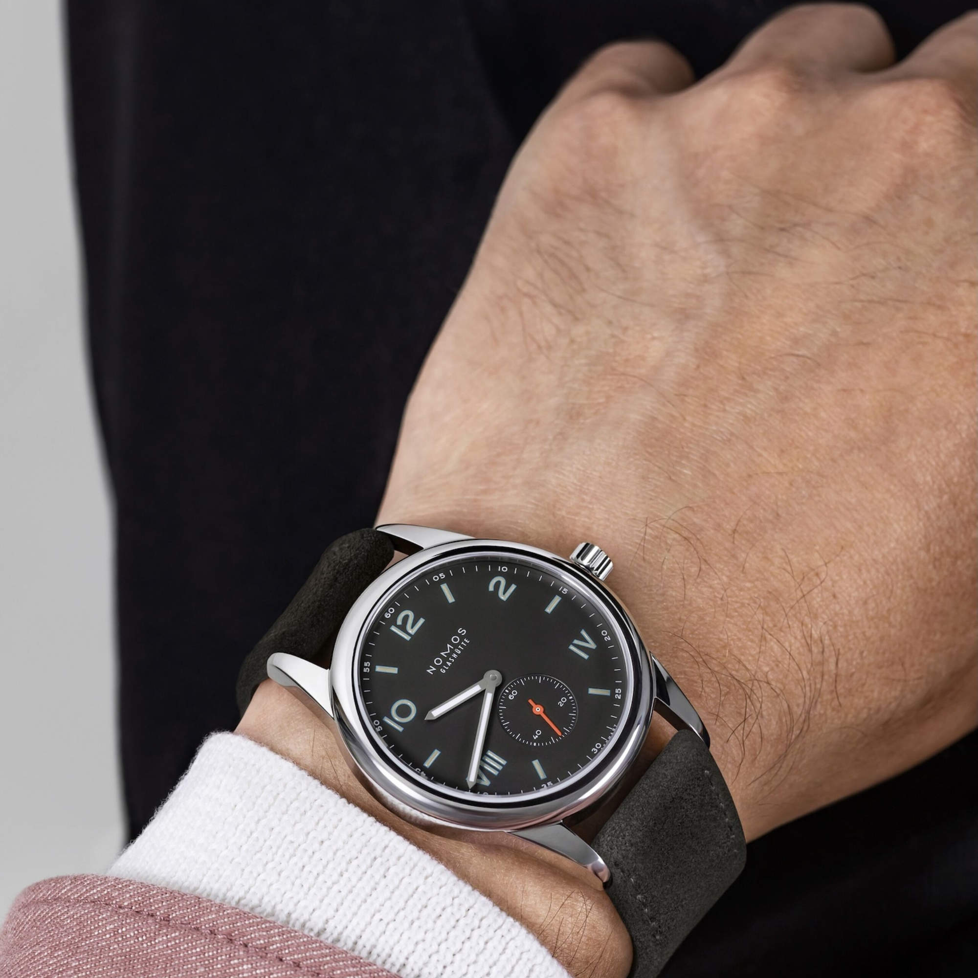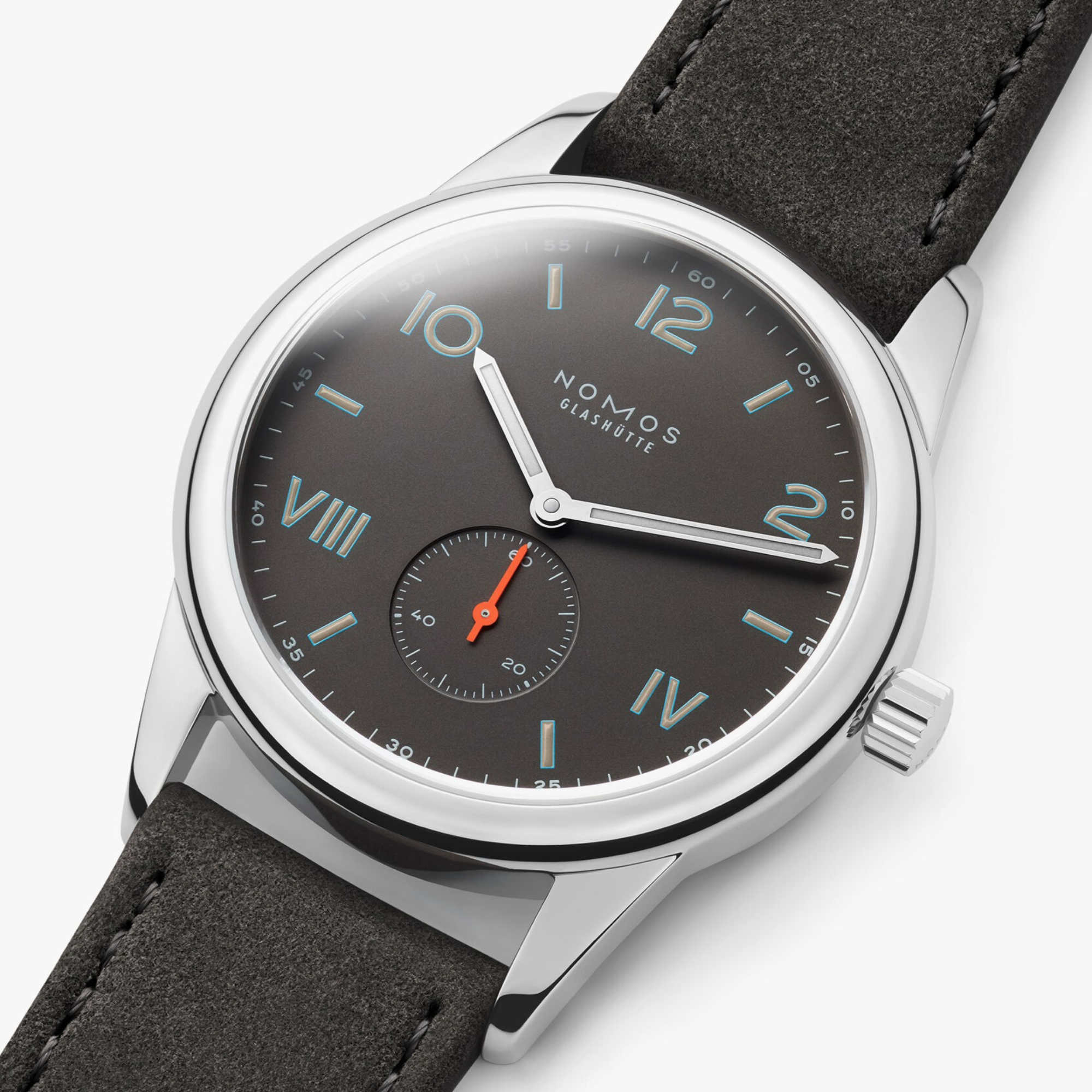 Zeiger: Stunden- und Minutenzeiger rhodiniert und mit Superluminova ausgelegt (blau nachleuchtend); Sekundenzeiger neon-orange