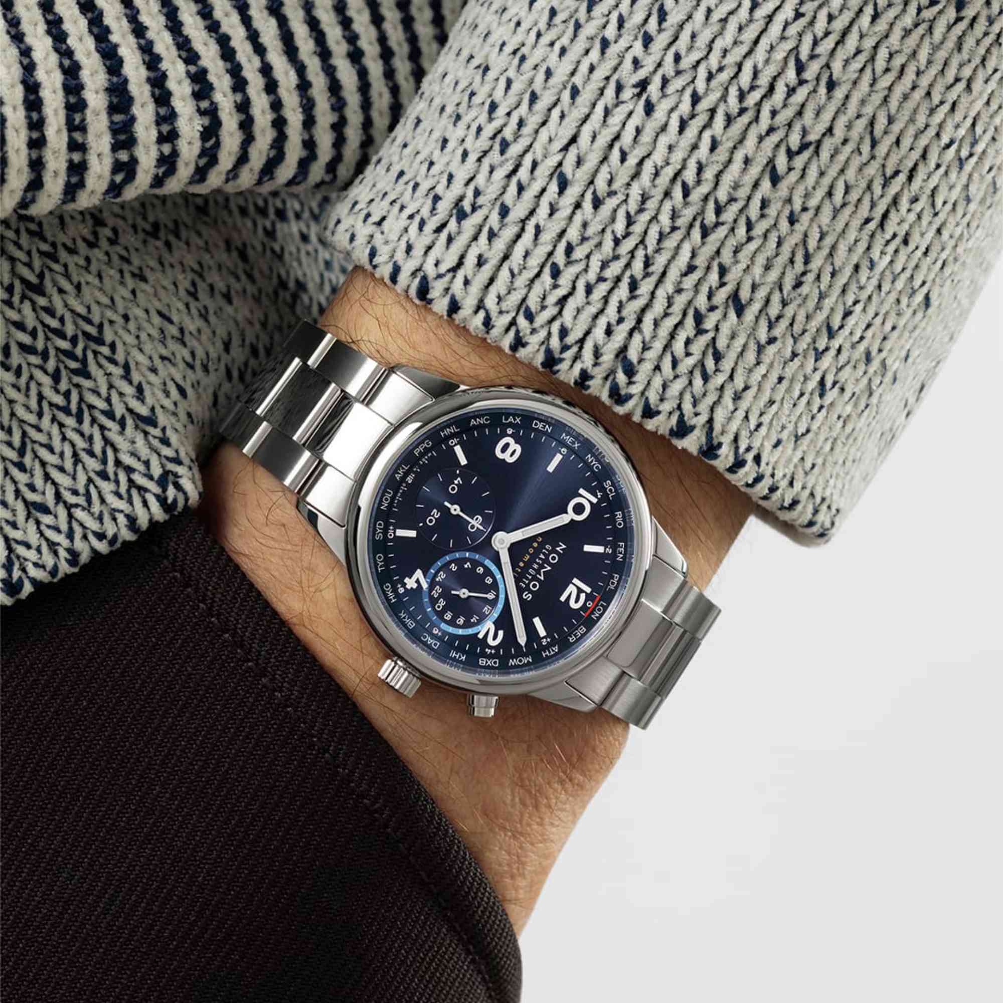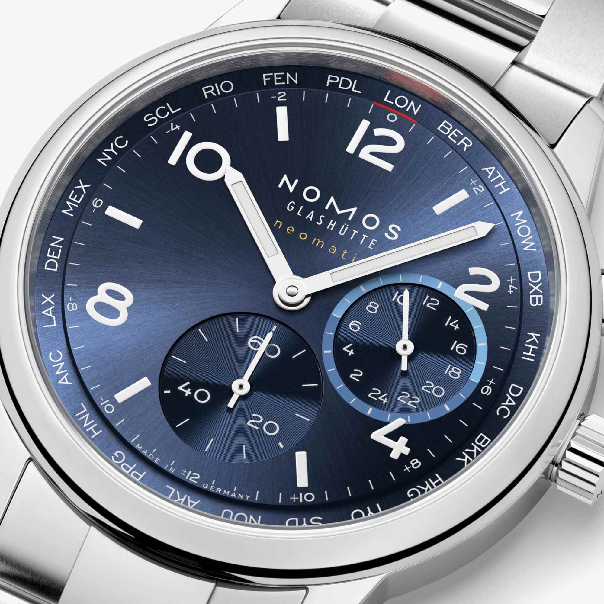 Ref. 790 - Mit dieser Automatikuhr hat man die Welt im Blick und kann dies zu Hause wie beim Reisen in jeder Situation nutzen. Club Sport neomatik Weltzeit blau ist eine der schlanksten Weltzeituhren überhaupt, glänzt mit ihrem tiefblauen Zifferblatt auch bei formalen Anlässen und ist gleichzeitig eine vollwertige Sportuhr: schwimmfest, robust und mit nachleuchtender Zeitanzeige. Die Weltzeitfunktionen sind leicht zu erfassen und einfach zu bedienen, im Inneren tickt das neuartige Manufakturkaliber DUW 3202.