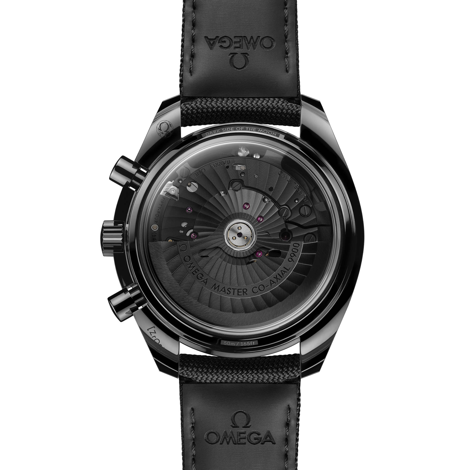 Das durch den Gehäuseboden sichtbare OMEGA Co-Axial Master Chronometer Kaliber 9900 mit Automatikaufzug ist mit einem mattgeschwärzten Rotor, einer Hauptplatine und Brücken sowie schwarz lackierten Gravuren veredelt. Die Uhr wird an einem schwarzen Nylonarmband getragen und ist mit einer Faltschließe aus Keramik und Federklappen aus keramisiertem Titan ausgestattet.
