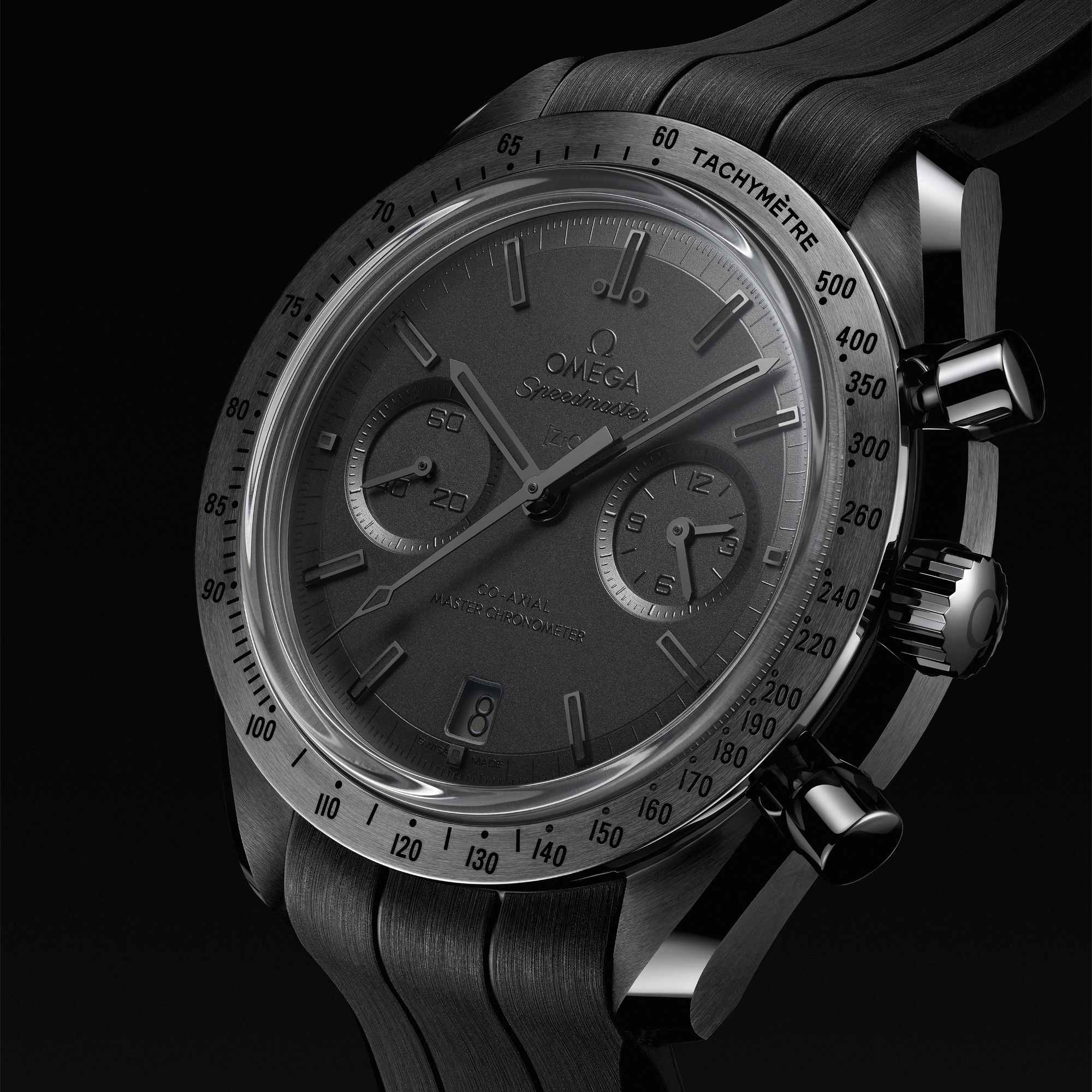 Das durch den Gehäuseboden sichtbare OMEGA Co-Axial Master Chronometer Kaliber 9900 mit Automatikaufzug ist mit einer speziellen „Black Edition“-Veredelung versehen, die einen mattgeschwärzten Rotor, eine Hauptplatine und Brücken sowie schwarz lackierte Gravuren umfasst. Die Uhr wird an einem schwarzen Kautschukarmband getragen und ist mit einem Mondoberflächenmuster auf der Unterseite, einer Faltschließe aus keramisiertem Titan ausgestattet.