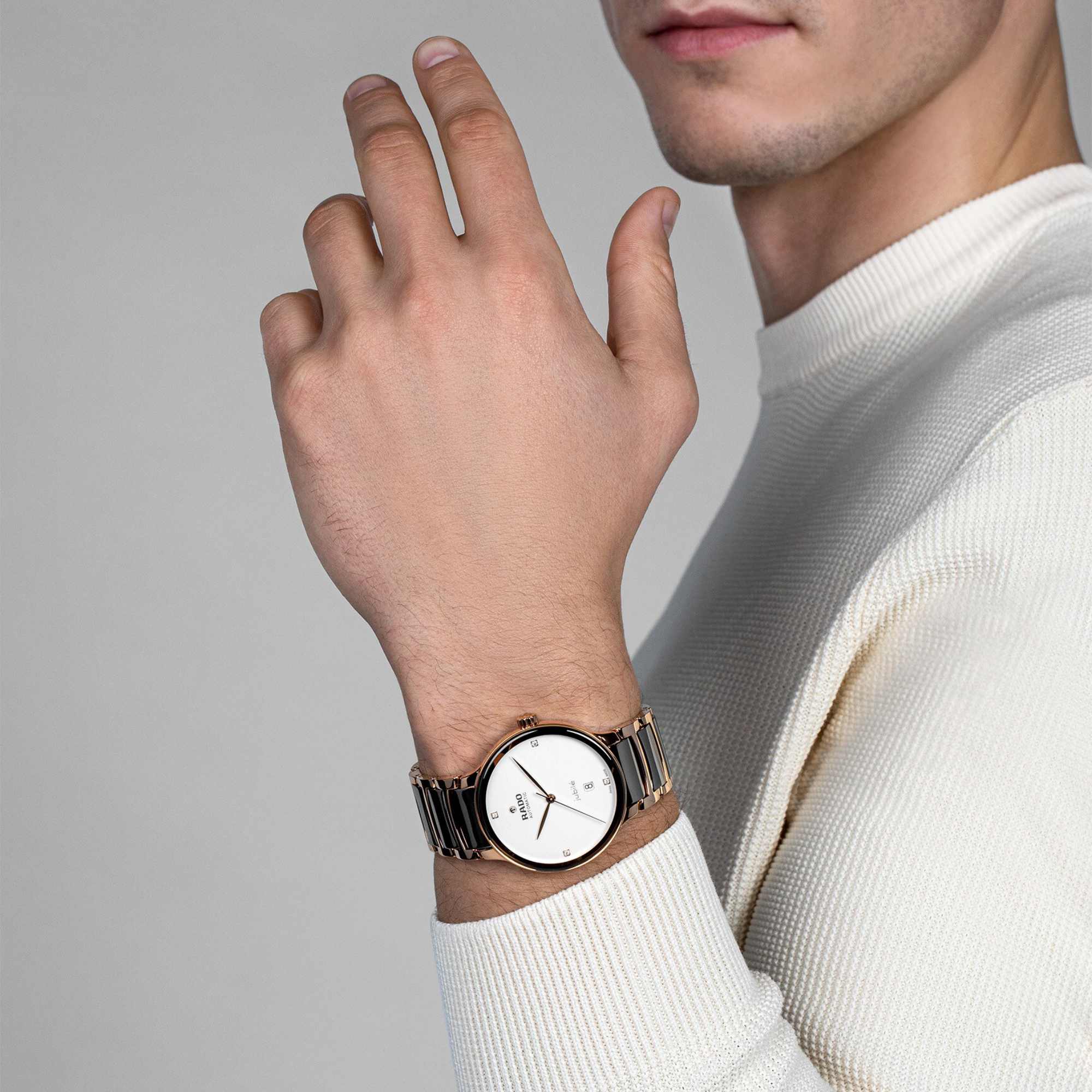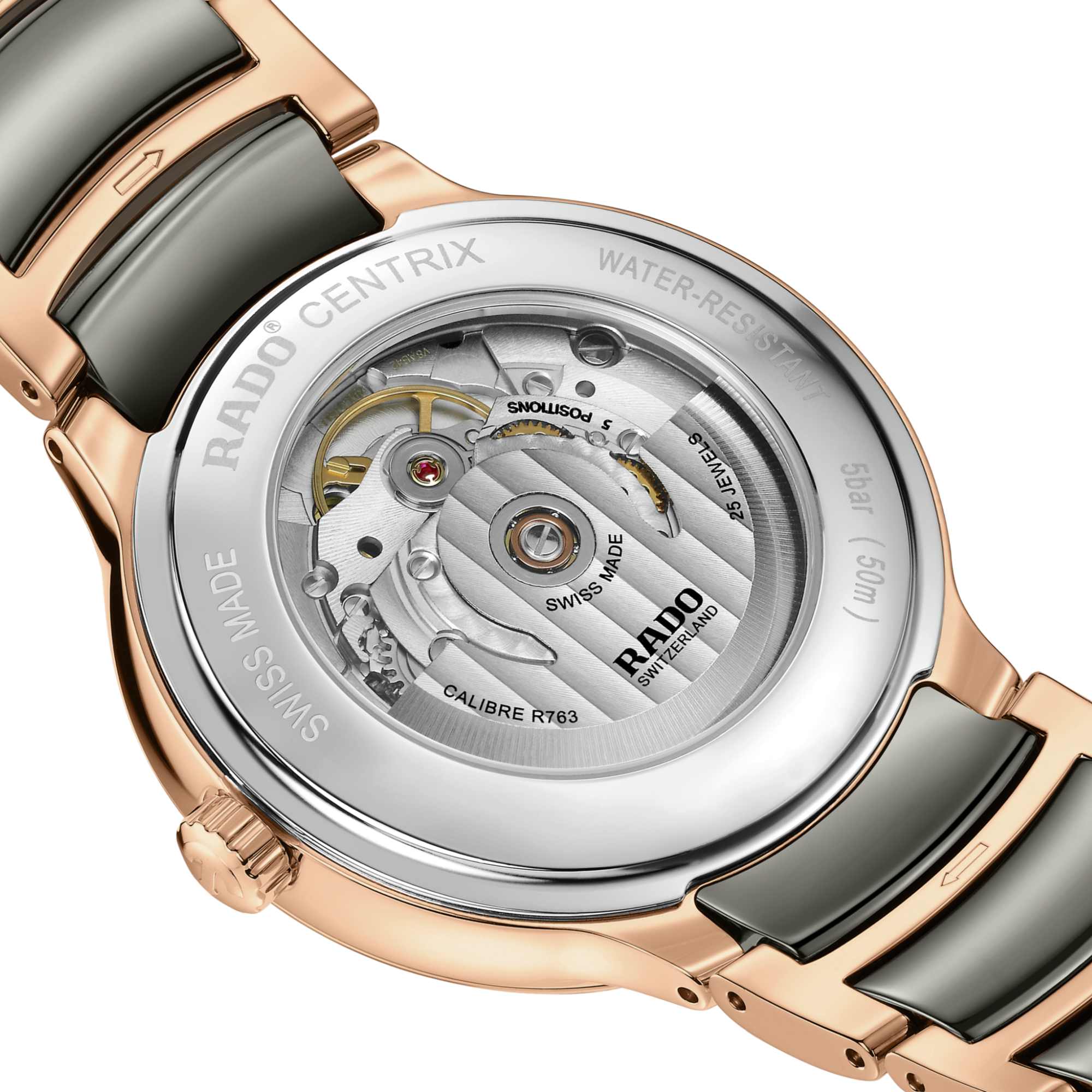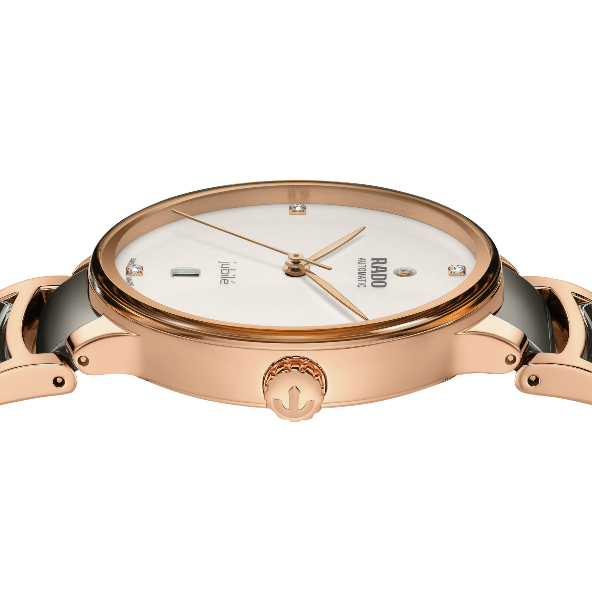 Ref. R30017722 - Die klassische Centrix Automatic Diamonds wurde nicht nur technisch, sondern auch ästhetisch überarbeitet. Beim neuen Modell reicht das abgerundete Saphirglas bis hin zum Rand. Außerdem geht das gewölbte Gehäuse nahtlos in den geschwungenen Kristallrand über. Die Gesamtoptik dieses ikonischen Zeitmessers wird durch überarbeitete Bandanstöße am Gehäuse und ein Armband aus poliertem roségoldfarbenen Edelstahl mit PVD-Beschichtung und Mittelgliedern aus Plasma-Hightech-Keramik abgerundet.