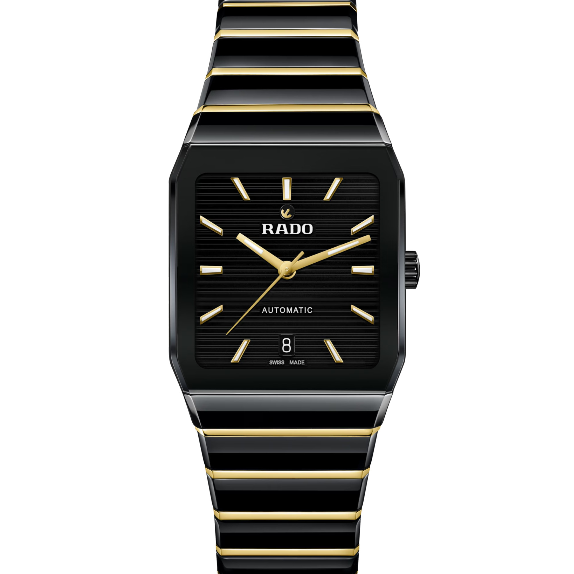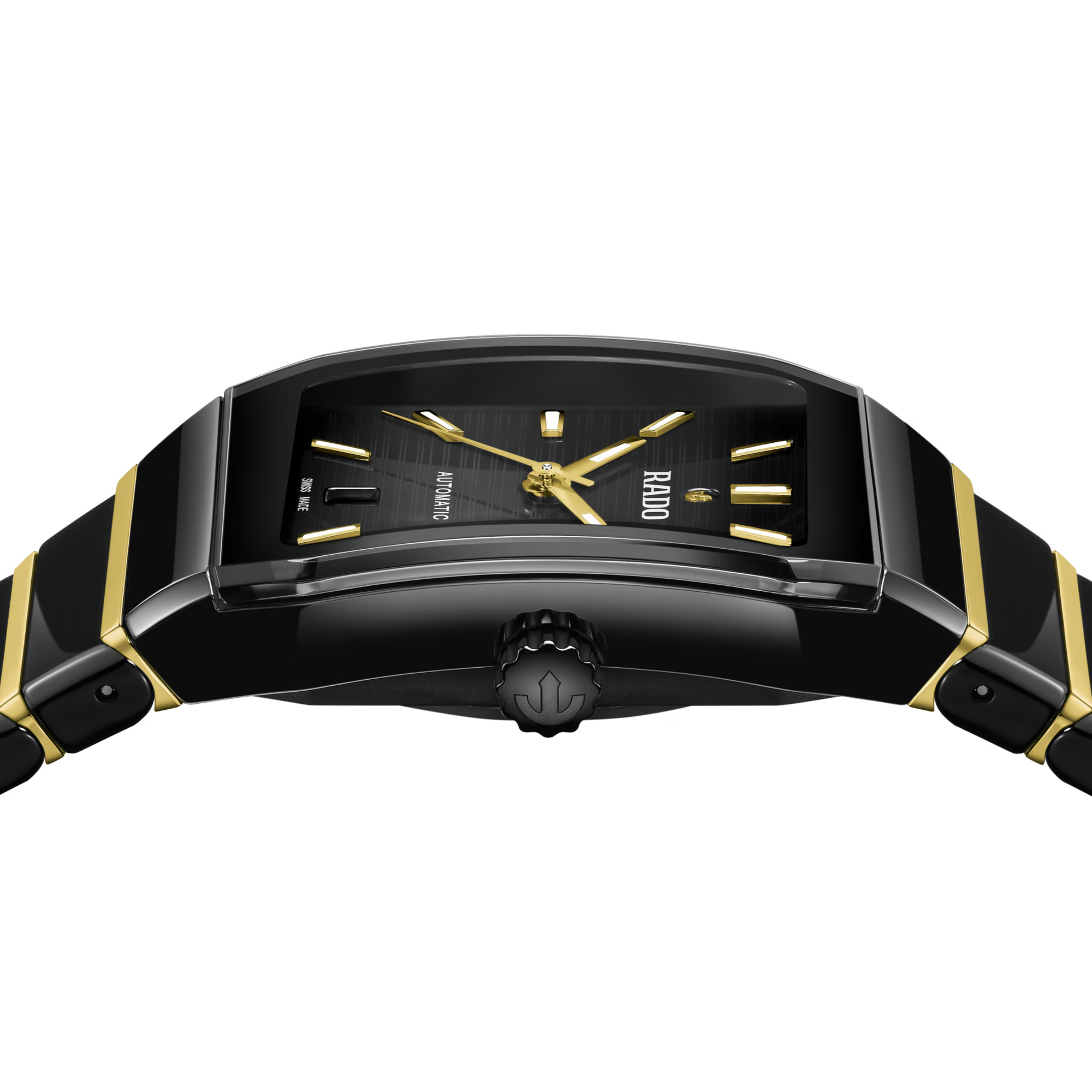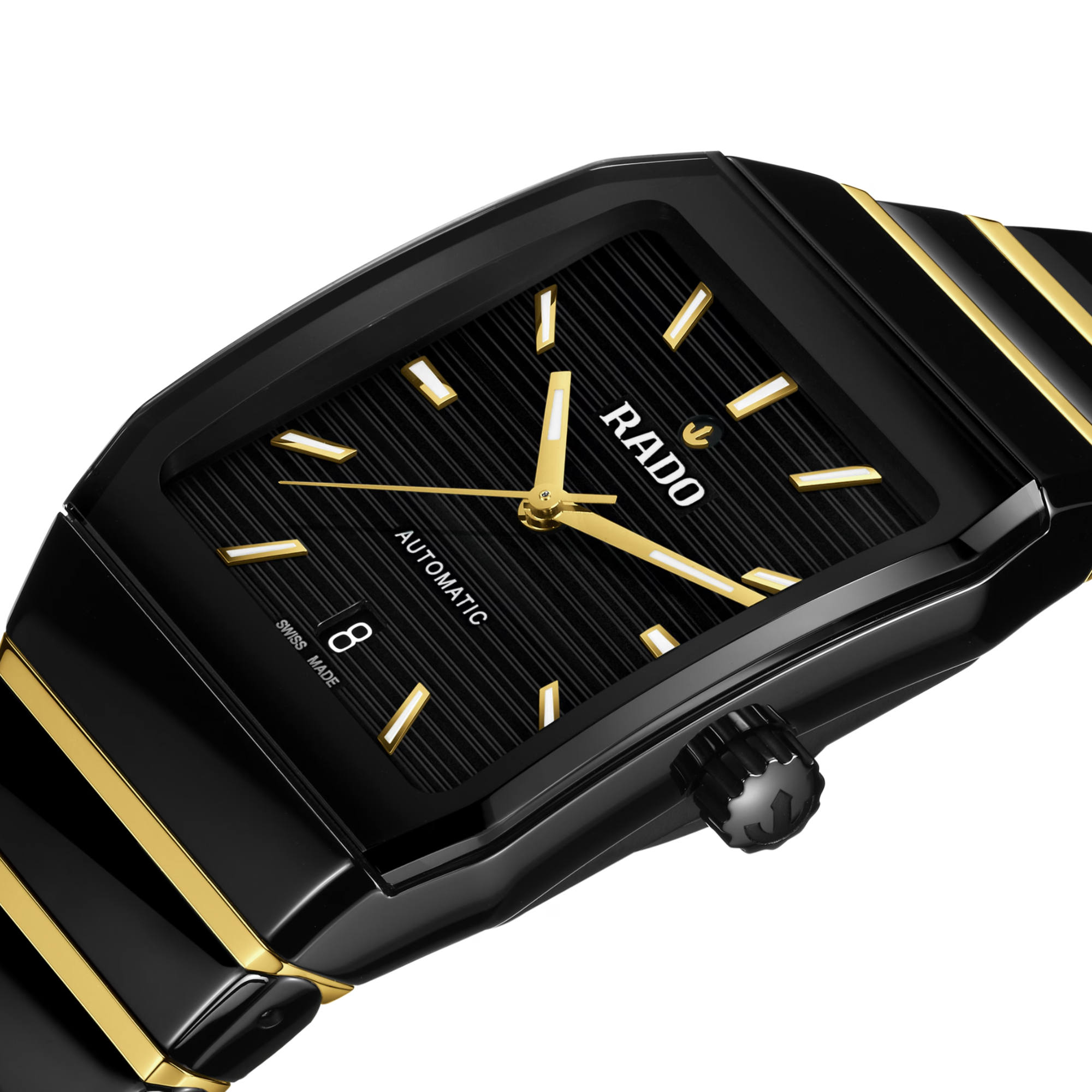 Das aus polierter schwarzer Hightech-Keramik und Mittelgliedern aus poliertem gelbgoldfarbenen PVD-Edelstahl gefertigte Armband wird durch eine Dreifachschliesse aus gebürstetem Edelstahl sorgfältig gesichert. Unter dem markanten Glas liegt ein schwarz lackiertes Zifferblatt, das ein attraktives Muster aus horizontalen Linien aufweist. Die mit weissem Super-LumiNova® versehenen gelbgoldfarbenen Zeiger und Indizes bilden einen raffinierten Kontrast, der dem Zifferblatt zusätzlich Tiefe verleiht. Gekrönt wird das Zifferblatt mit dem ikonischen beweglichen Anker bei 12 Uhr, ergänzt durch ein diskretes Datumsfenster bei 6 Uhr. Herzstück der Uhr ist das Automatikwerk Kaliber R766 mit 21 Steinen, das durch den Gehäuseboden aus Saphirglas zu sehen ist. Das in fünf Lagen fein justierte Uhrwerk ist mit einer Nivachron™ Spiralfeder ausgestattet und bietet eine hohe Ganggenauigkeit sowie eine robuste Gangreserve von 72 Stunden. Dies unterstreicht den hohen Stellenwert, den Rado der Perfektion beimisst.