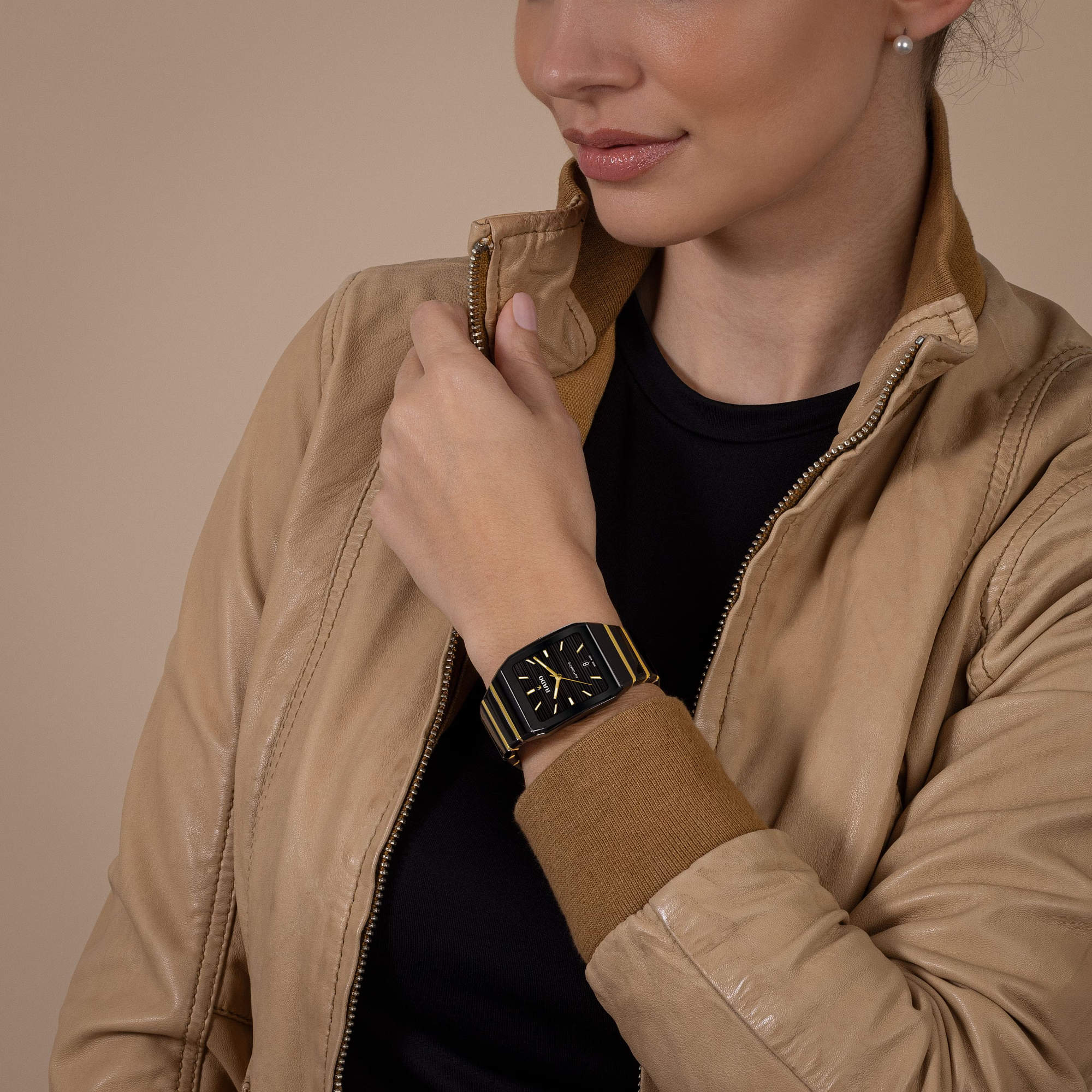Edelstahl, poliert mit gelbgoldfarbener PVD Beschichtung und Mitgliedern aus schwarzer Hightech-Keramik
