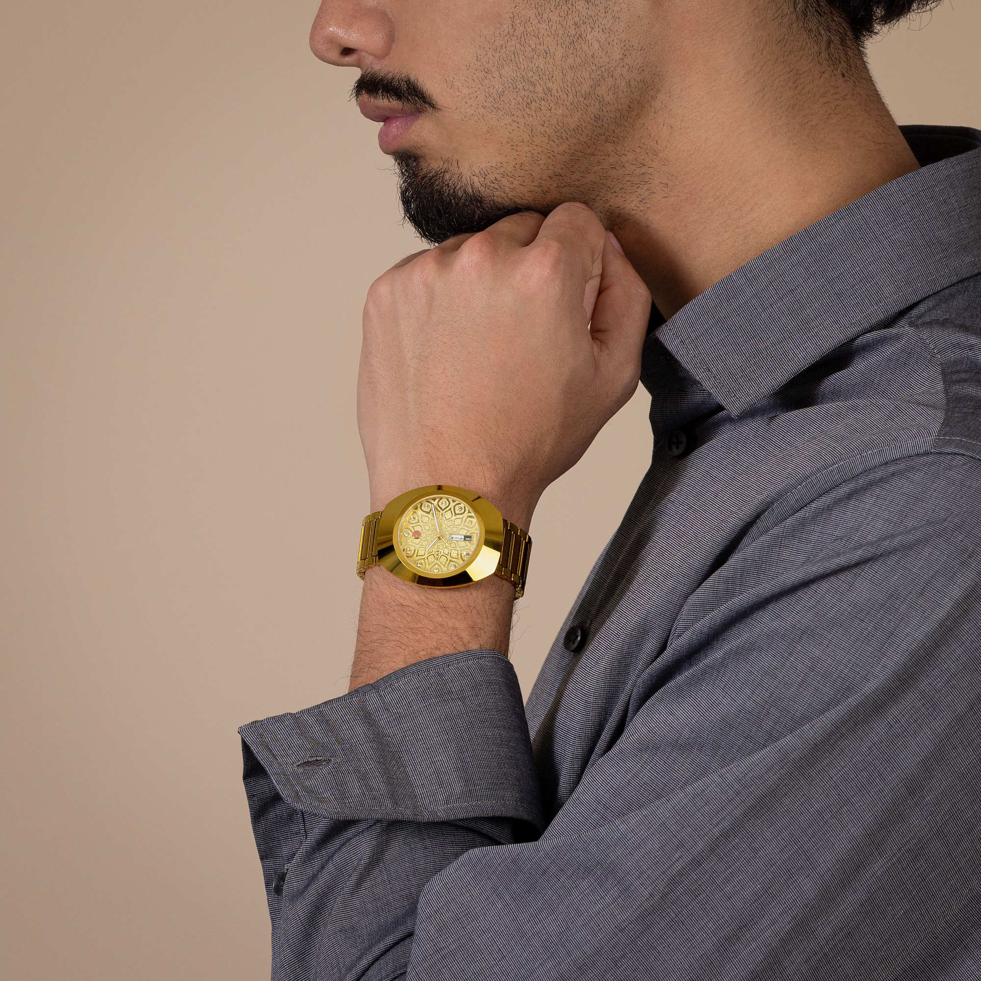 Ref. R12161633 - Der einzigartige DiaStar Original hat einen Durchmesser von 38 mm und ist bis zu 100 m wasserdicht. Umrahmt von einer ultra-glänzenden, gelbgoldfarbenen Ceramos™-Lünette mit polierten Kanten und Details, die über einem passenden, gelbgoldfarbenen PVD-beschichteten Edelstahlgehäuse angebracht ist, wird diese wunderschöne Uhr mit einem vertikal facettierten Saphirglas abgerundet. Die Spezifikationen umfassen gelbfarbene Zeiger mit weißem Super-LumiNova® sowie eine weiße Tagesanzeige und eine schwarze Datumsanzeige. Das Zifferblatt ist mit elf hellen Zirkoniasteinen auf einem gelbfarbenen harmonischen Muster mit Diamantstaubdekoration versehen. Das Rado R764 Automatikwerk bietet eine Gangreserve von 80 Stunden und ist mit einer antimagnetischen Nivachron™-Unruhfeder ausgestattet. Das Armband besteht aus poliertem und gebürstetem Edelstahl, das mit gelbgoldfarbenem PVD beschichtet ist.