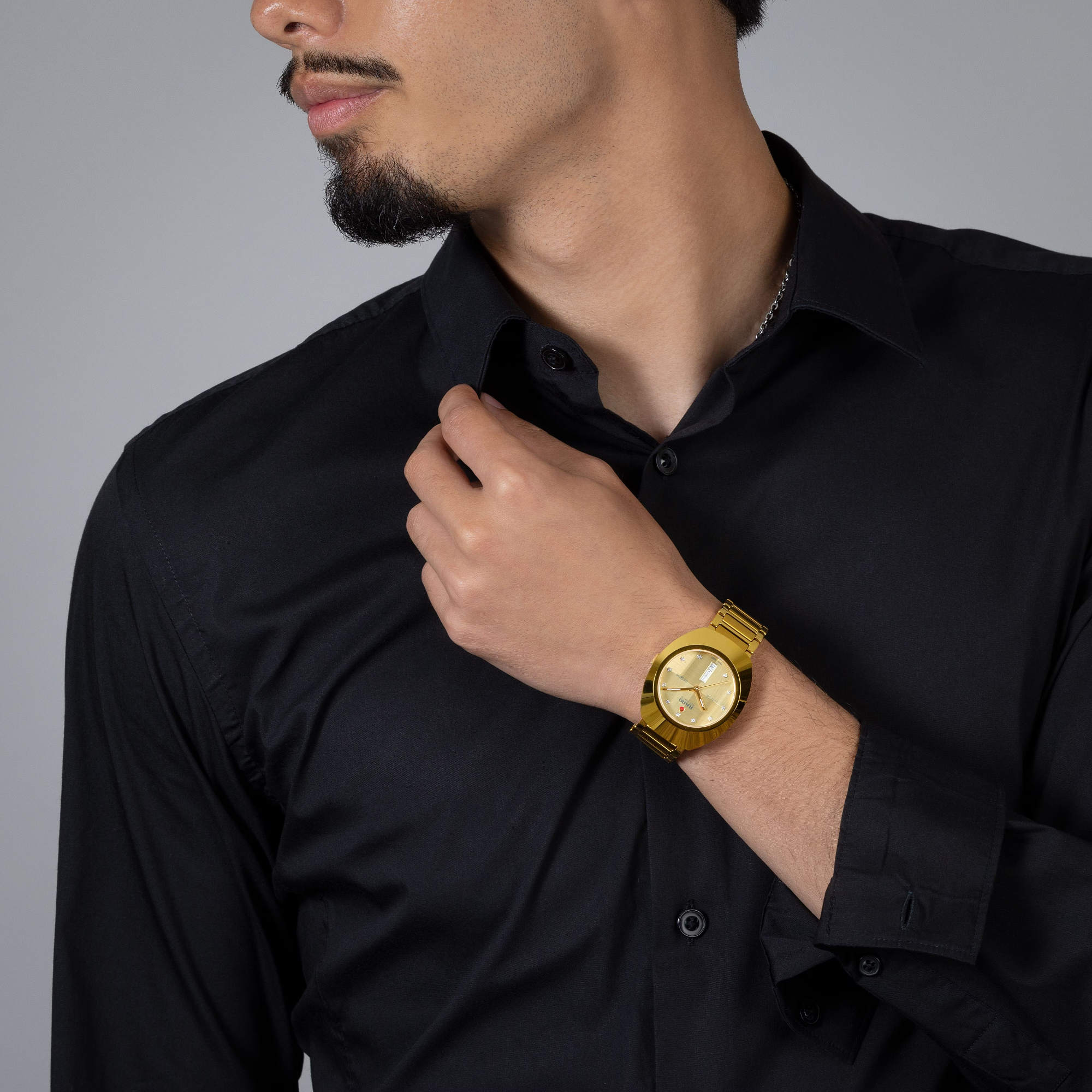 Ref. R12161733 - Die einzigartige DiaStar Original hat einen Durchmesser von 38 mm und ist bis zu einer Tiefe von 100 m wasserdicht. Eingerahmt von einer breiten Lünette aus hochglänzendem gelbgoldfarbenen Ceramos™ mit geschliffenen Schrägen und Details über einem dazu passenden Gehäuse aus Edelstahl mit gelbgoldfarbener PVD-Beschichtung wird diese schöne Uhr mit einem facettierten Saphirglas mit parallelem Streifenmuster perfekt abgerundet. Zu den Merkmalen der Uhr gehören zudem ein goldfarbenes, in zwei Richtungen gebürstetes Zifferblatt, gelbgoldfarbene Zeiger mit weissem Super-LumiNova® und eine Wochentags- und Datumsanzeige, ebenfalls in Weiss. Ihr Zifferblatt ist mit elf Diamanten mit Brillantschliff ausgestattet, worauf mit dem dunkelgrauen Jubilé-Logo hingewiesen wird. Das Rado R764 Automatikwerk mit antimagnetischer Nivachron™ Spiralfeder bietet eine Gangreserve von 80 Stunden. Das Armband ist aus poliertem und satiniertem Edelstahl mit gelbgoldfarbener PVD-Beschichtung gefertigt.