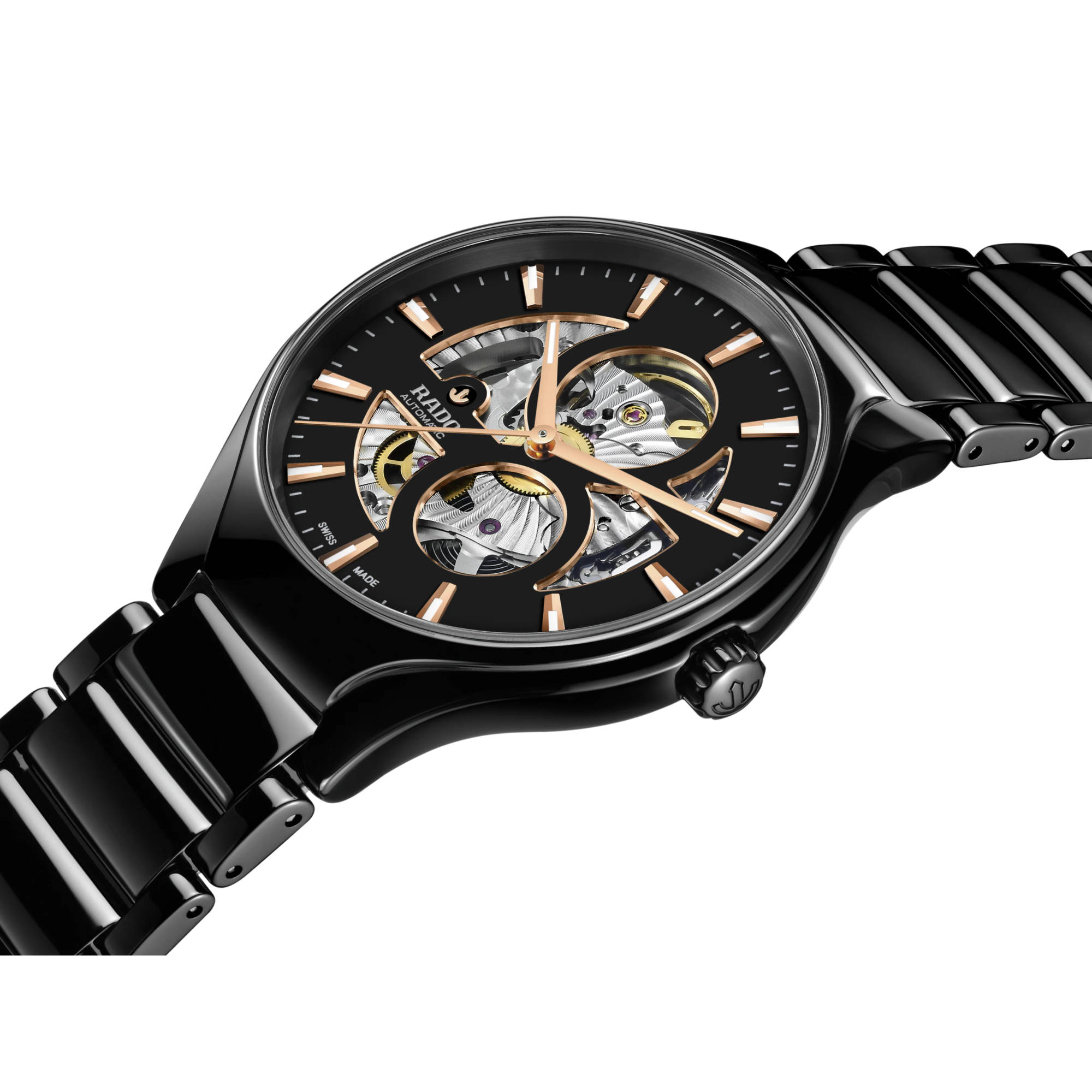 Ref. R27107172 - Mit der Rado True Round Open Heart erleben Sie die perfekte Verbindung von exzellentem Design und meisterhafter Materialbeherrschung. Dieser bemerkenswerte Zeitmesser besticht durch sein bezauberndes Open-Heart-Design mit durchbrochenem Zifferblatt, durch das man die komplexe Mechanik des Rado Automatikwerks Kaliber R734 bewundern kann. Das Modell ist zudem mit einer antimagnetischen Nivachron™ Spiralfeder ausgestattet und bietet eine Gangreserve von 80 Stunden. Es verfügt über ein Monobloc-Gehäuse und eine Krone aus polierter schwarzer Hightech-Keramik und einen Gehäuseboden aus schwarzem PVD-Titan mit eingelassenem Saphirglas, das einen ungehinderten Blick auf das Uhrwerk freigibt.