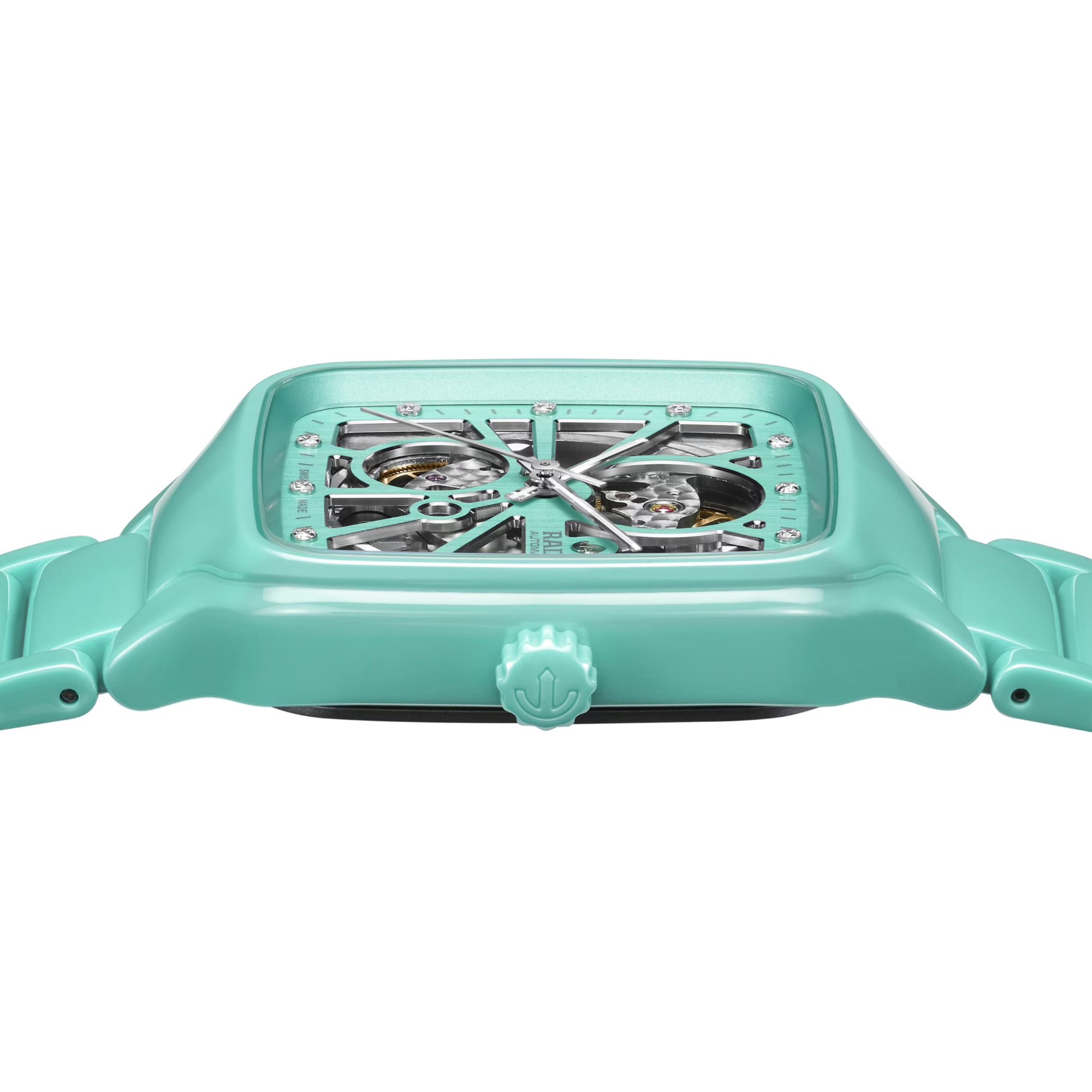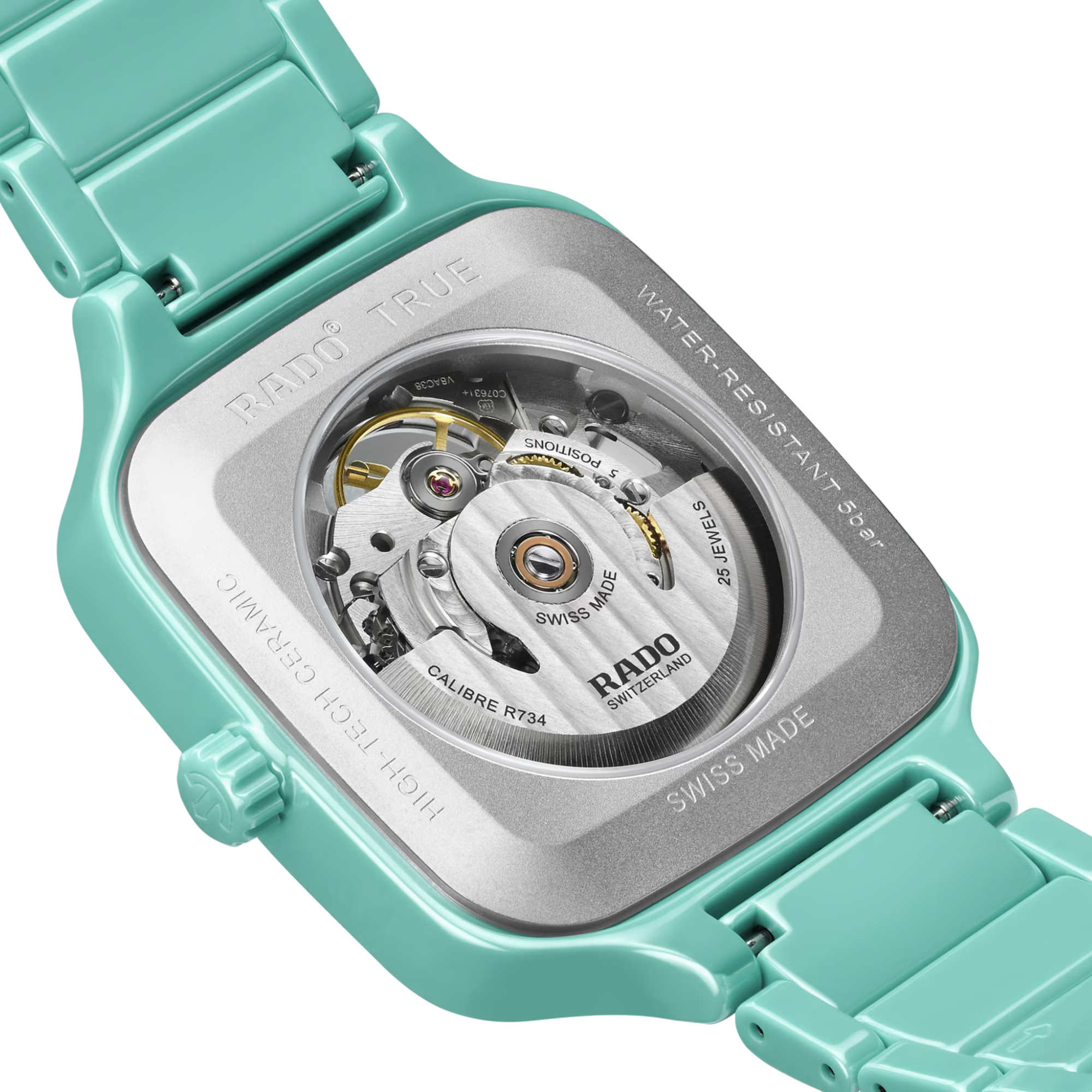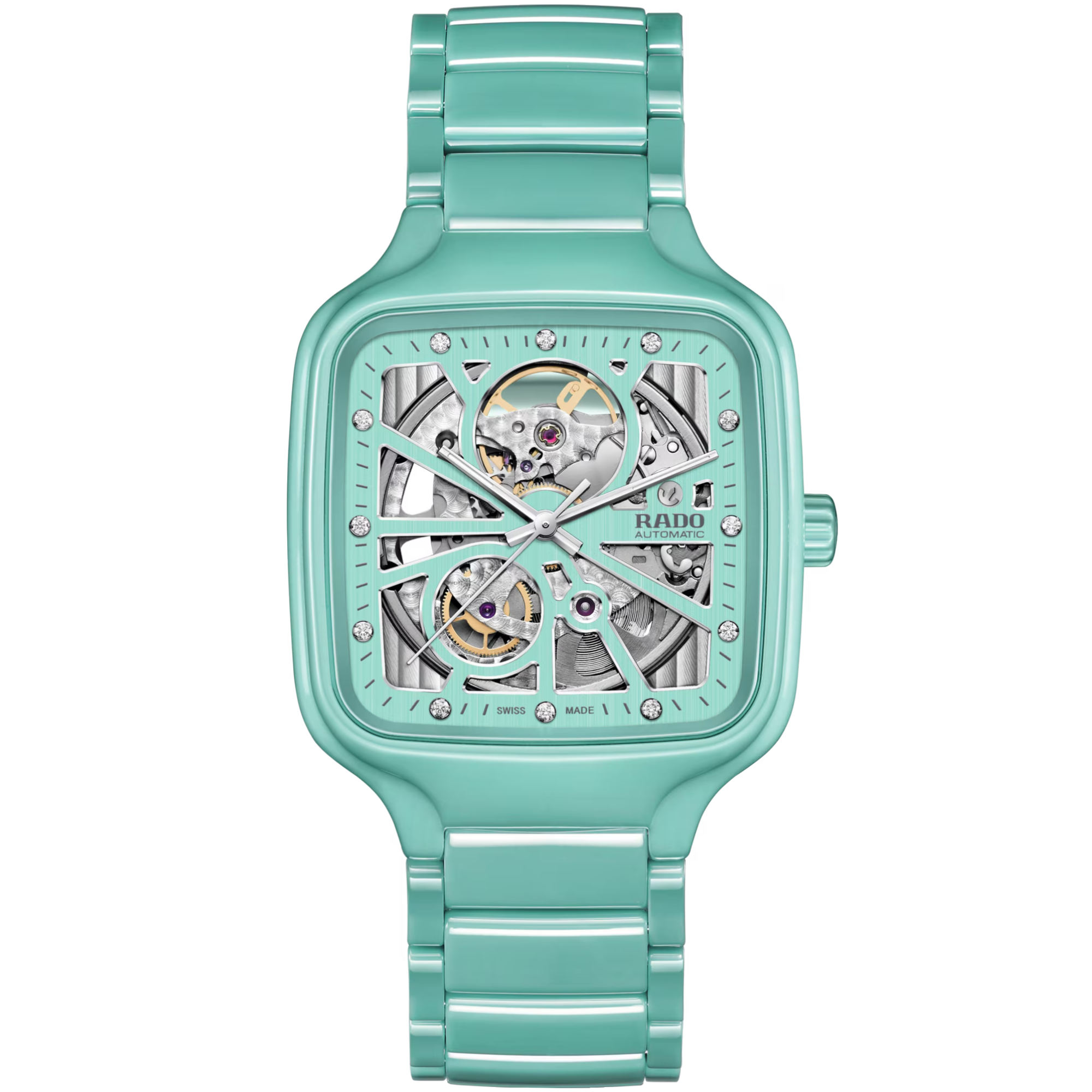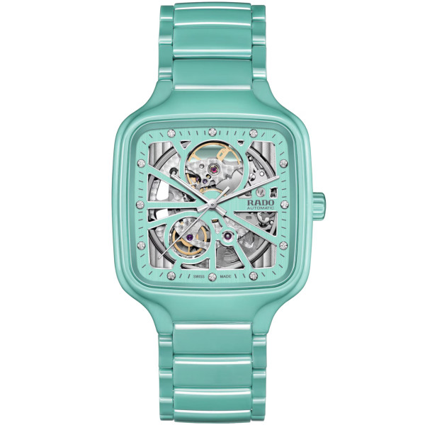Ref. R27176712 - Erleben Sie mit der Rado True Square Automatic Open Heart die perfekte Verbindung aus Kunstfertigkeit und Präzision. Dieser bemerkenswerte Zeitmesser besticht durch sein Open-Heart-Design mit skelettiertem Zifferblatt, durch das man die komplexe Mechanik des Rado Automatikwerks R734 mit 80 Stunden Gangreserve bewundern kann. Gehäuse und Krone dieses 38 mm grossen Modells sind aus türkisfarbener Hightech-Keramik gefertigt, die der Uhr eine moderne und zeitgemässe Ausstrahlung verleiht. Das flache Saphirglas mit beidseitiger Antireflexionsbeschichtung ermöglicht eine besonders klare Sicht.. Silberfarbene Facetten setzen Akzente auf dem türkisfarbenen Zifferblatt. Zwölf Diamanten verleihen einen Hauch von Luxus und Anmut. Die rhodiumfarbenen Zeiger mit weissem Super-LumiNova® sorgen für eine hervorragende Ablesbarkeit und fügen sich in die elegante Optik ein. Das Ensemble wird durch ein Armband aus polierter türkisfarbener Hightech-Keramik abgerundet, das Komfort und Langlebigkeit bietet.