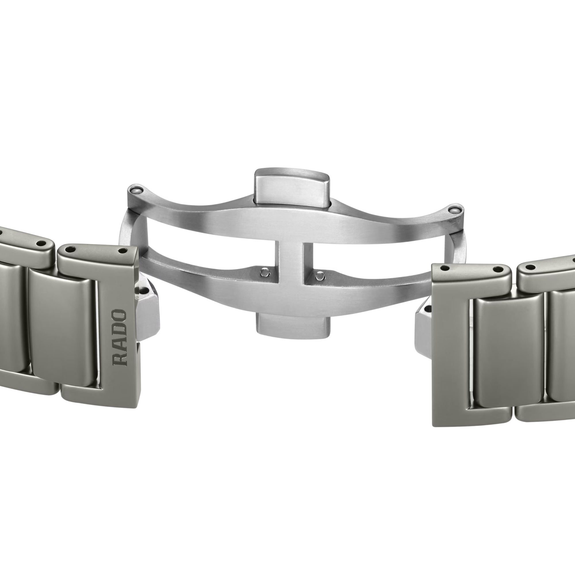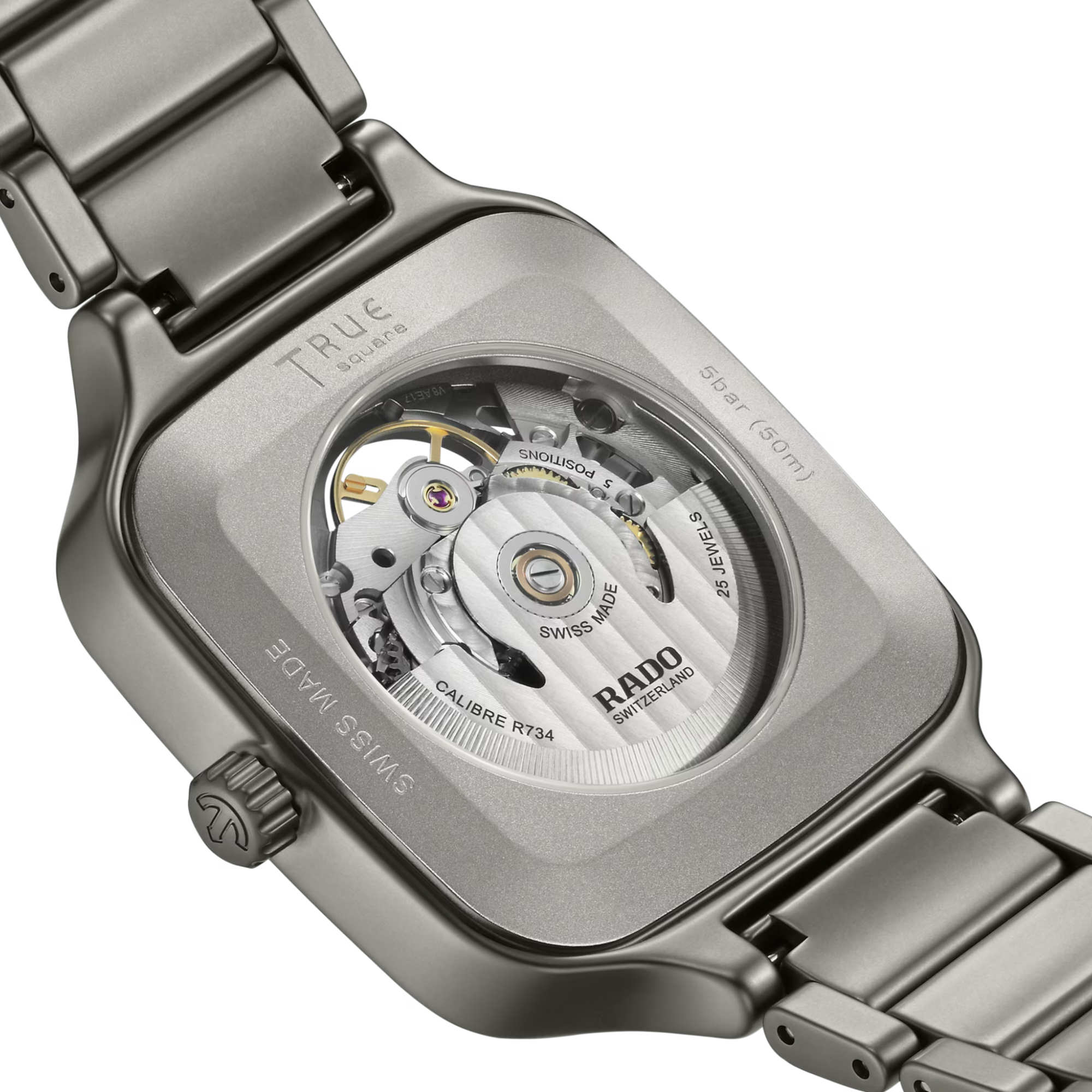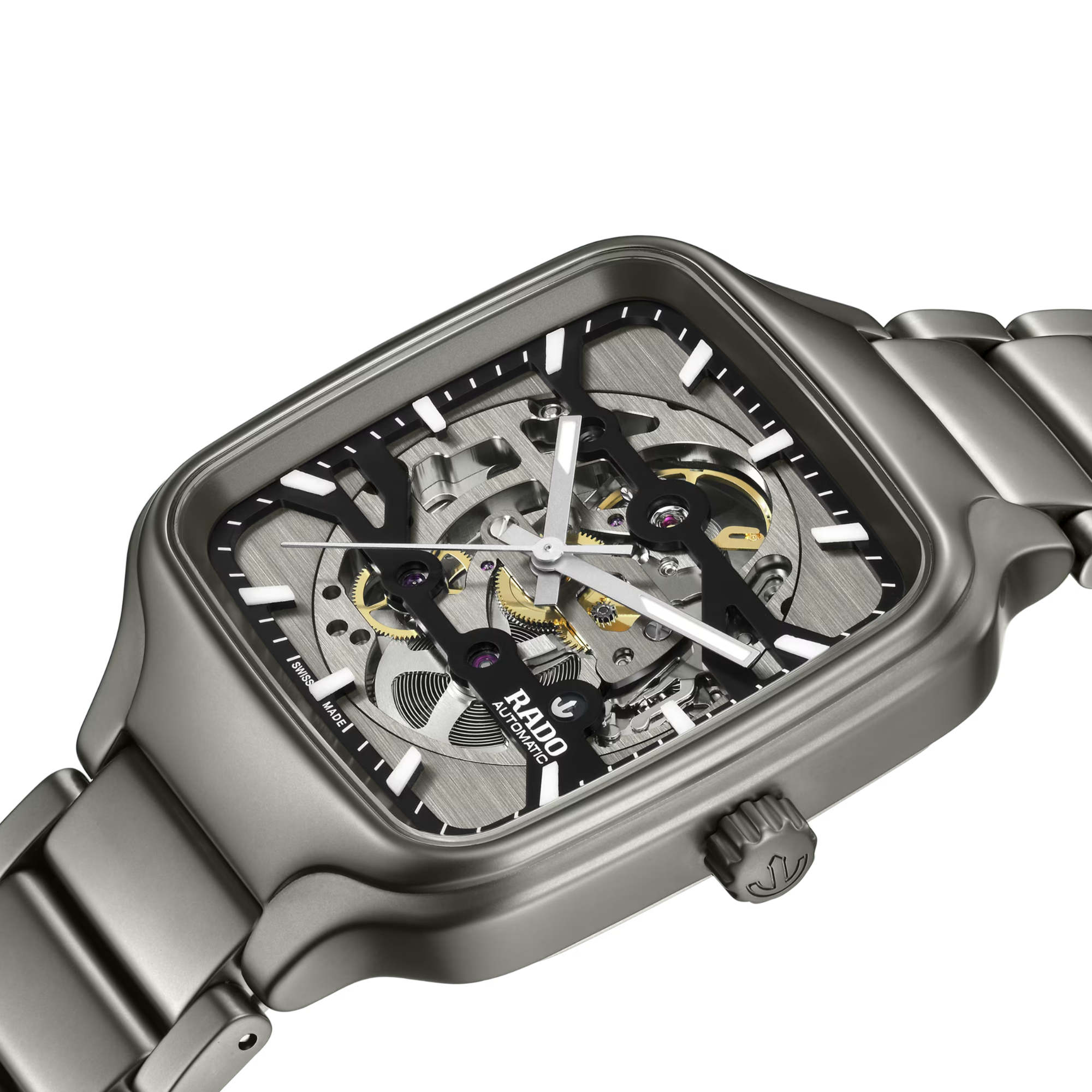 Ref. R27196152 - Die Rado True Square Skeleton vereint komplexe Hightech-Materialien mit feinster Handwerkskunst. Das skelettierte Uhrwerk R808 ist mit 25 Steinen ausgestattet und bietet eine Gangreserve von 80 Stunden. Untergebracht ist es in einem 38 mm grossen Monobloc-Gehäuse aus matter Plasma-Hightech-Keramik. Es wurde in fünf Lagen getestet und verfügt über eine antimagnetische Nivachron™ Spiralfeder sowie horizontal gebürstete Zierelemente auf der Zifferblattseite. Damit ist dieses Uhrwerk ein perfektes Beispiel für die traditionsreiche Schweizer Präzision. Das von einem flachen Saphirglas gekrönte Zifferblatt ist eine Kombination vielschichtiger Handwerkskunst. Die schwarze, sandgestrahlte, skelettierte obere Platine schwebt über der unteren Platine, wobei die obere Platine mit präzise positionierten Indizes mit weissem SuperLumiNova® und einer sorgfältig aufgetragenen weissen Minutenteilung ausgestattet ist, die vor dem dunklen Hintergrund hervorragend abgelesen werden können.