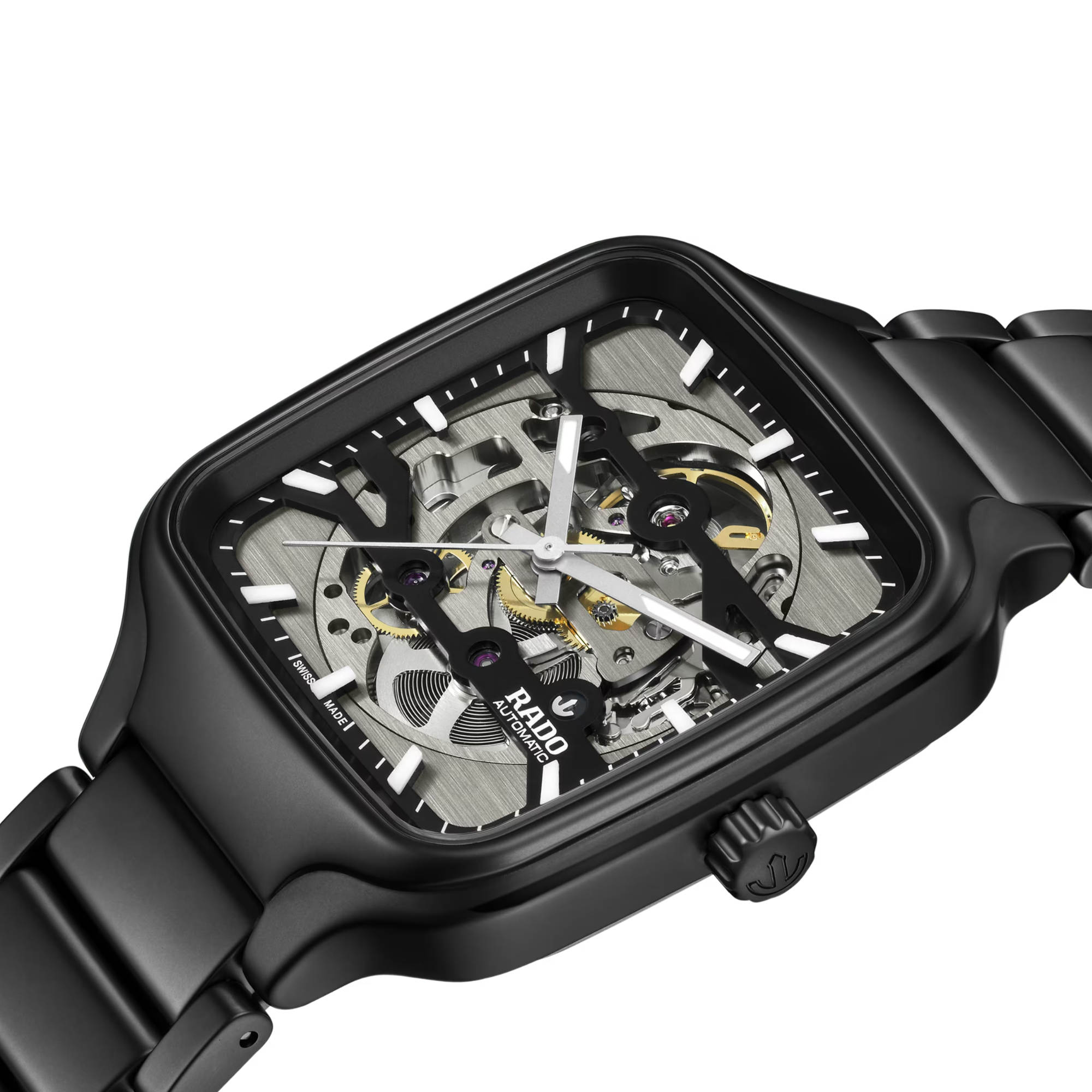 Ref. R27197152 - Die Rado True Square Skeleton vereint komplexe Hightech-Materialien mit feinster Handwerkskunst. Das skelettierte Uhrwerk R808 ist mit 25 Steinen ausgestattet und bietet eine Gangreserve von 80 Stunden. Untergebracht ist es in einem 38 mm grossen Monobloc-Gehäuse aus mattschwarzer Hightech-Keramik. Es wurde in fünf Lagen getestet und verfügt über eine antimagnetische Nivachron™ Spiralfeder sowie horizontal gebürstete Zierelemente auf der Zifferblattseite.
