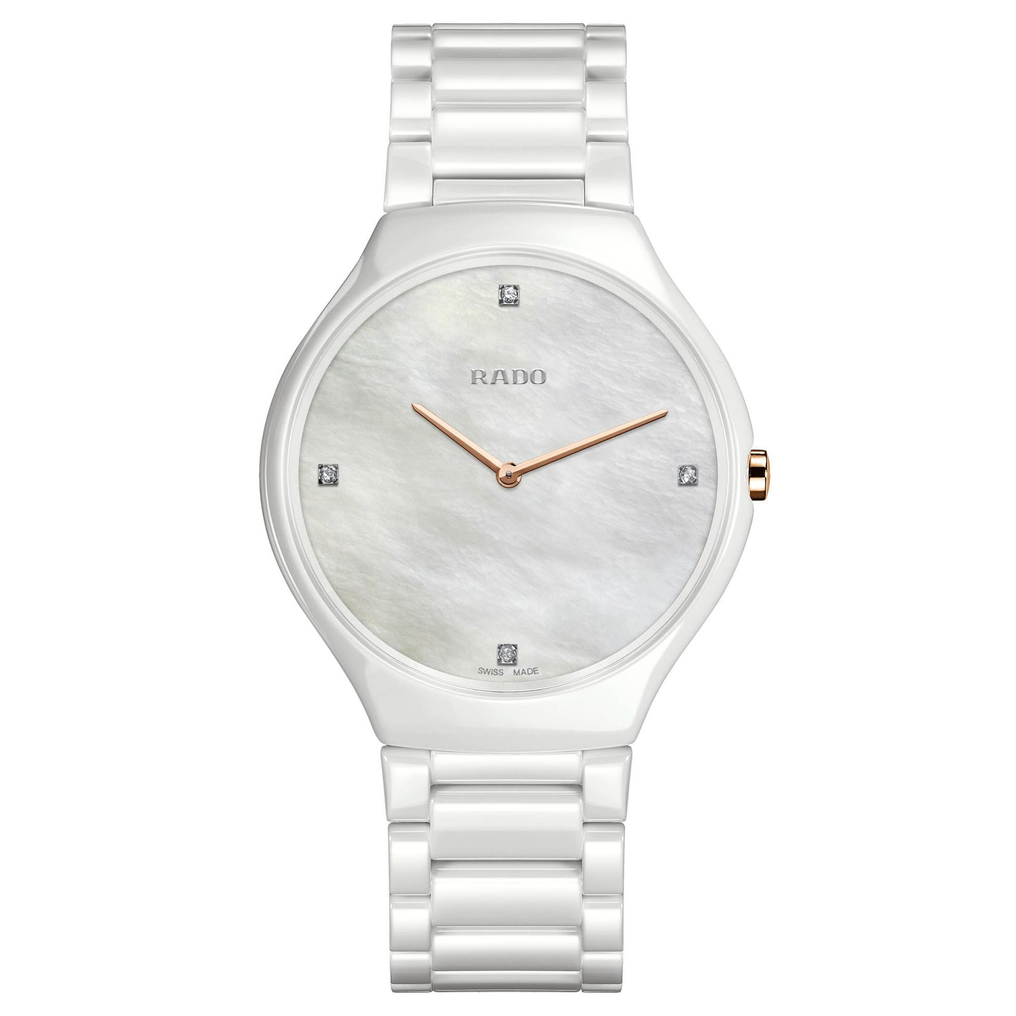 Ref. R27957909 - Die True Thinline könnte als der ultimative Rado Zeitmesser betrachtet werden. Die schlanken Quarzuhren fanden 2011 erstmals Eingang in die Kollektion. Sie sind nicht nur die flachsten Zeitmesser von Rado, sondern waren auch die ersten Modelle, die über das bahnbrechende Monobloc-Gehäuse aus Hightech-Keramik verfügen. Leicht, kratzfest und komfortabel zu tragen – und nun auch mit Diamanten zum Funkeln gebracht – überdauern diese Modelle garantiert die Zeit.
