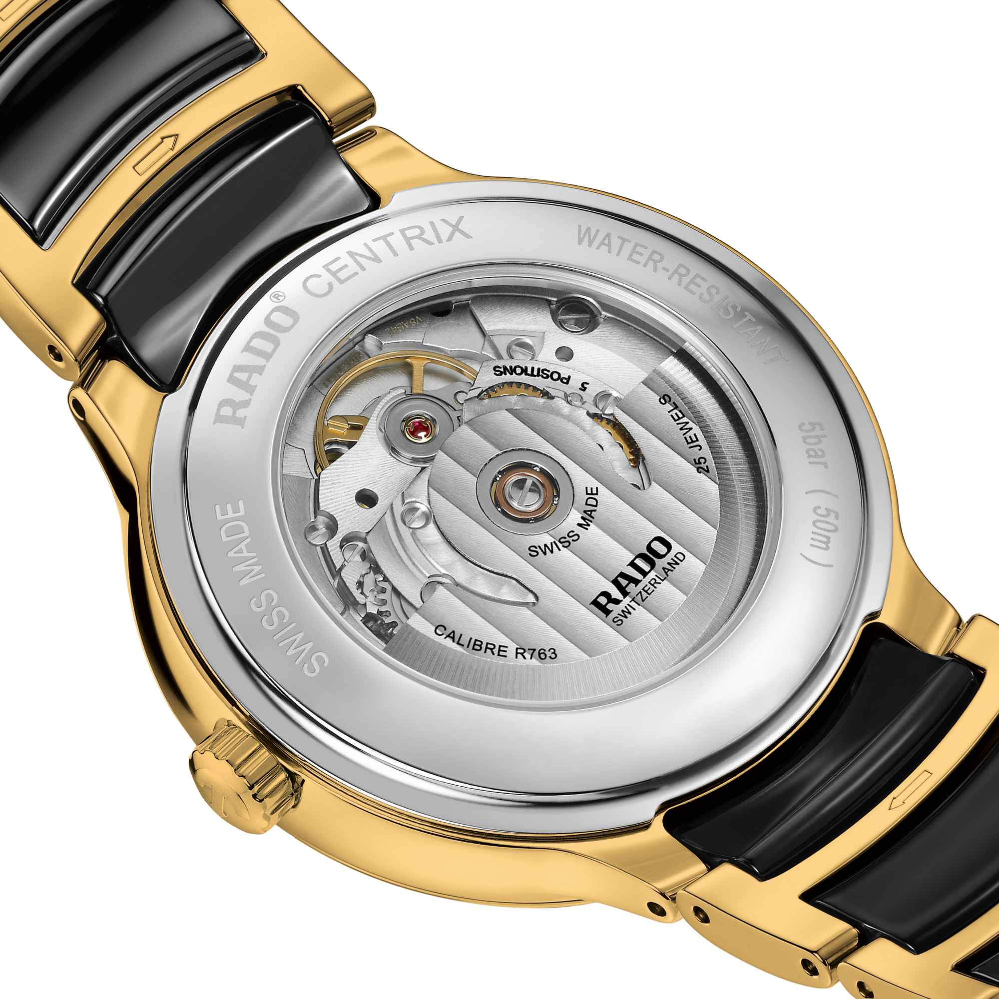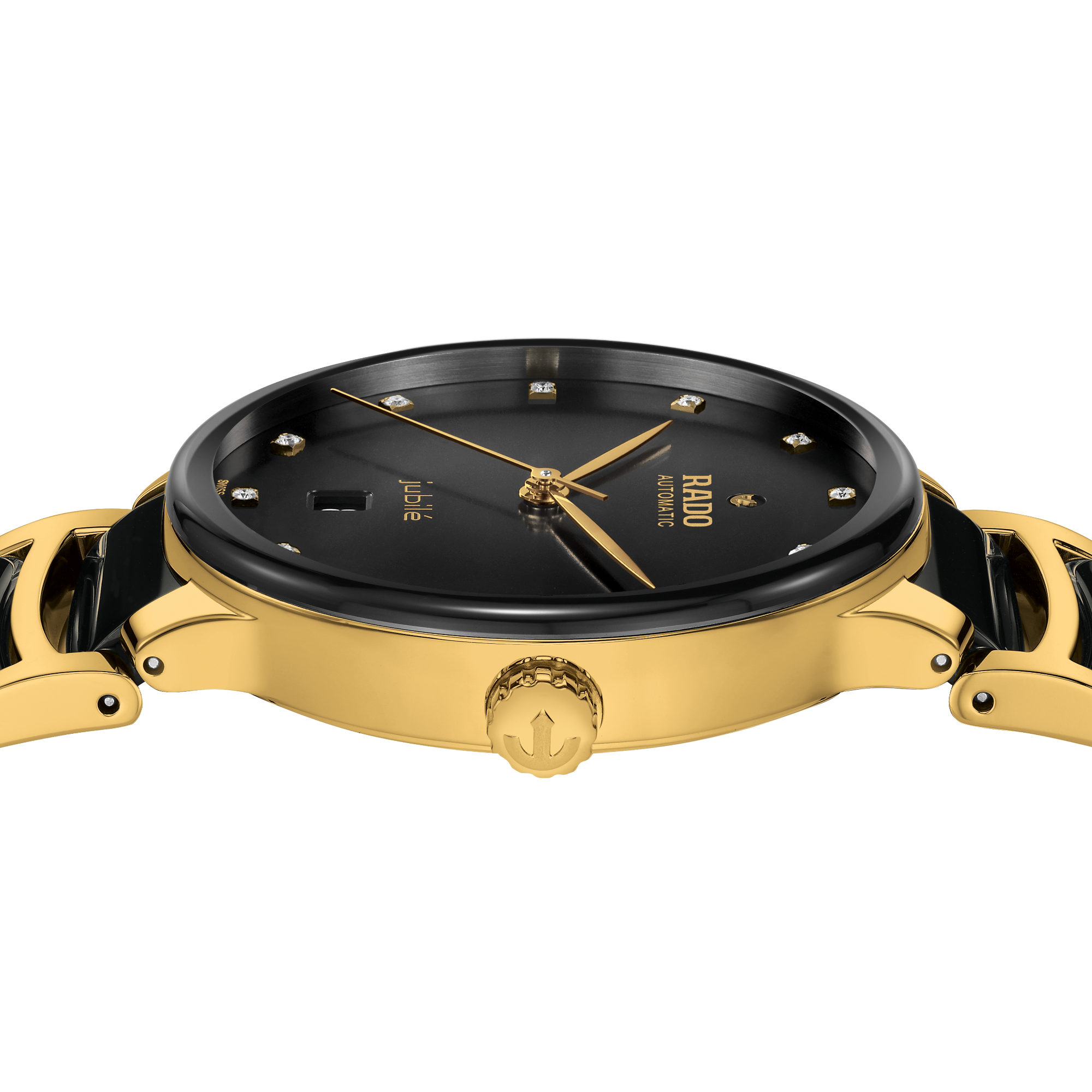 Ref. R30008742 - Die klassische Centrix Automatic Diamonds wurde nicht nur technisch, sondern auch ästhetisch überarbeitet. Beim neuen Modell reicht das abgerundete Saphirglas bis zum Rand und scheint beinahe nahtlos in das gewölbte Gehäuse überzugehen. , der nahtlos in das gewölbte Gehäuse übergeht. Die überarbeiteten Bandanstösse am Gehäuse und das Armband aus poliertem gelbgoldfarbenen Edelstahl mit Mittelgliedern aus schwarzer Hightech-Keramik runden das Gesamtbild dieses ikonischen Zeitmessers perfekt ab.