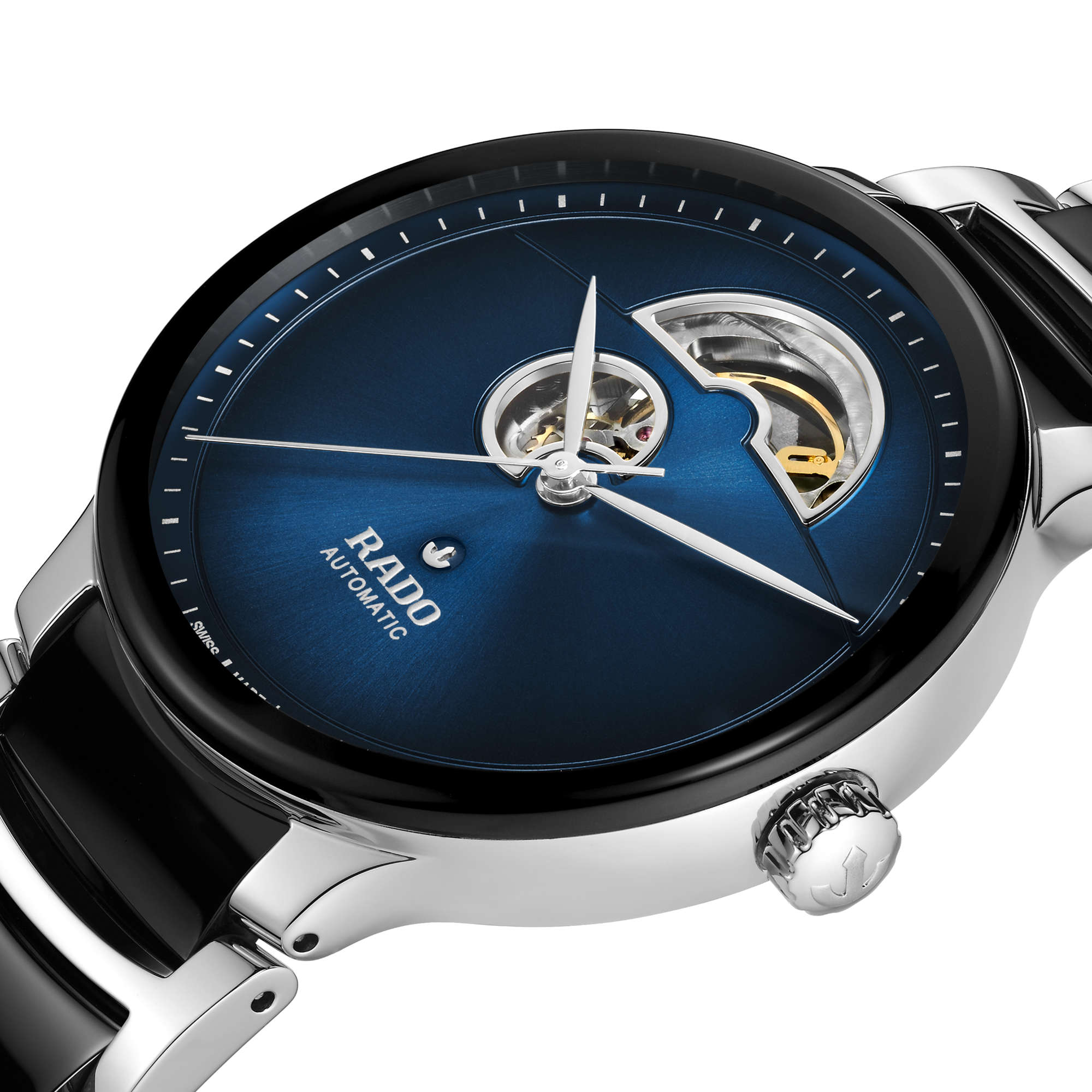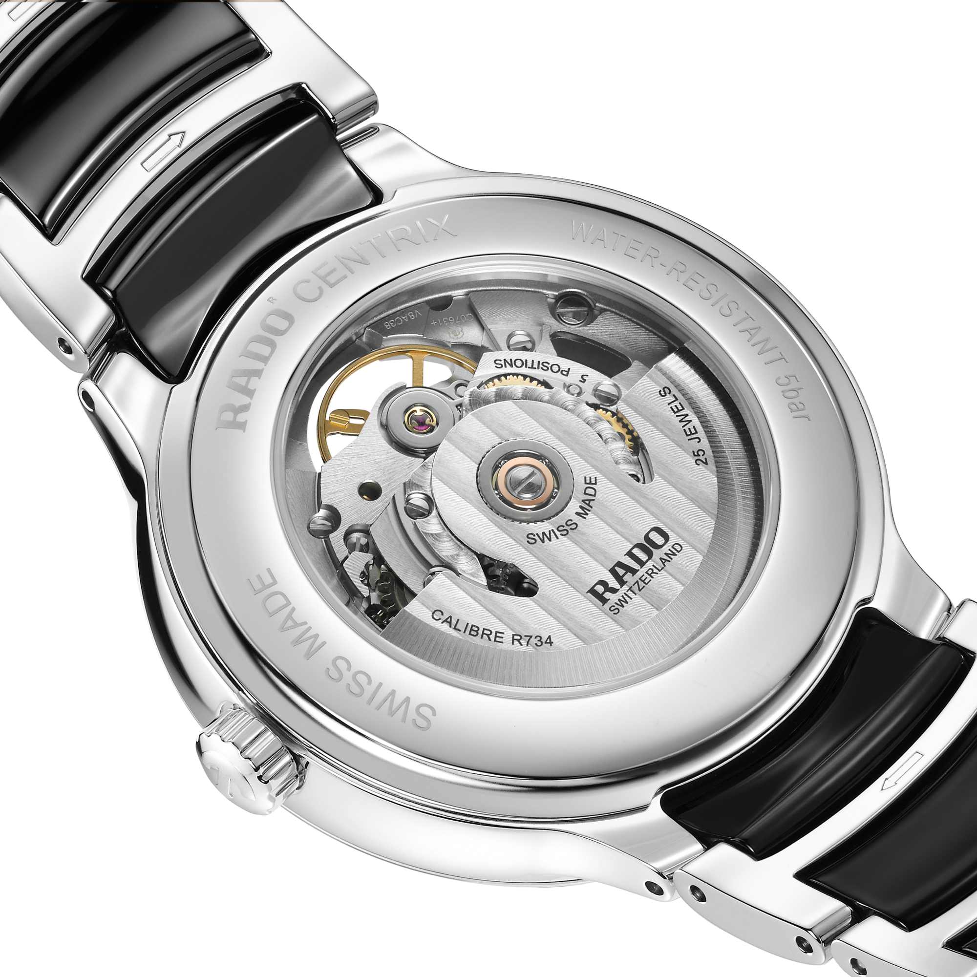 Ref. R30012202 - Entdecken Sie mit der Rado Centrix Automatic Open Heart das perfekte Gleichgewicht zwischen Innovation und Ästhetik. Im Herzen dieses Meisterwerks tickt das Rado Automatikwerk R734, das für makellose Präzision und Zuverlässigkeit sorgt. Mit einer beeindruckenden Gangreserve von 80 Stunden garantiert diese Uhr eine kontinuierliche Leistung. Die Präzision dieser Uhr wird durch die antimagnetische Nivachron™ Spiralfeder und ihre Einstellung in 5 Lagen weiter erhöht. Mit ihrem eleganten 39,5 mm grossen Gehäuse aus poliertem Edelstahl steht die Centrix Automatic Open Heart für minutiöse Handwerkskunst. Der Gehäuseboden aus poliertem Edelstahl ist mit einem Saphirglas ausgestattet und bietet einen Blick auf das faszinierende Innenleben der Uhr.