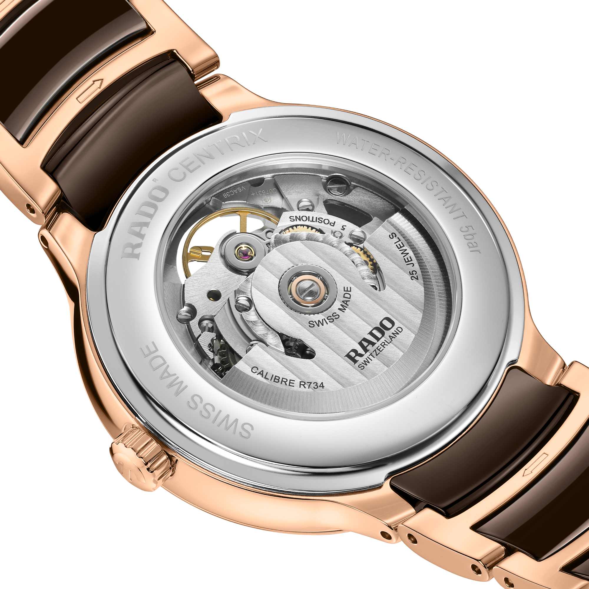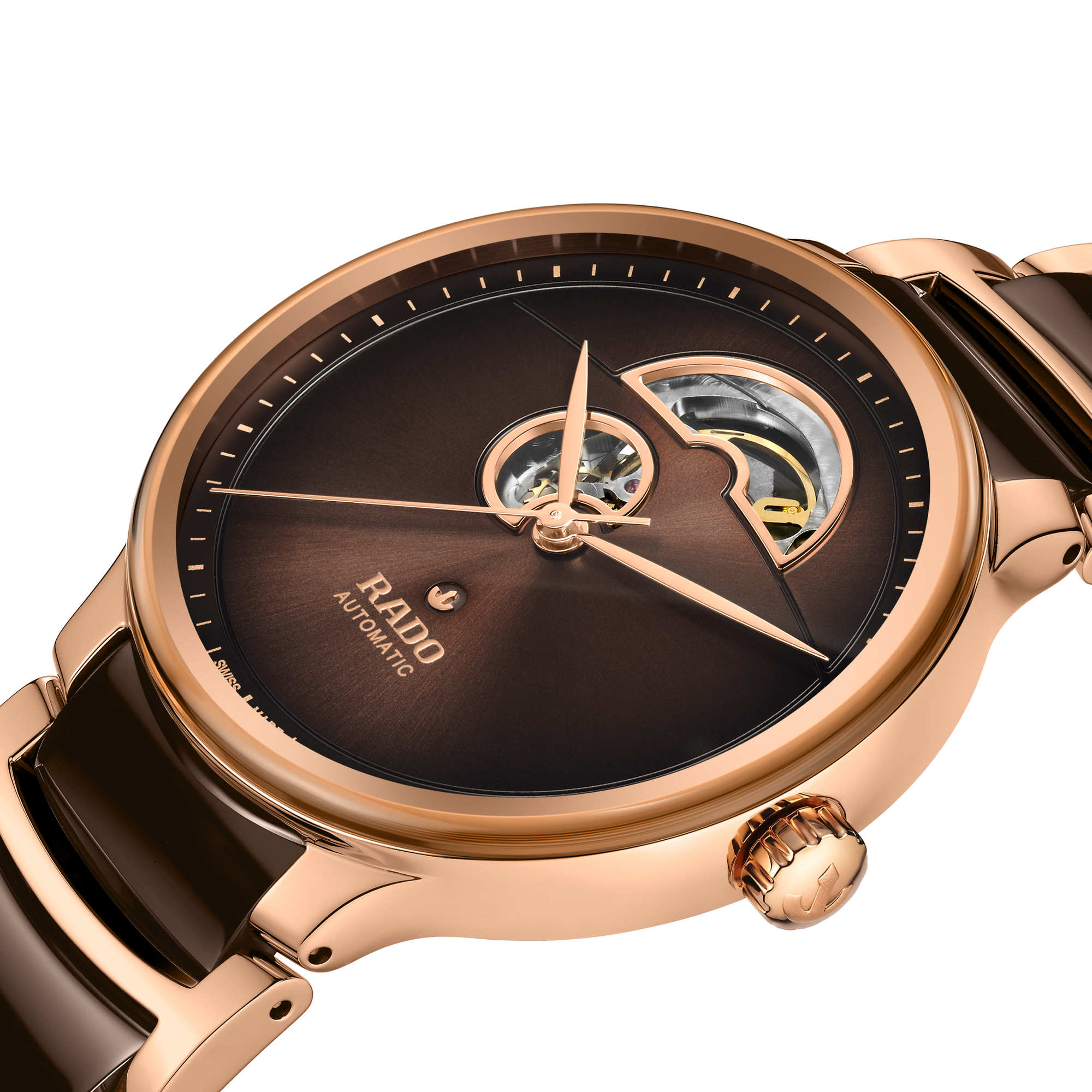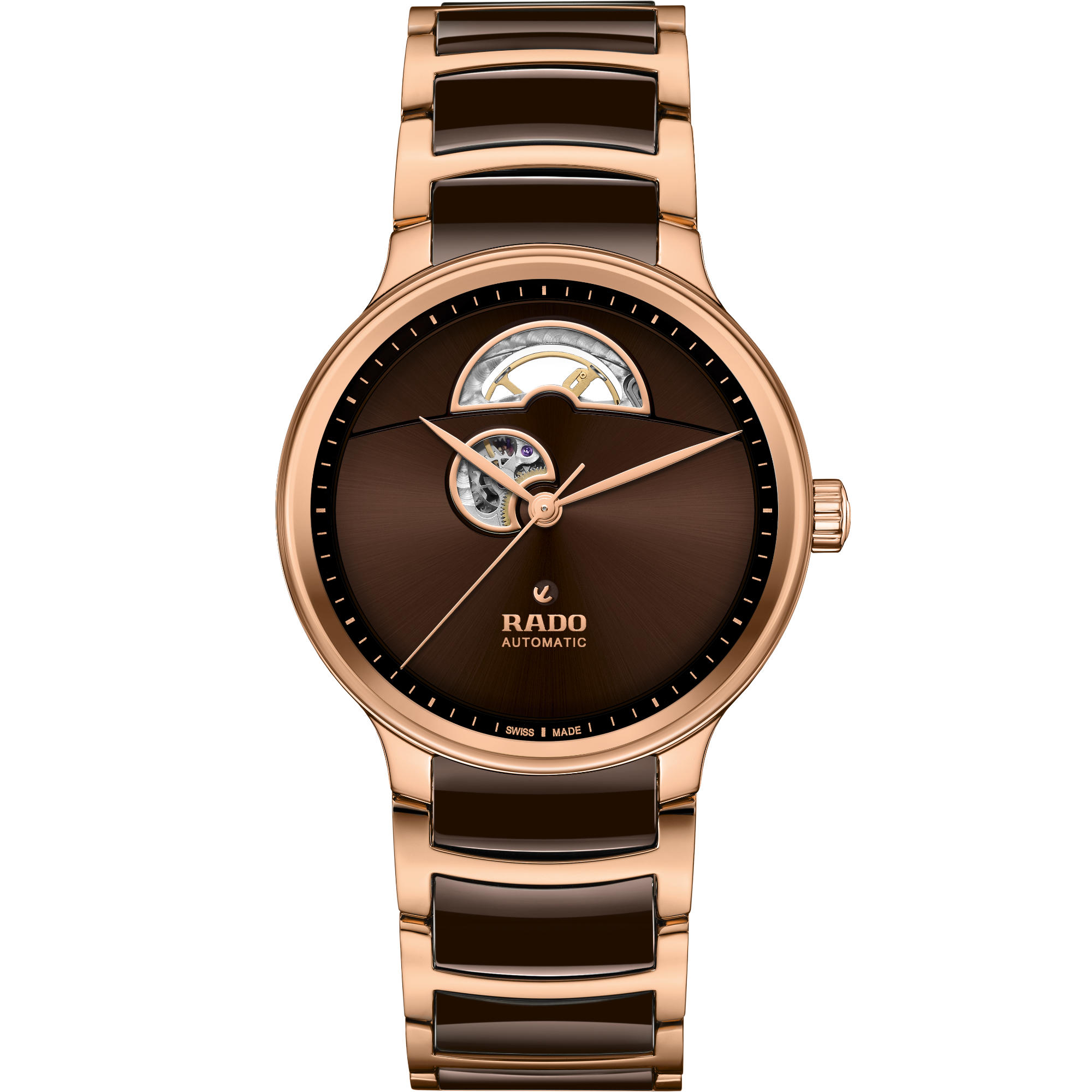 Ref. R30013302 - Entdecken Sie mit der Rado Centrix Automatic Open Heart das perfekte Gleichgewicht zwischen Innovation und Ästhetik. Im Herzen dieses Meisterwerks tickt das Rado Automatikwerk R734, das für makellose Präzision und Zuverlässigkeit sorgt. Mit einer beeindruckenden Gangreserve von 80 Stunden garantiert diese Uhr eine kontinuierliche Leistung. Die Präzision dieser Uhr wird durch die antimagnetische Nivachron™ Spiralfeder und ihre Einstellung in 5 Lagen weiter erhöht. Mit ihrem eleganten 39,5 mm grossen Gehäuse aus poliertem roségoldfarbenem Edelstahl steht die Centrix Automatic Open Heart für minutiöse Handwerkskunst. Der Gehäuseboden aus poliertem Edelstahl ist mit einem Saphirglas ausgestattet und bietet einen Blick auf das faszinierende Innenleben der Uhr.