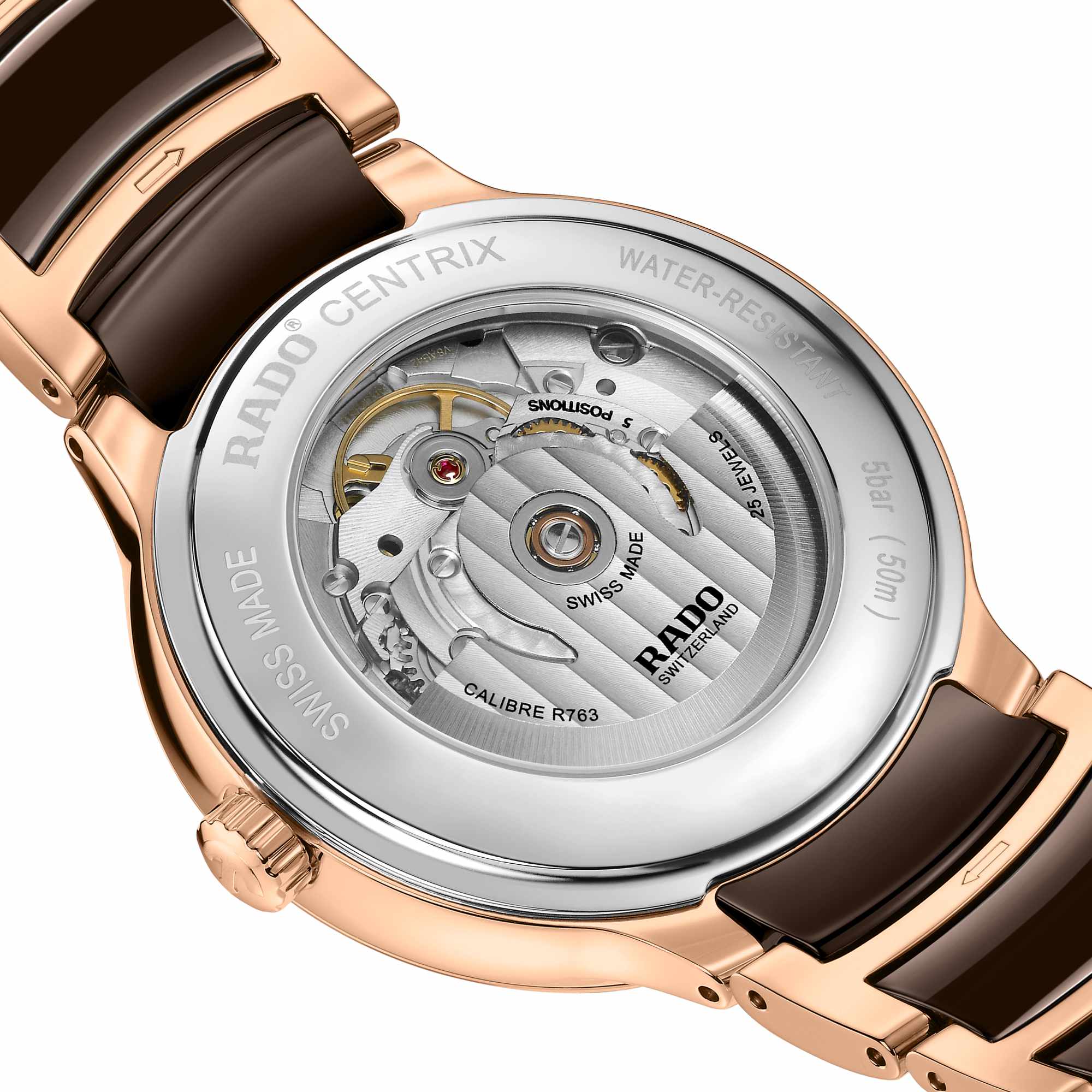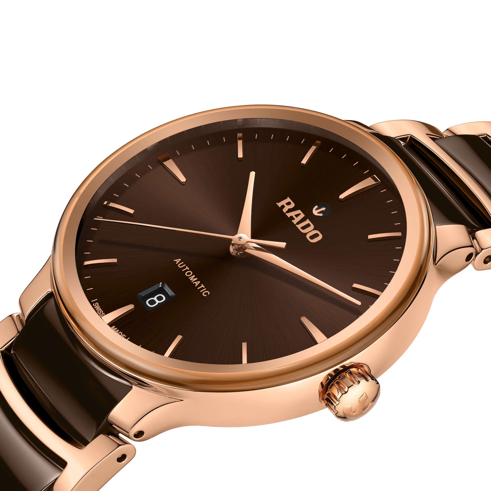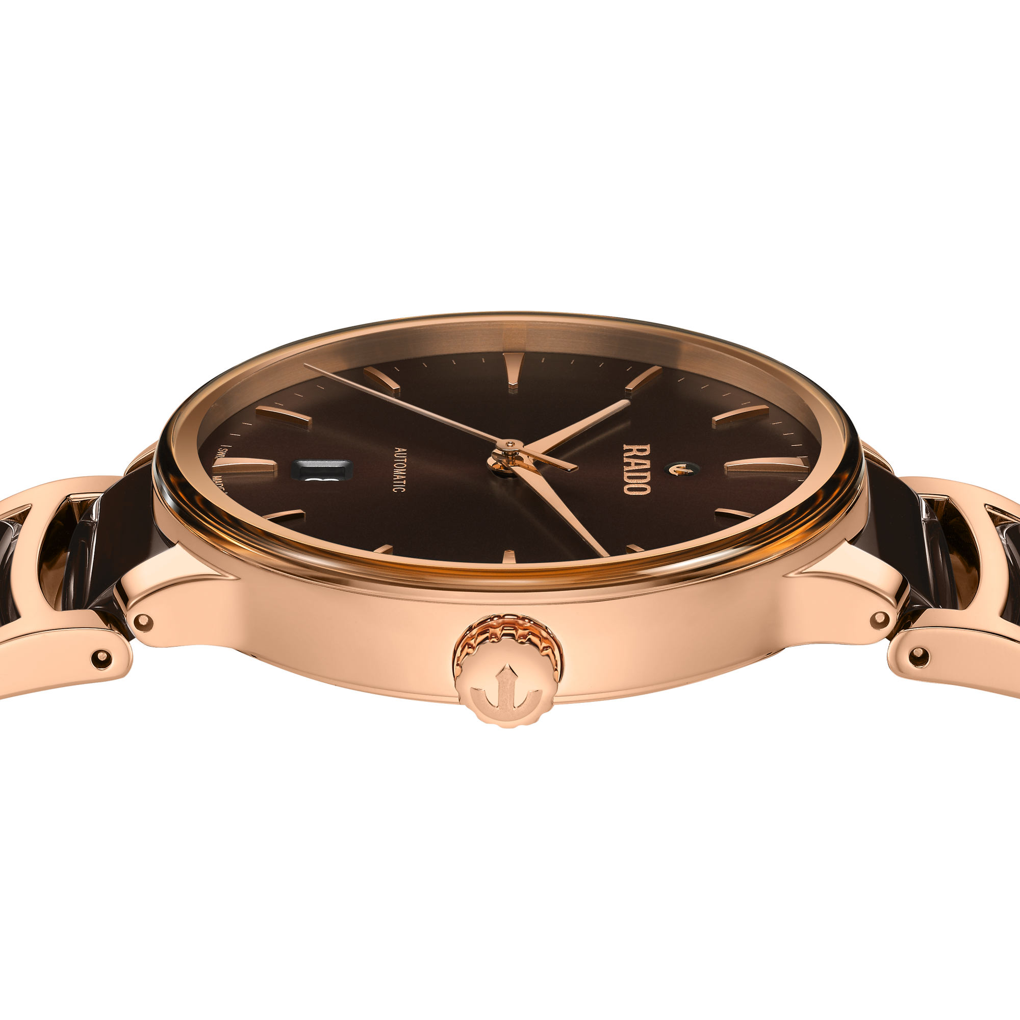 Ref. R30017302 - Die klassische Centrix Automatic wurde nicht nur technisch, sondern auch ästhetisch überarbeitet. Beim neuen Modell reicht das abgerundete Saphirglas bis hin zum Rand. Außerdem geht das gewölbte Gehäuse nahtlos in den geschwungenen Kristallrand über. Die Gesamtoptik dieses ikonischen Zeitmessers wird durch überarbeitete Bandanstöße am Gehäuse und ein Armband aus poliertem roségoldfarbenen Edelstahl mit PVD-Beschichtung und Mittelgliedern aus brauner Hightech-Keramik abgerundet.