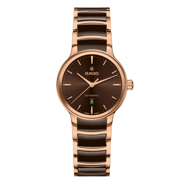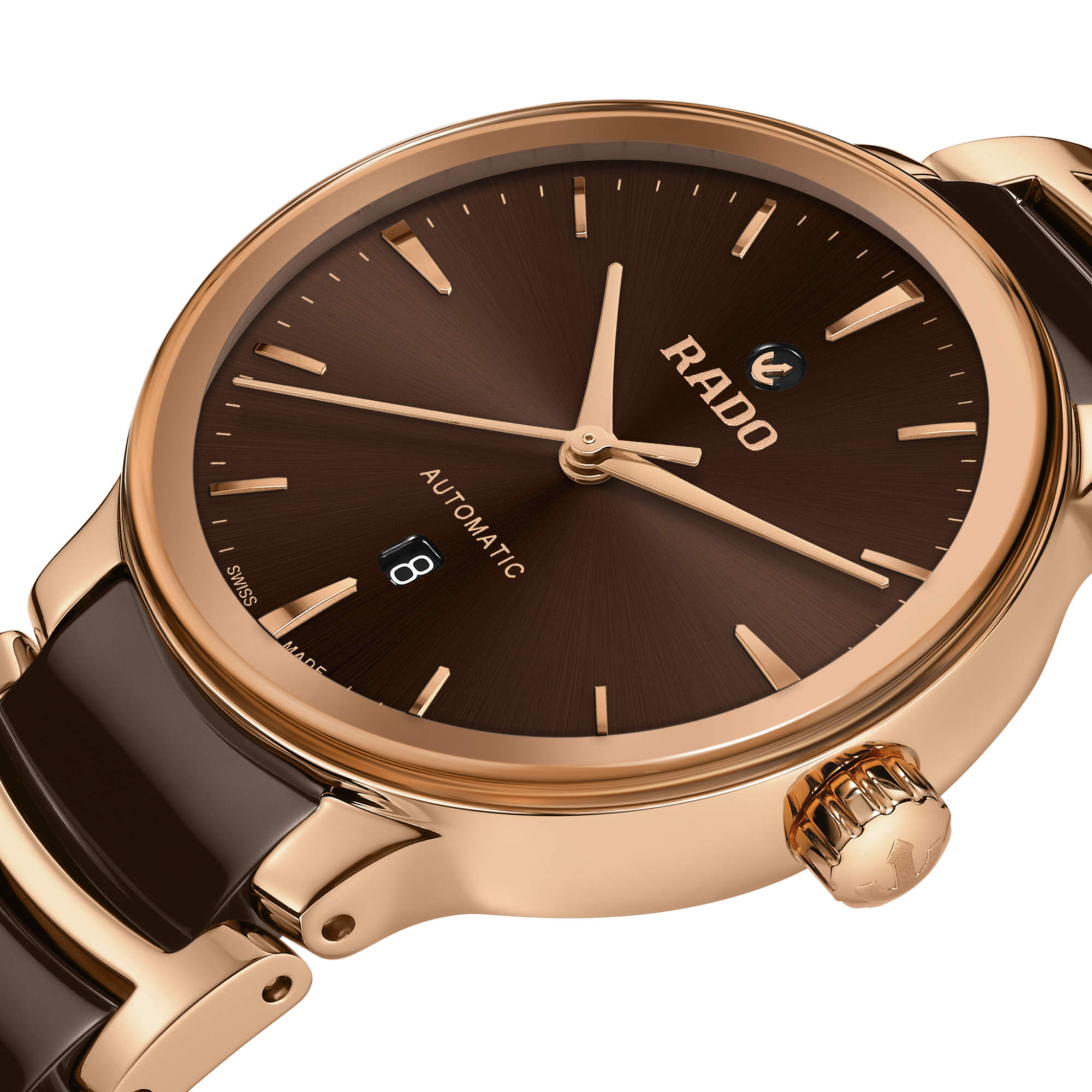 Ref. R30019302 - Die klassische Centrix Automatic wurde nicht nur technisch, sondern auch ästhetisch überarbeitet. Beim neuen Modell reicht das abgerundete Saphirglas bis hin zum Rand. Außerdem geht das gewölbte Gehäuse nahtlos in den geschwungenen Kristallrand über. Die Gesamtoptik dieses ikonischen Zeitmessers wird durch überarbeitete Bandanstöße am Gehäuse und ein Armband aus poliertem roségoldfarbenen Edelstahl mit PVD-Beschichtung und Mittelgliedern aus brauner Hightech-Keramik abgerundet.