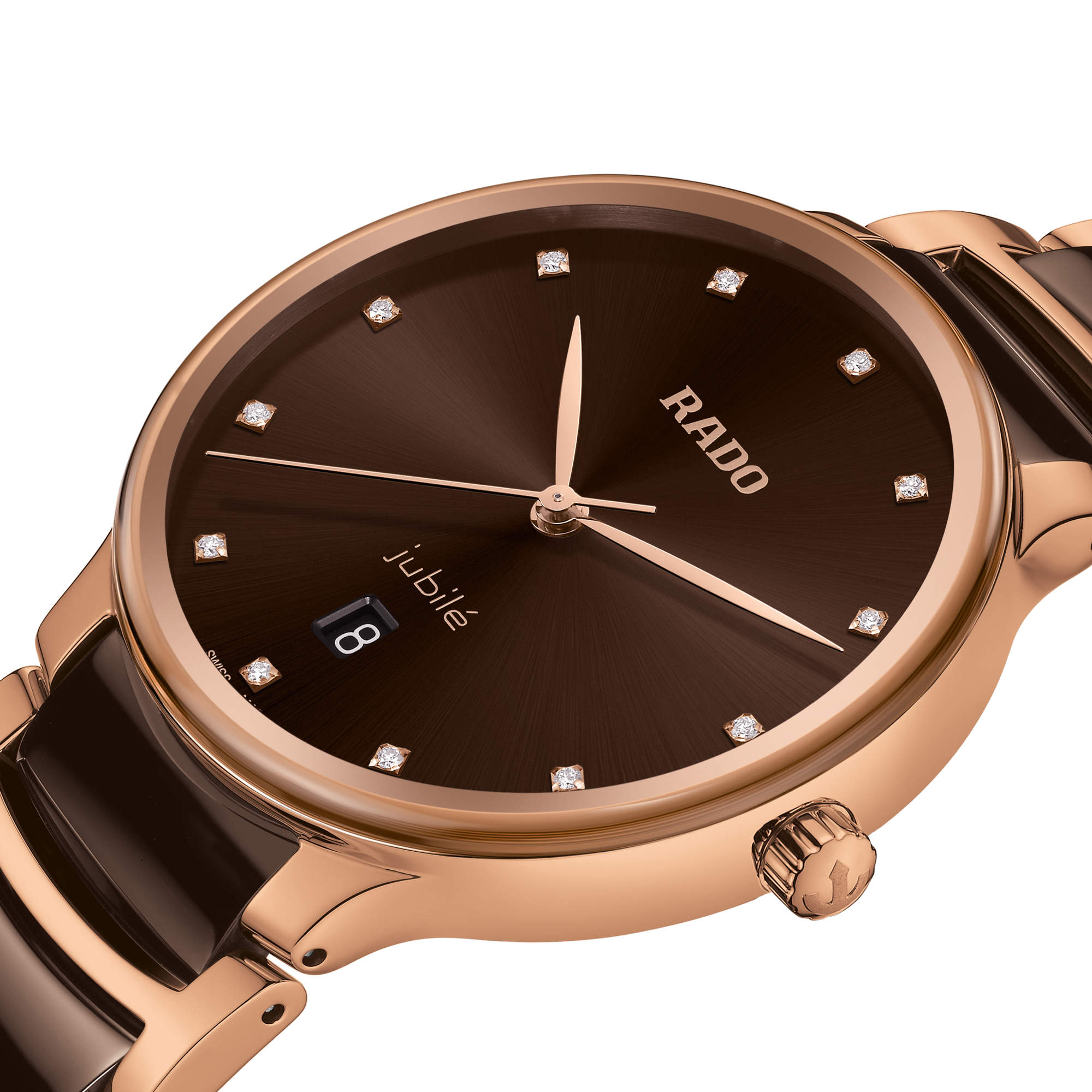 Das braune Zifferblatt mit Sonnenschliff und 12 Diamanten kommt durch das aufgedruckte Jubilé-Logo noch besser zur Geltung und ist perfekt auf die roségoldfarbenen Zeiger abgestimmt. Dank der PreciDrive- und HeavyDrive-Technologie im R073 Quarzwerk zeichnet sich die Uhr durch eine grössere Genauigkeit und Stossfestigkeit aus. Die Uhr ist bis zu einer Tiefe von 50 m wasserdicht.
