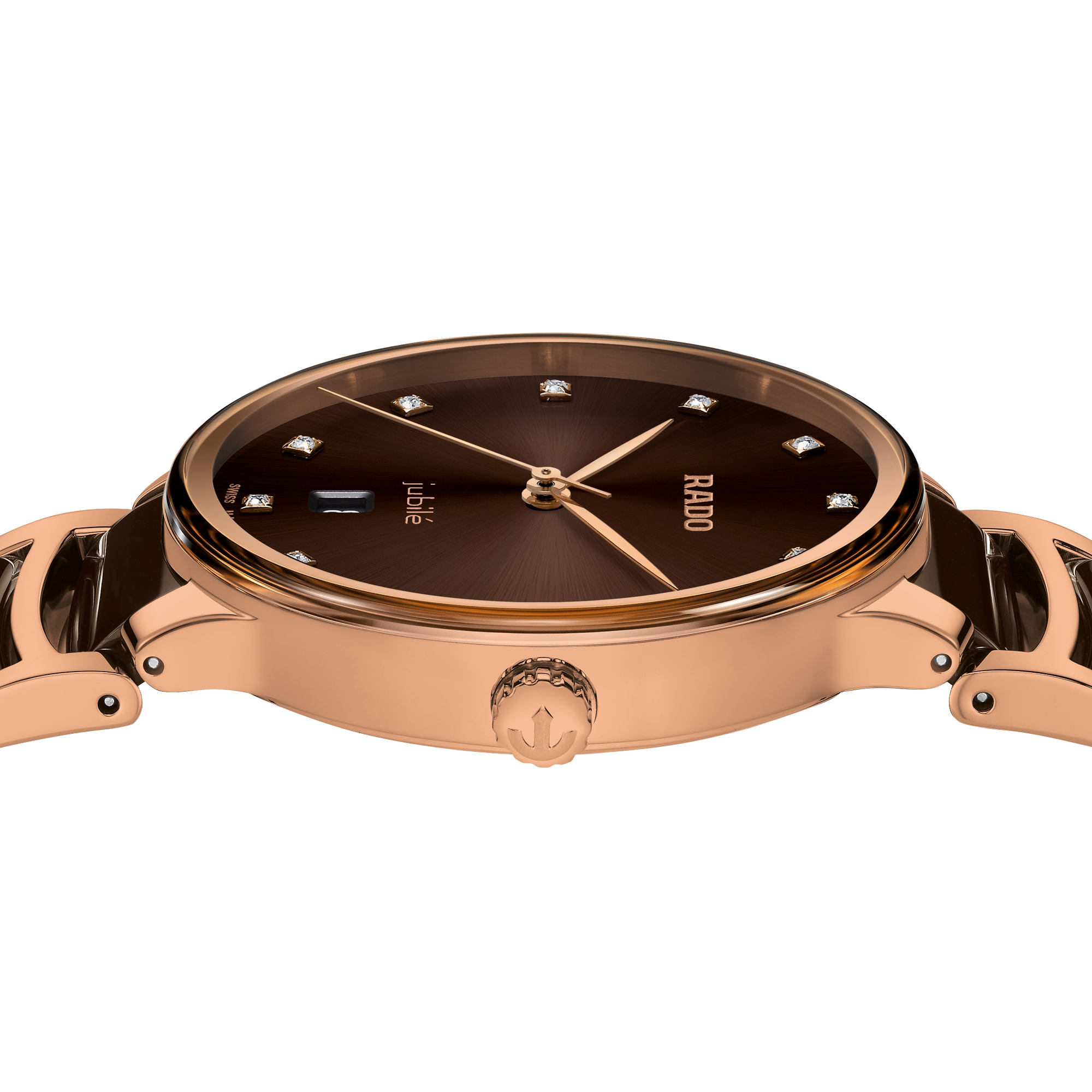 Ref. R30023732 - Die klassische Centrix Quartz Diamonds wurde nicht nur technisch, sondern auch ästhetisch überarbeitet. Beim neuen Modell reicht das gewölbte Saphirglas bis hin zum Rand und scheint nahtlos in das sanft gerundete Gehäuse überzugehen. Die Gesamtoptik dieses ikonischen Zeitmessers wird durch überarbeitete Bandanstösse am Gehäuse und ein Armband aus poliertem roségoldfarbenem Edelstahl mit PVD-Beschichtung und Mittelgliedern aus brauner Hightech-Keramik abgerundet.