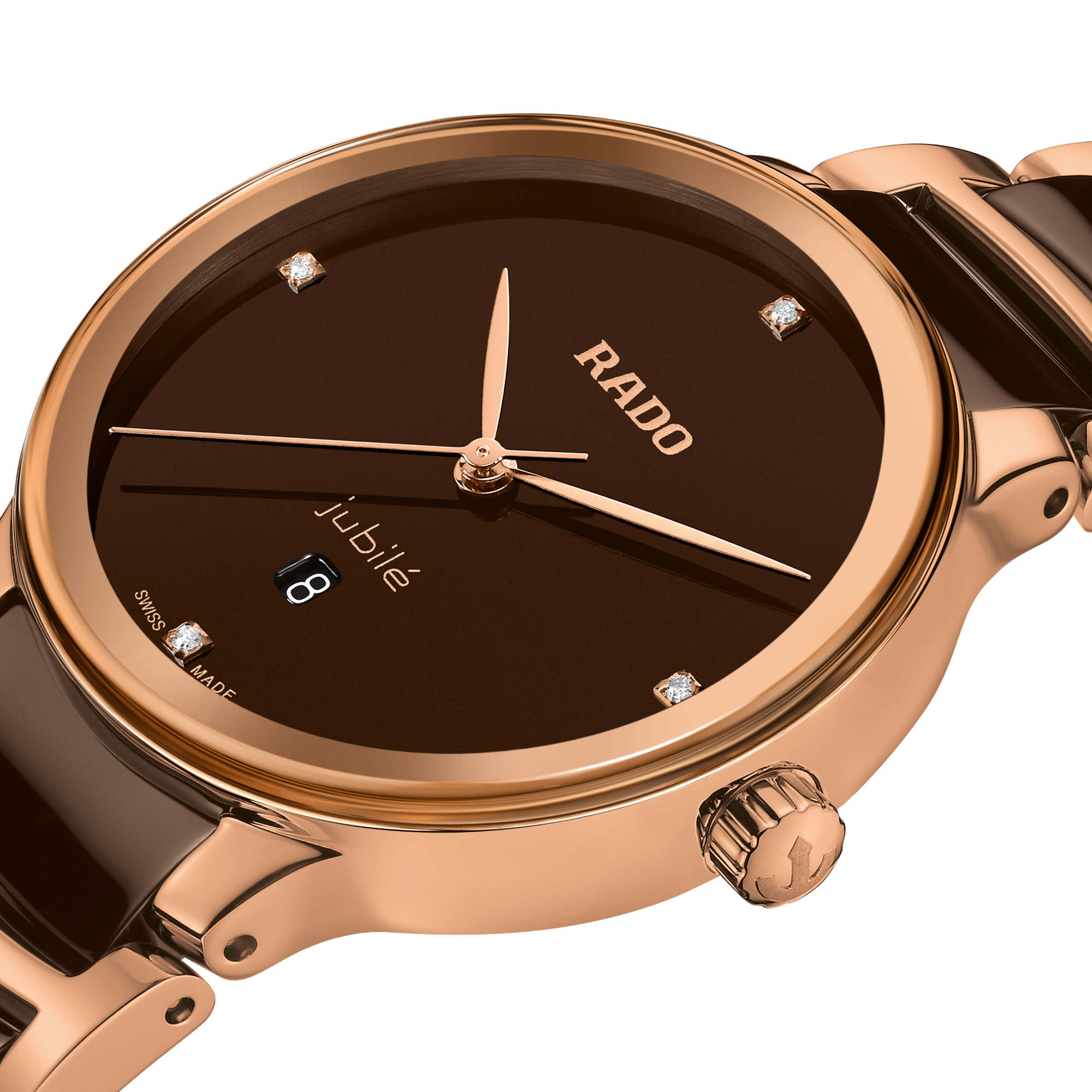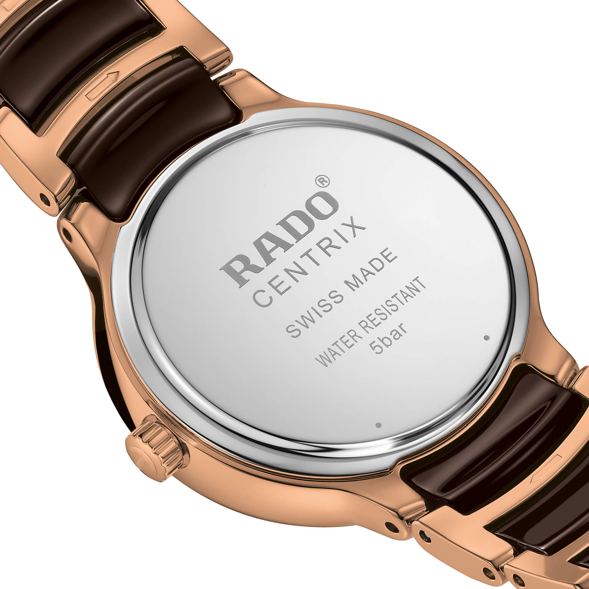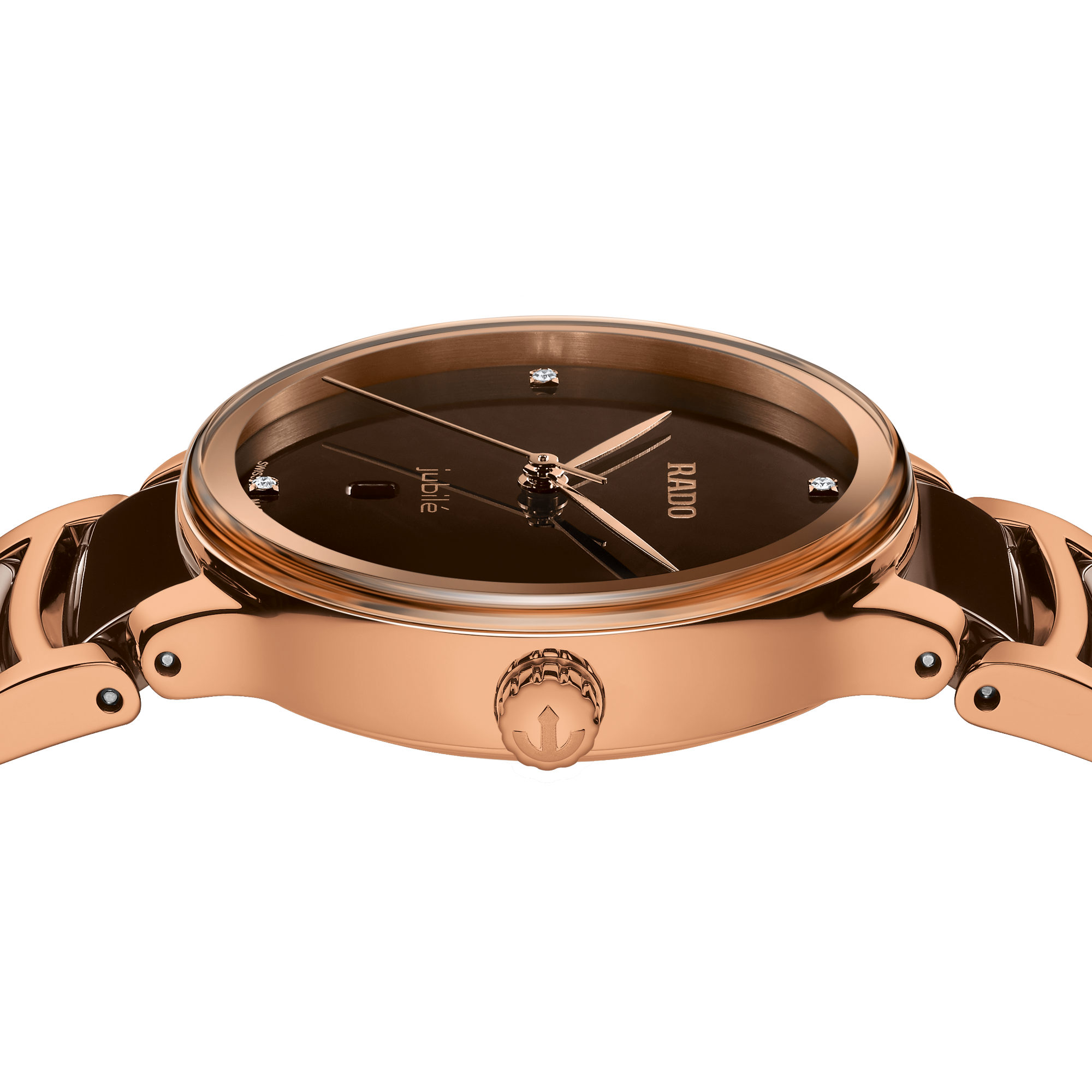 Ref. R30024712 - Die klassische Centrix Quartz wurde nicht nur technisch, sondern auch ästhetisch überarbeitet. Beim neuen Modell reicht das gewölbte Saphirglas bis hin zum Rand und scheint nahtlos in das sanft gerundete Gehäuse überzugehen. Die Gesamtoptik dieses ikonischen Zeitmessers wird durch überarbeitete Bandanstösse am Gehäuse und ein Armband aus poliertem roségoldfarbenem Edelstahl mit PVD-Beschichtung und Mittelgliedern aus brauner Hightech-Keramik abgerundet.
