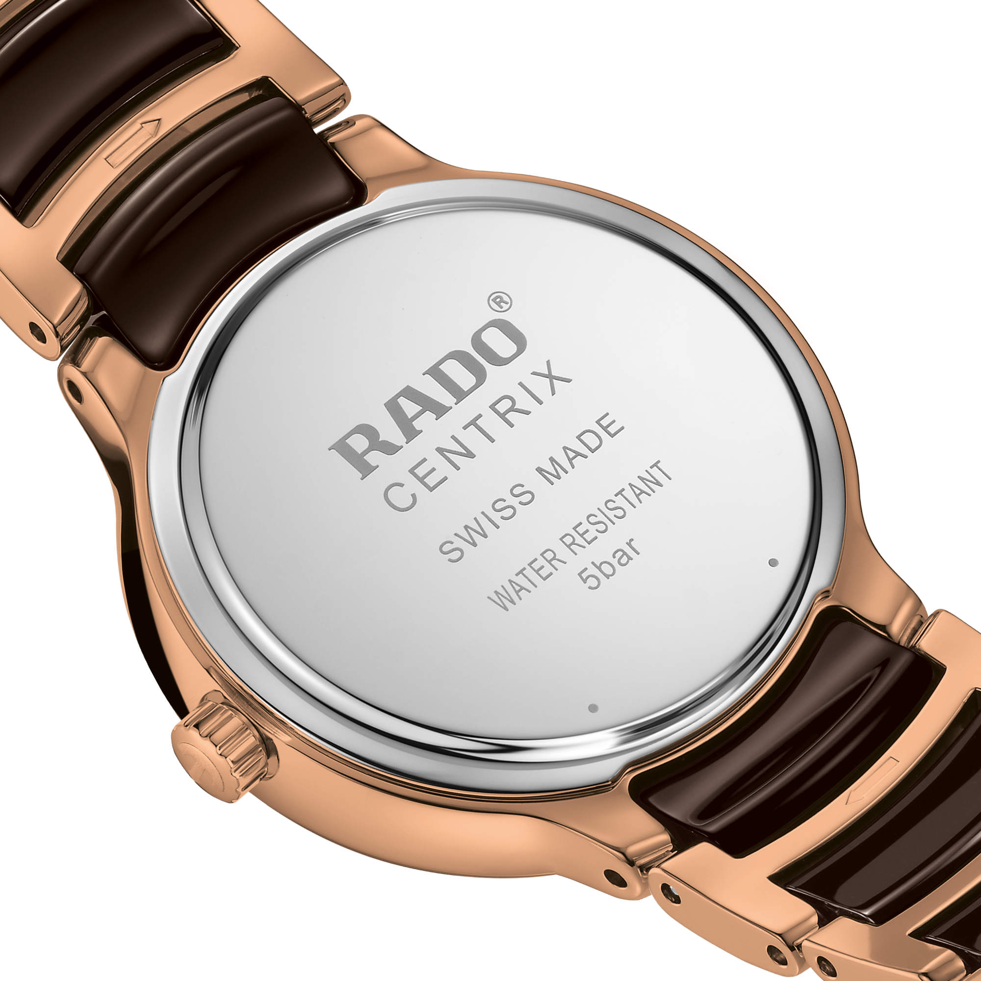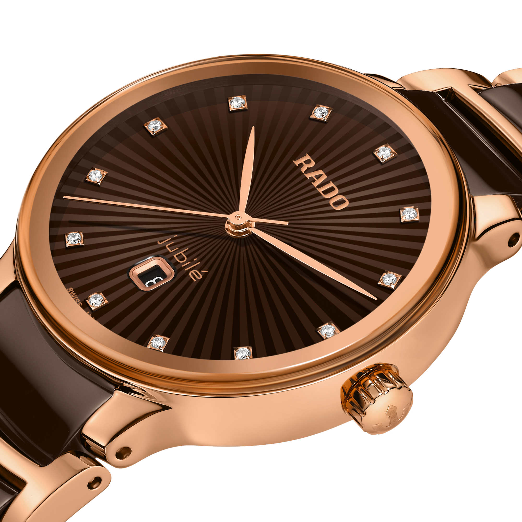 Ref. R30024732 - Die klassische Centrix Quartz Diamonds wurde nicht nur technisch, sondern auch ästhetisch überarbeitet. Beim neuen Modell reicht das gewölbte Saphirglas bis hin zum Rand und scheint nahtlos in das sanft gerundete Gehäuse überzugehen. Die Gesamtoptik dieses ikonischen Zeitmessers wird durch überarbeitete Bandanstösse am Gehäuse und ein Armband aus poliertem roségoldfarbenem Edelstahl mit PVD-Beschichtung und Mittelgliedern aus brauner Hightech-Keramik abgerundet.